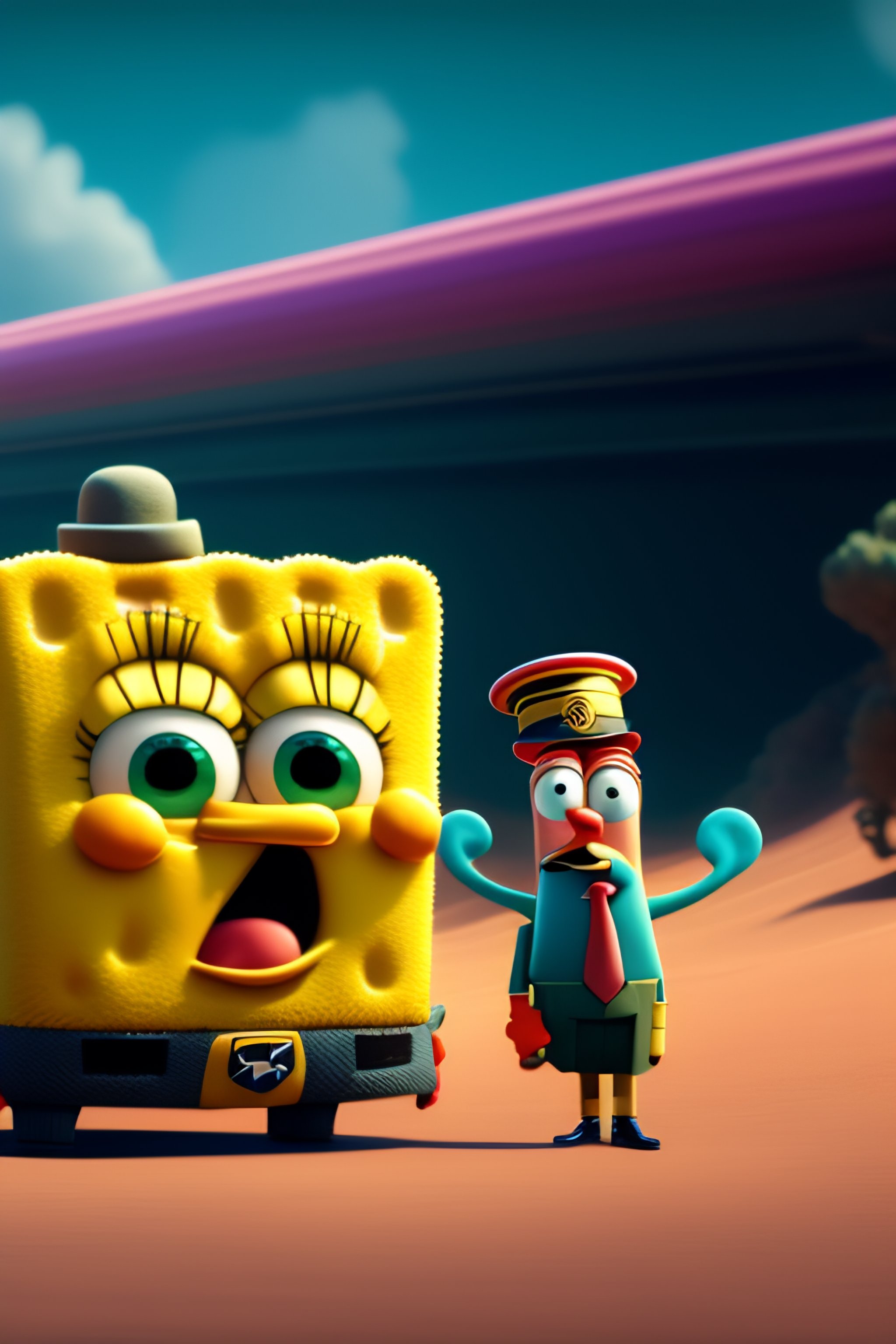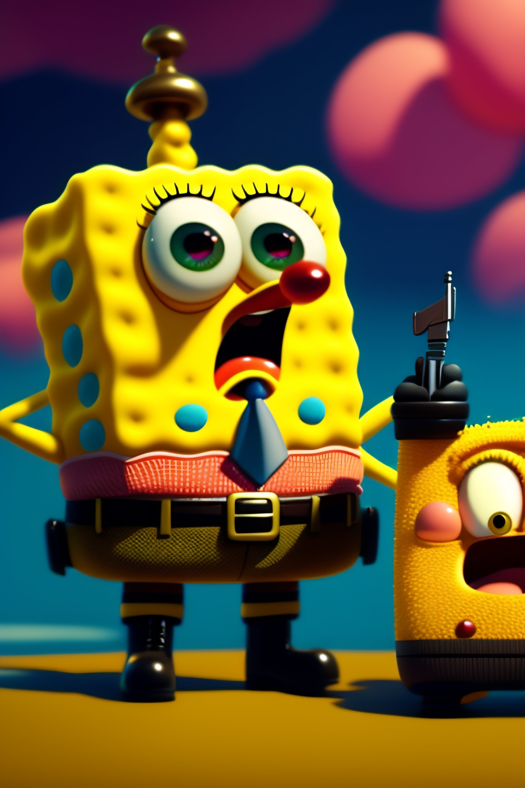 Spongebob pointing a gun at patrick