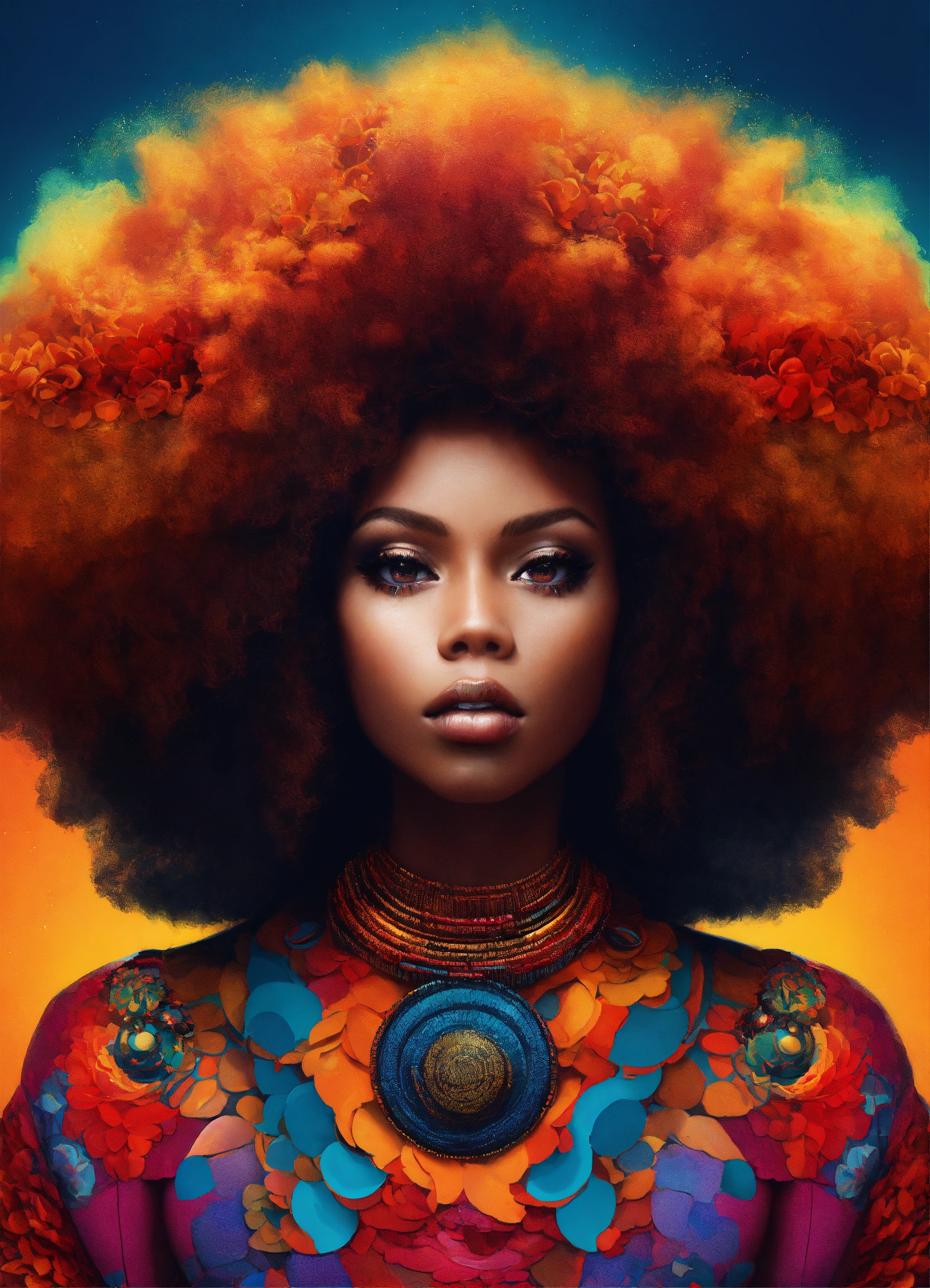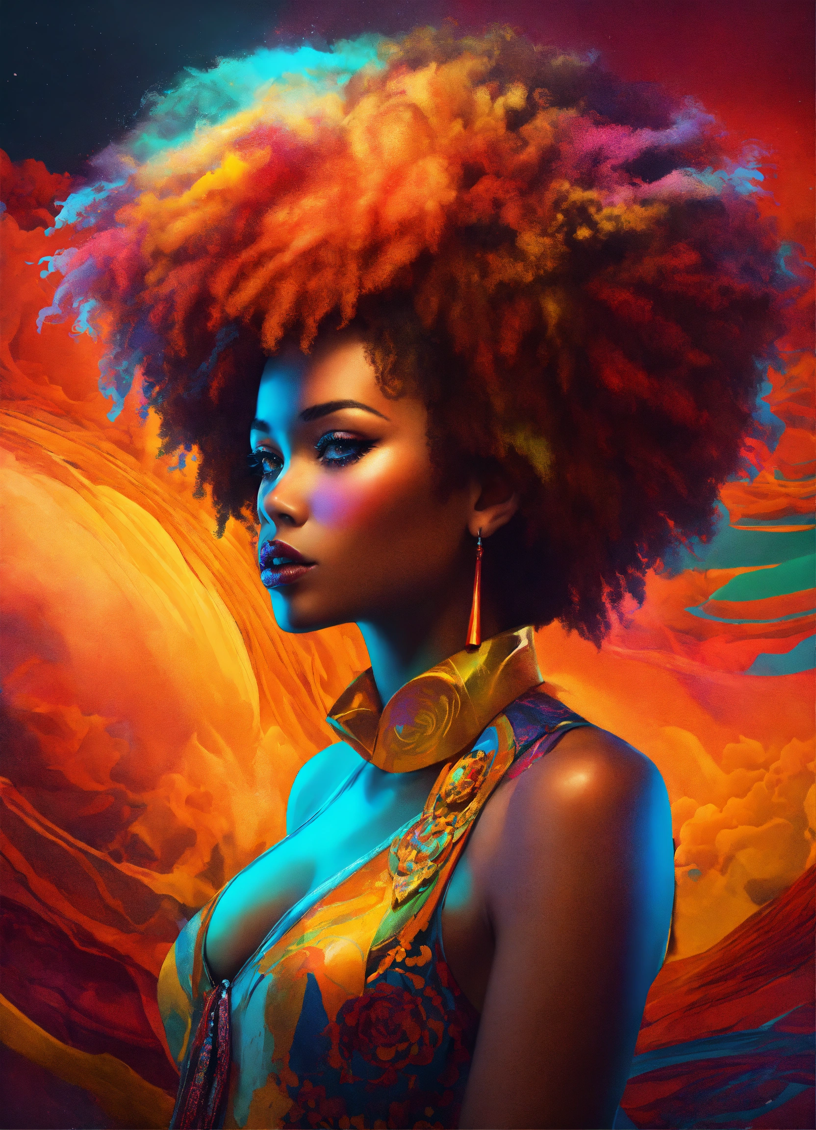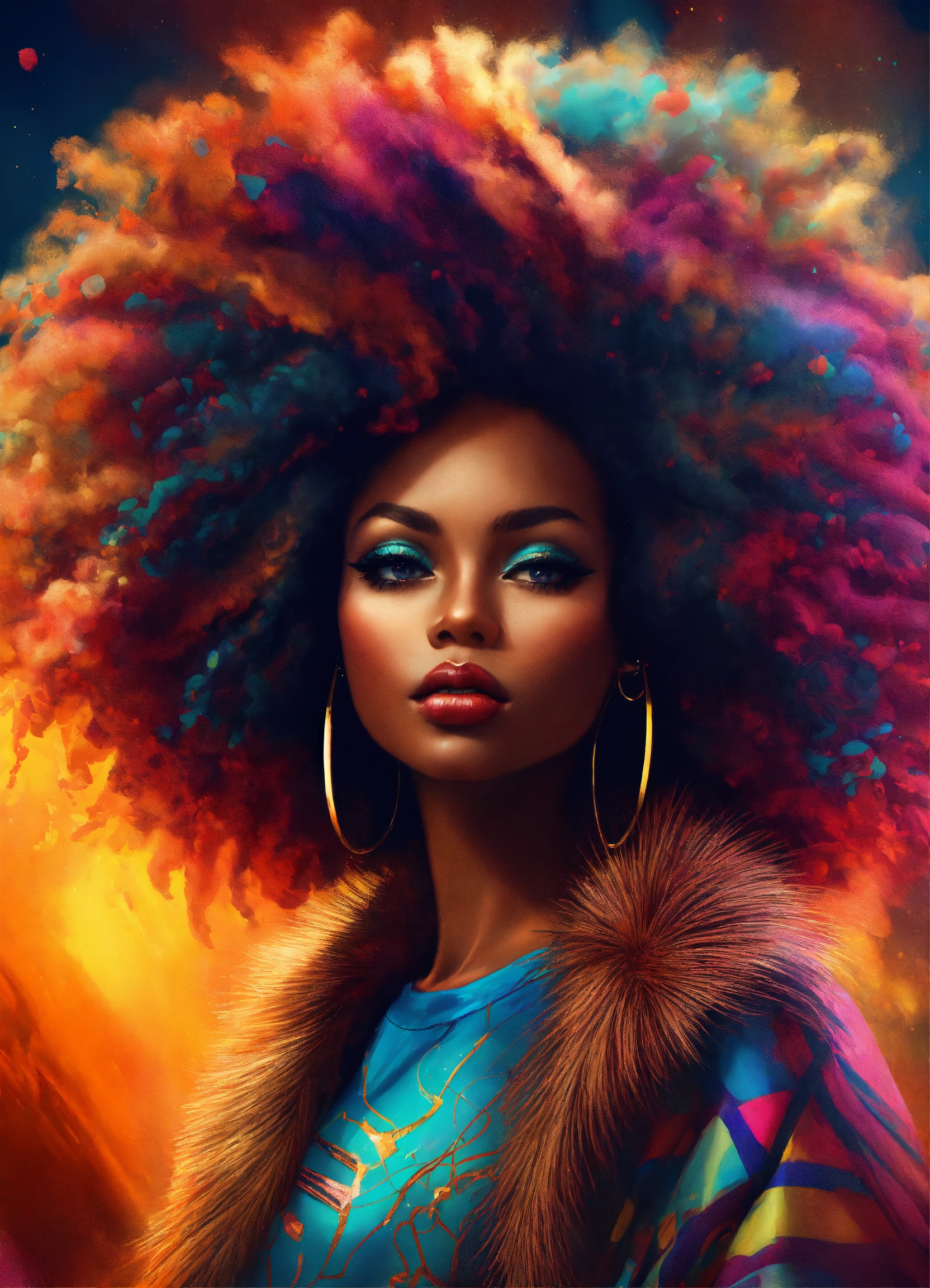 An abstract illustration of a beautiful woman with colorful big hair, in the style of afrofuturism, caras ionut, chris dyer, uhd image, afro-colombian themes, tony orrico, dark amber, with fur coat 💕💄❤️💜 --v 5.2