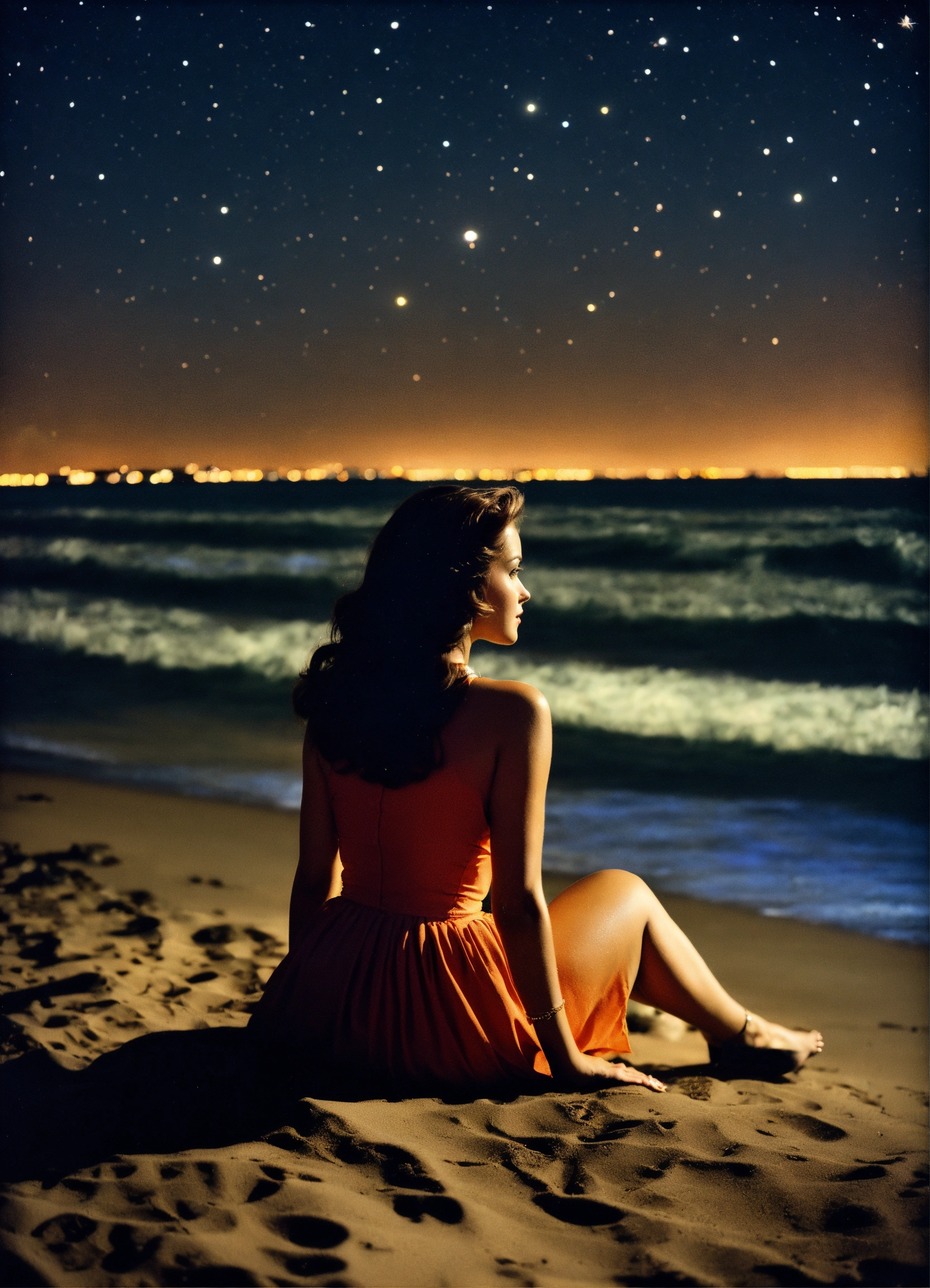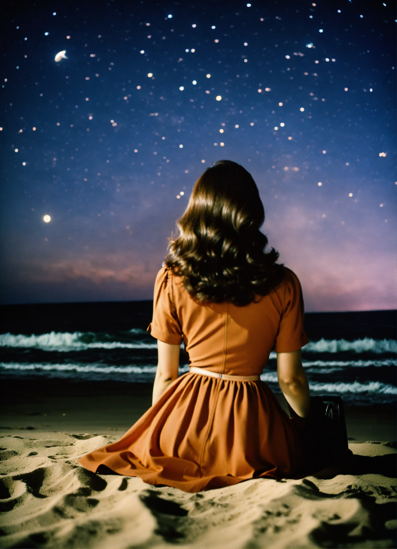 A vintage photograph of a woman with long brown hair 1950s sitting on the beach looking up at the night sky, rear view