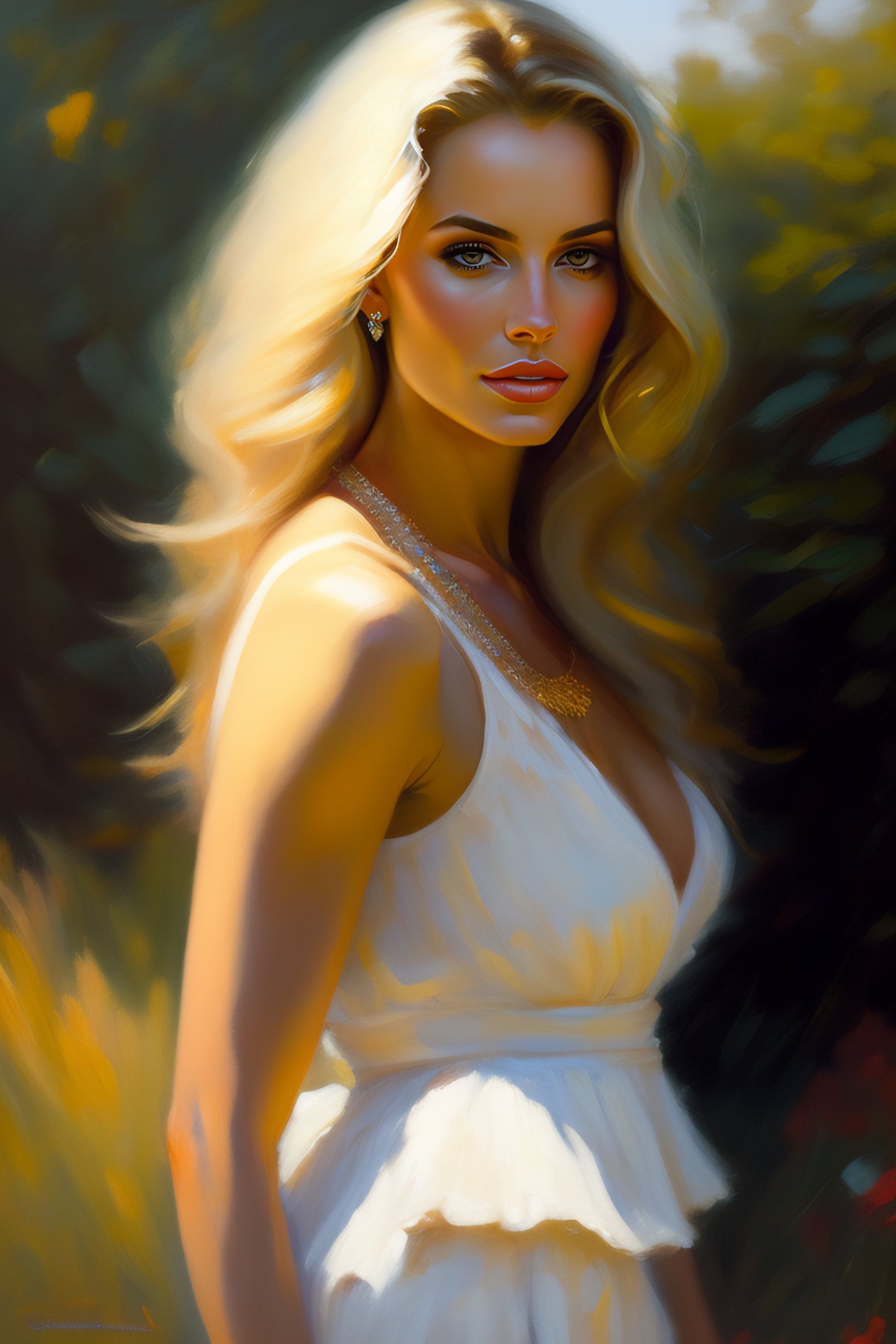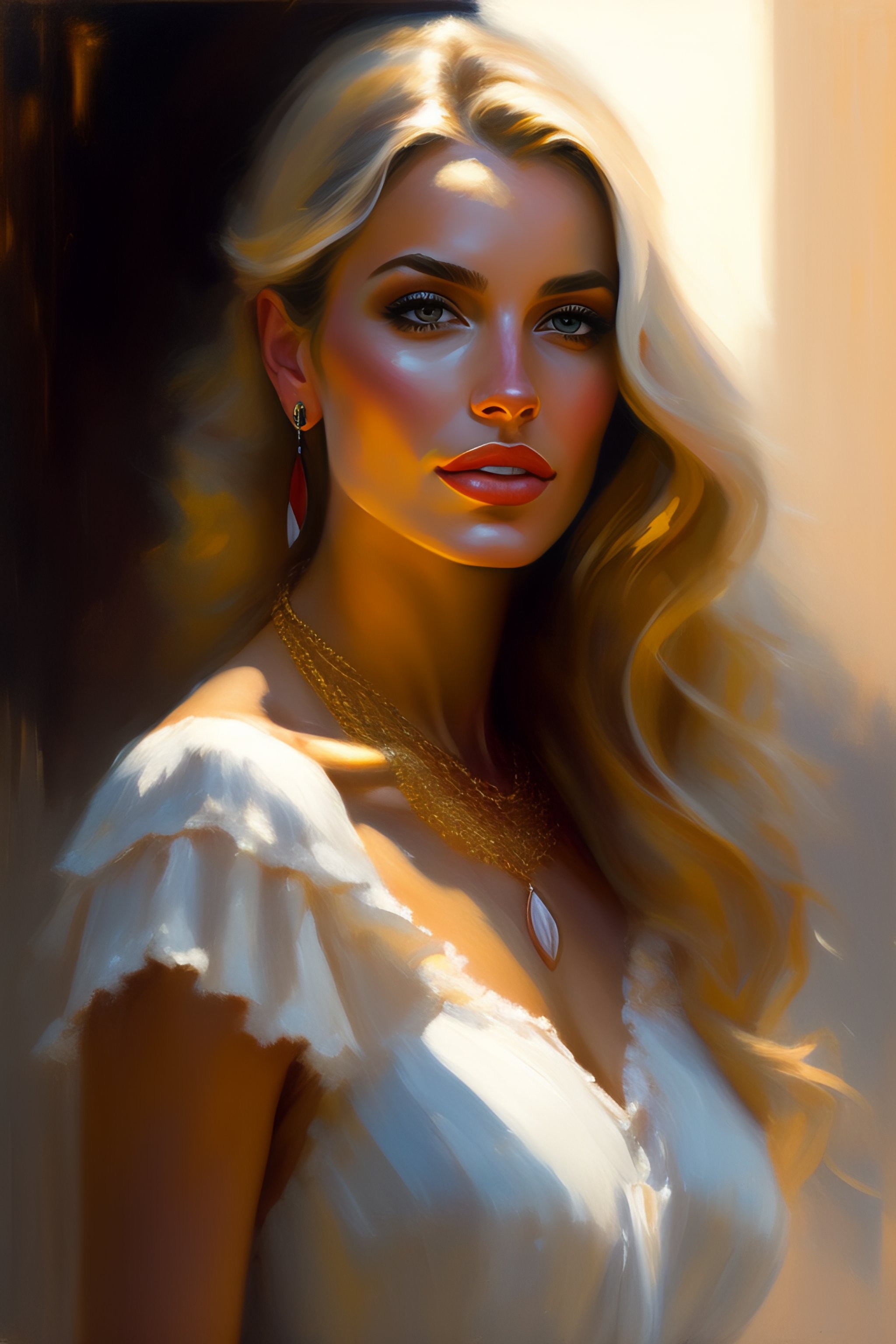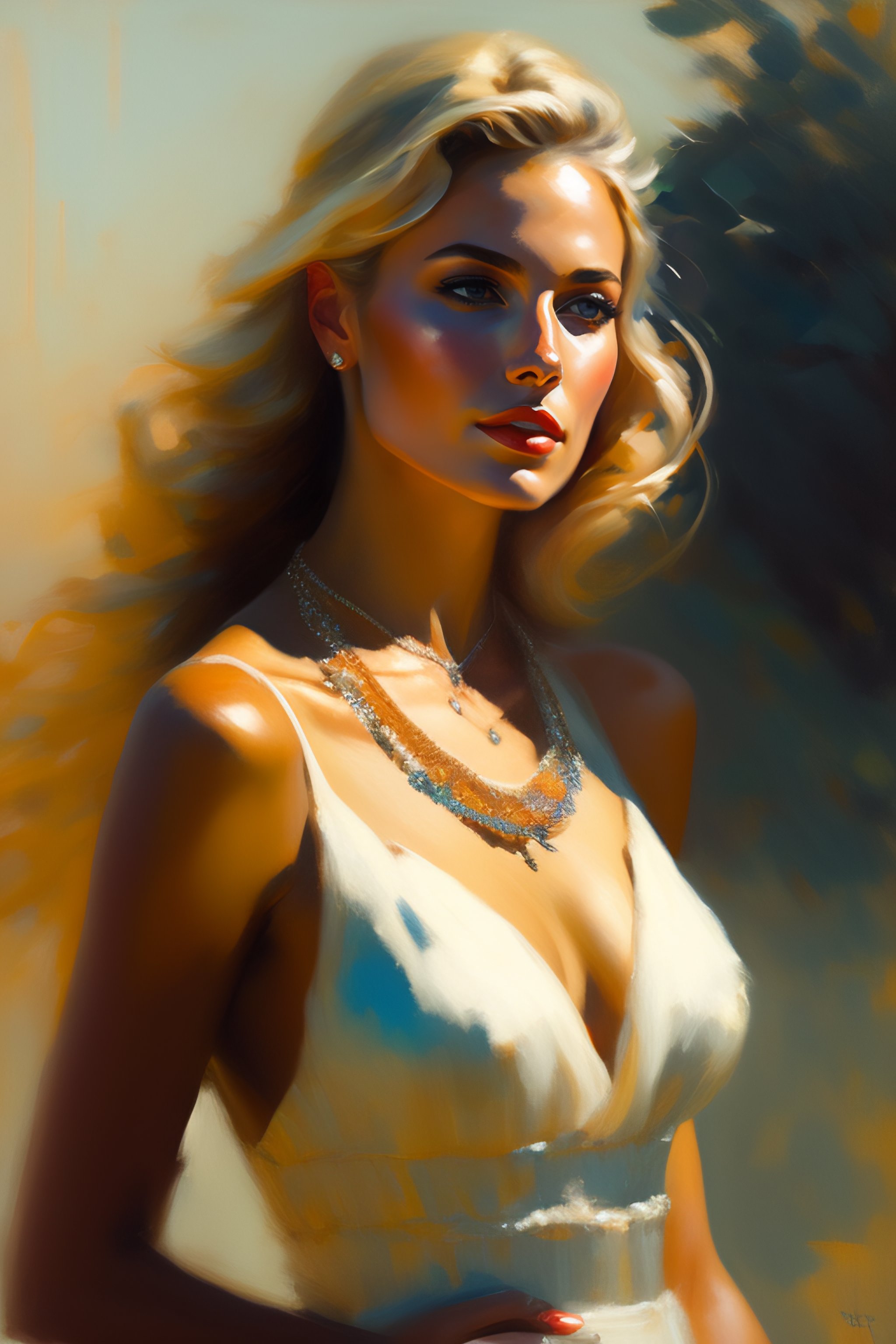 Portrait painting of a beautiful blonde woman wearing necklace highwaist by richard schmid, alla prima, loose gestural painterly, jeremy mann, greg manchess