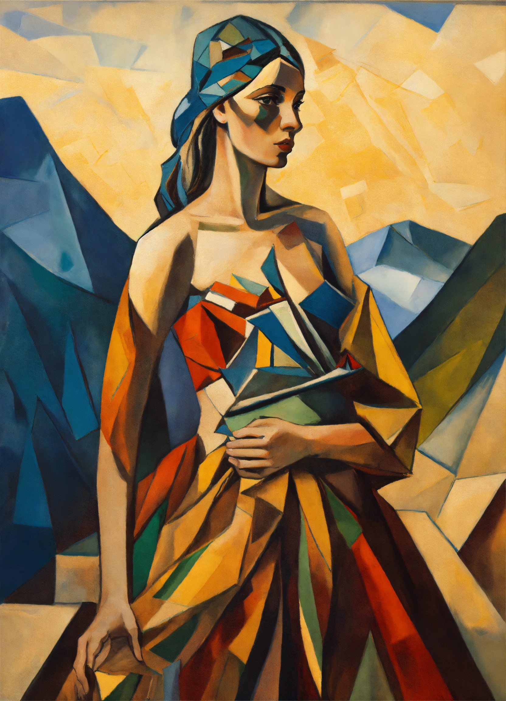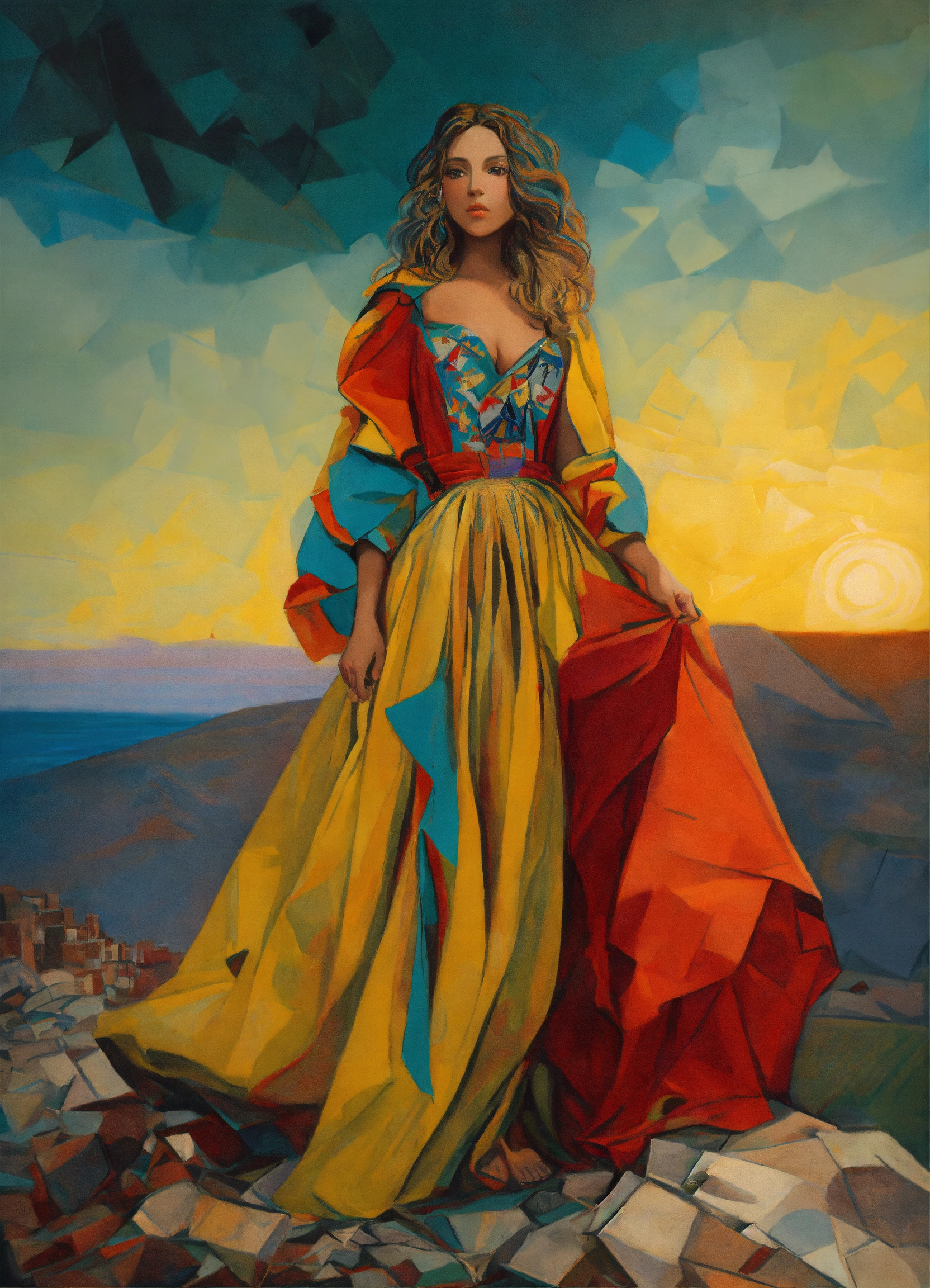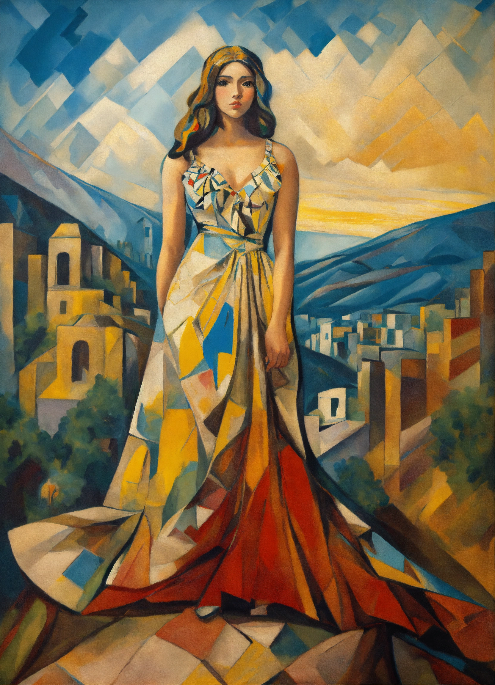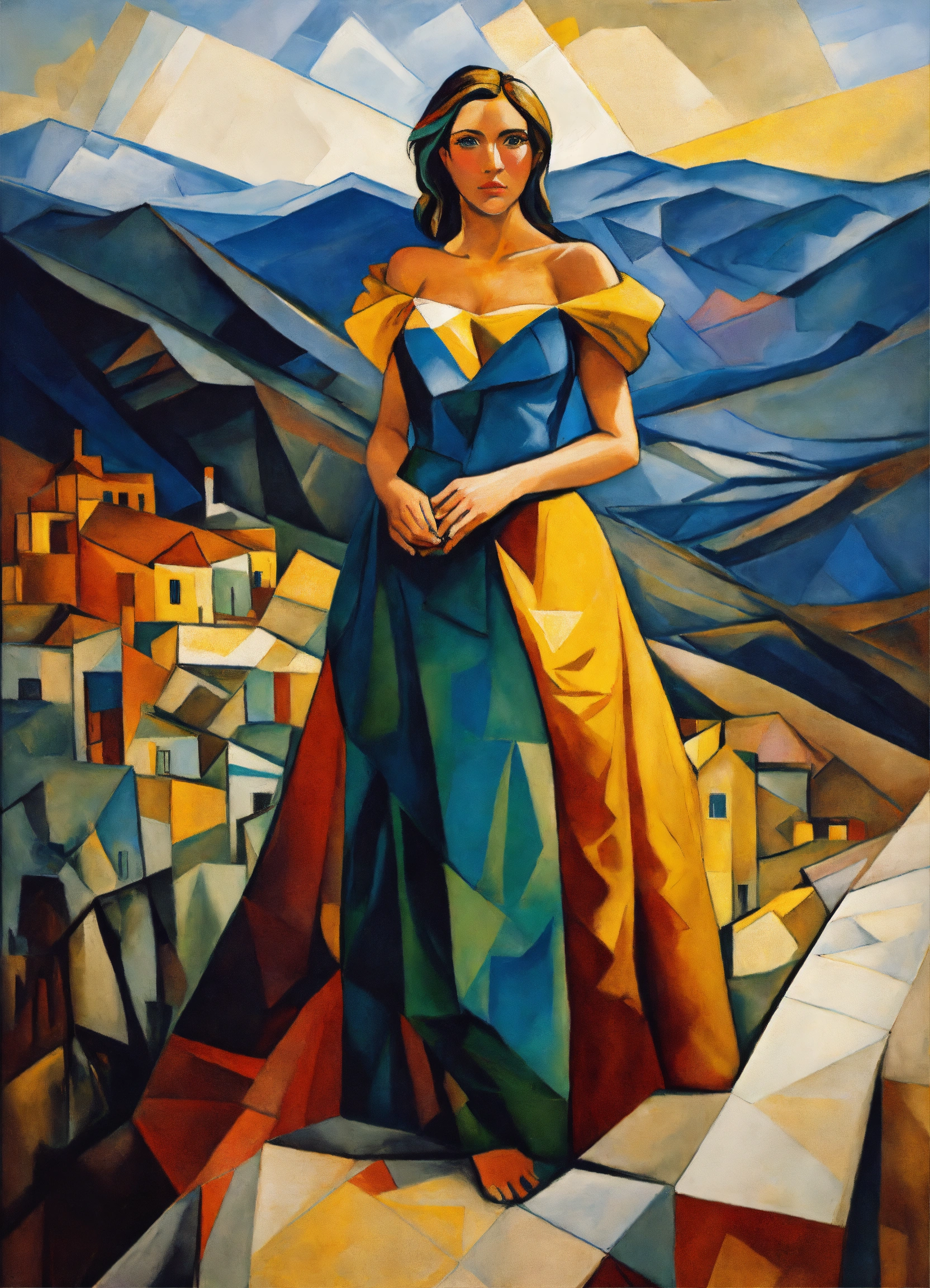 A breathtaking pablo picasso artwork of a gorgeous homeless woman standing on a mountaintop in a long flowing ballgown, with perfect hands, beautiful face, detailed eyes.