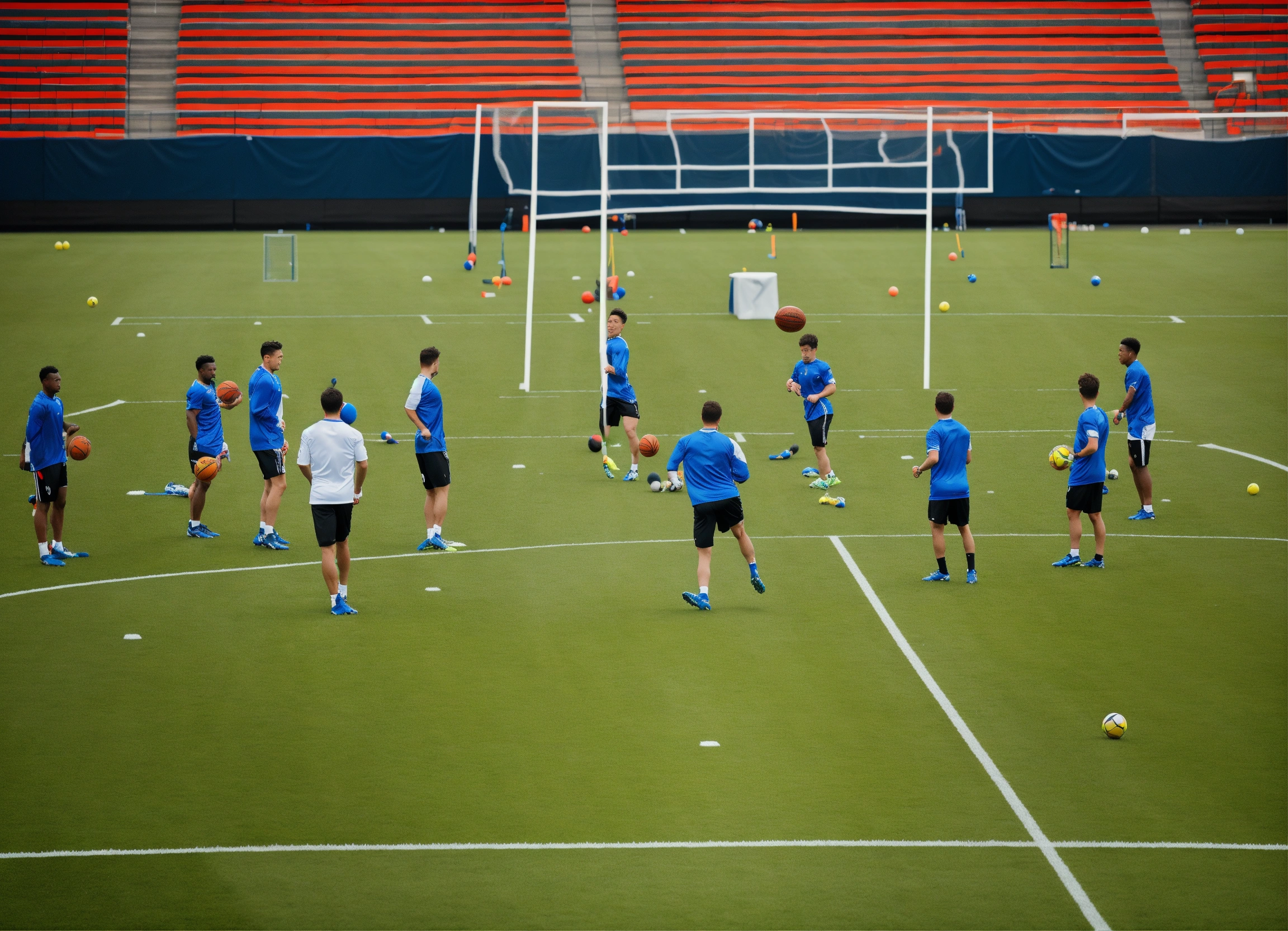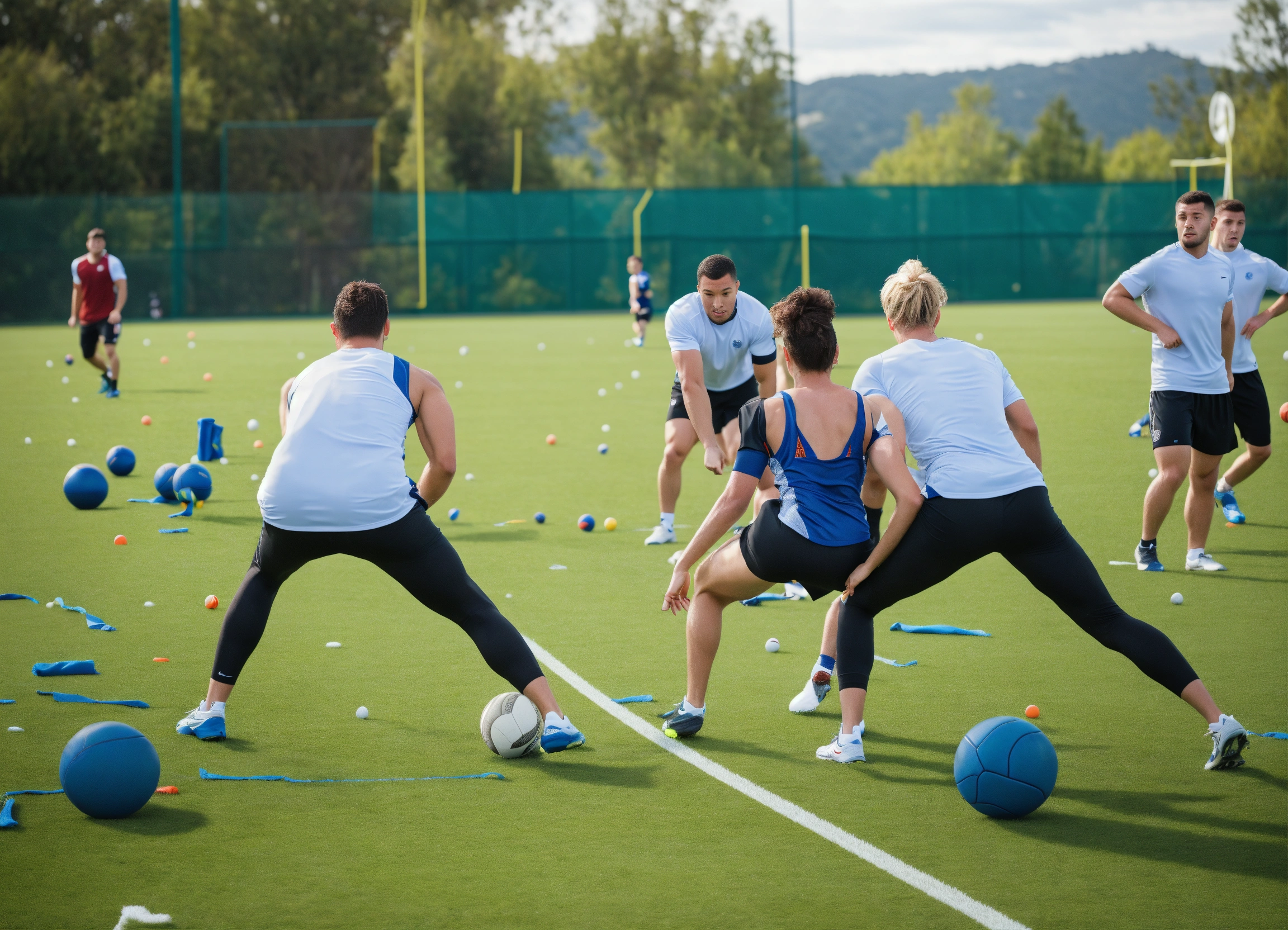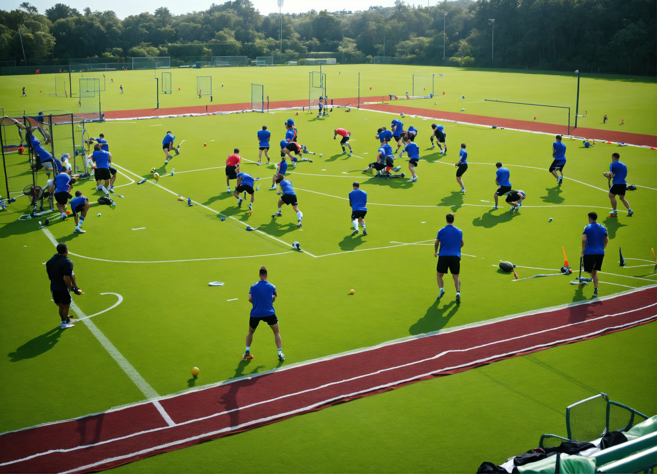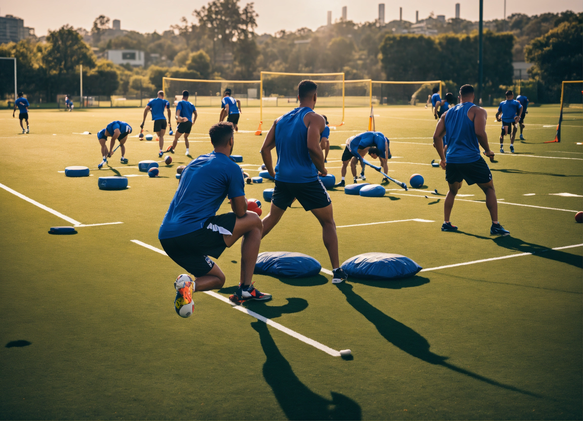 A sports team training hard on a sports field