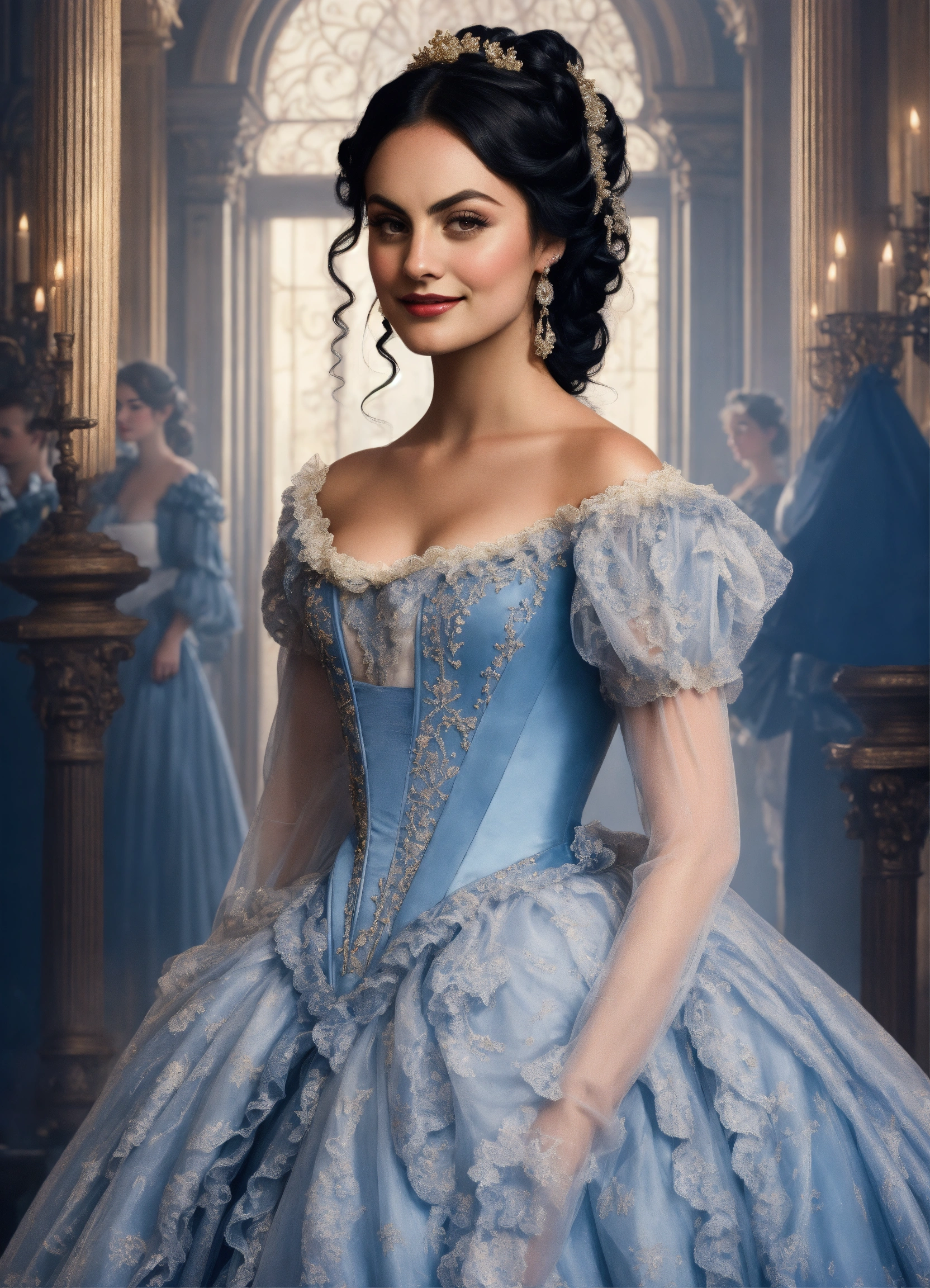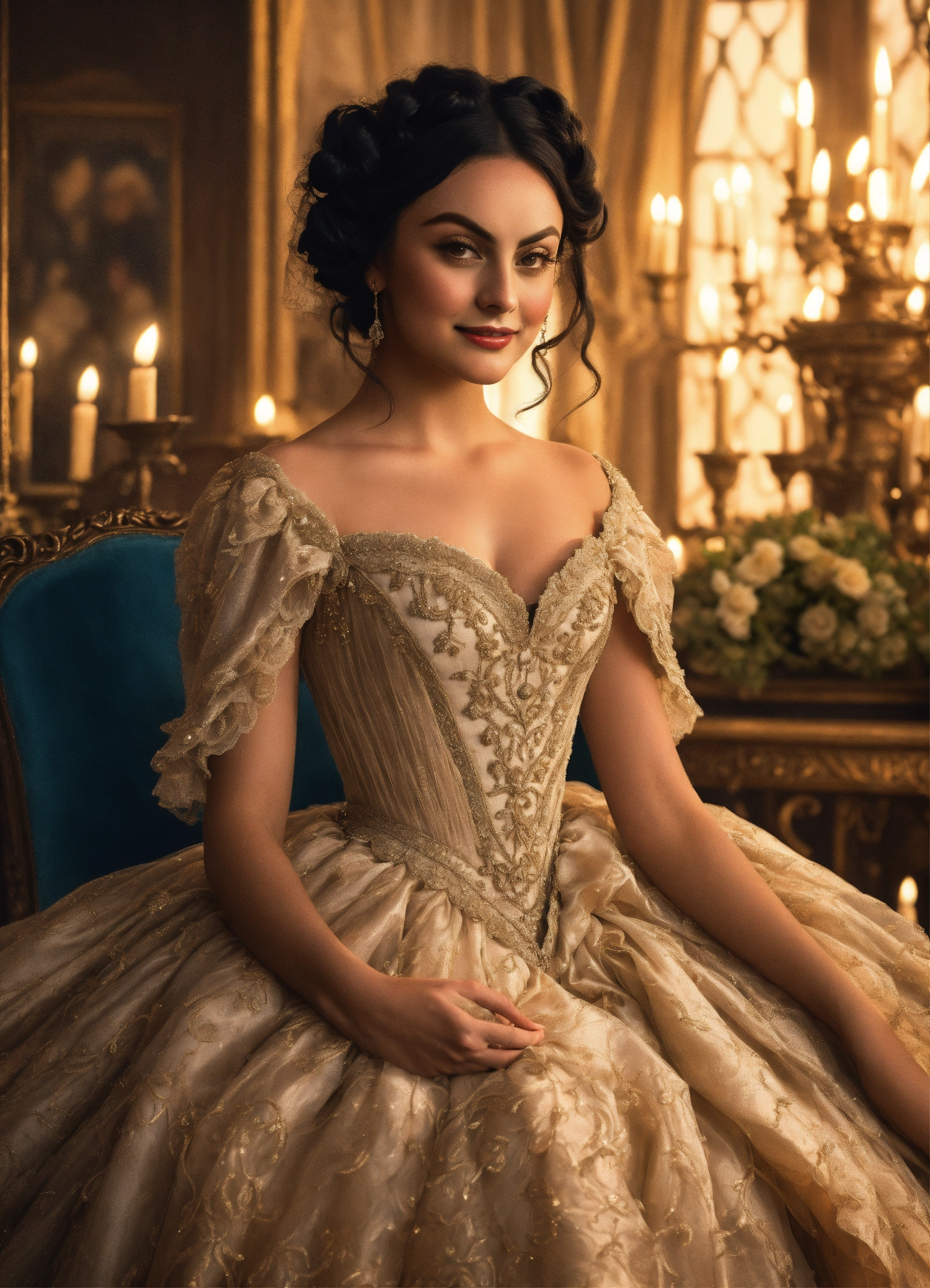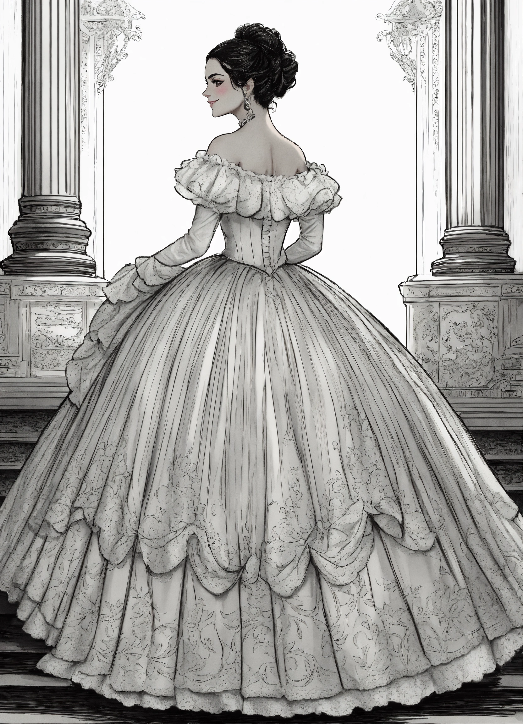 "camila mendes as christine daae", victorian opera star, huge curly updo, smirk, big elaborate opera gown, bustle, petticoats, historical, fantasy art, line art