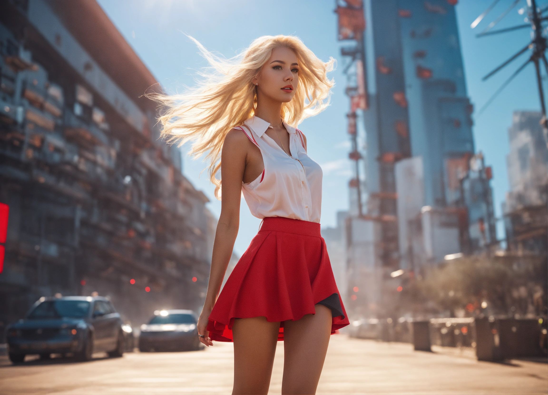Full body, photo, dream girl, futuristic, sunny weather, wearing a red short skirt, open shirt, 8k, blond, wind blowing up skirt, cyber city