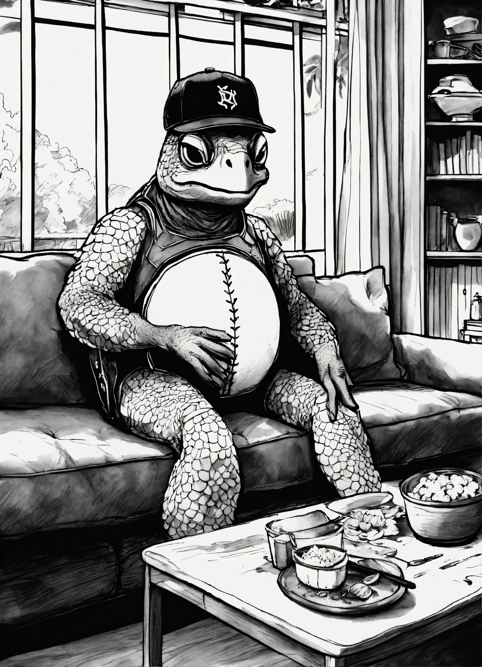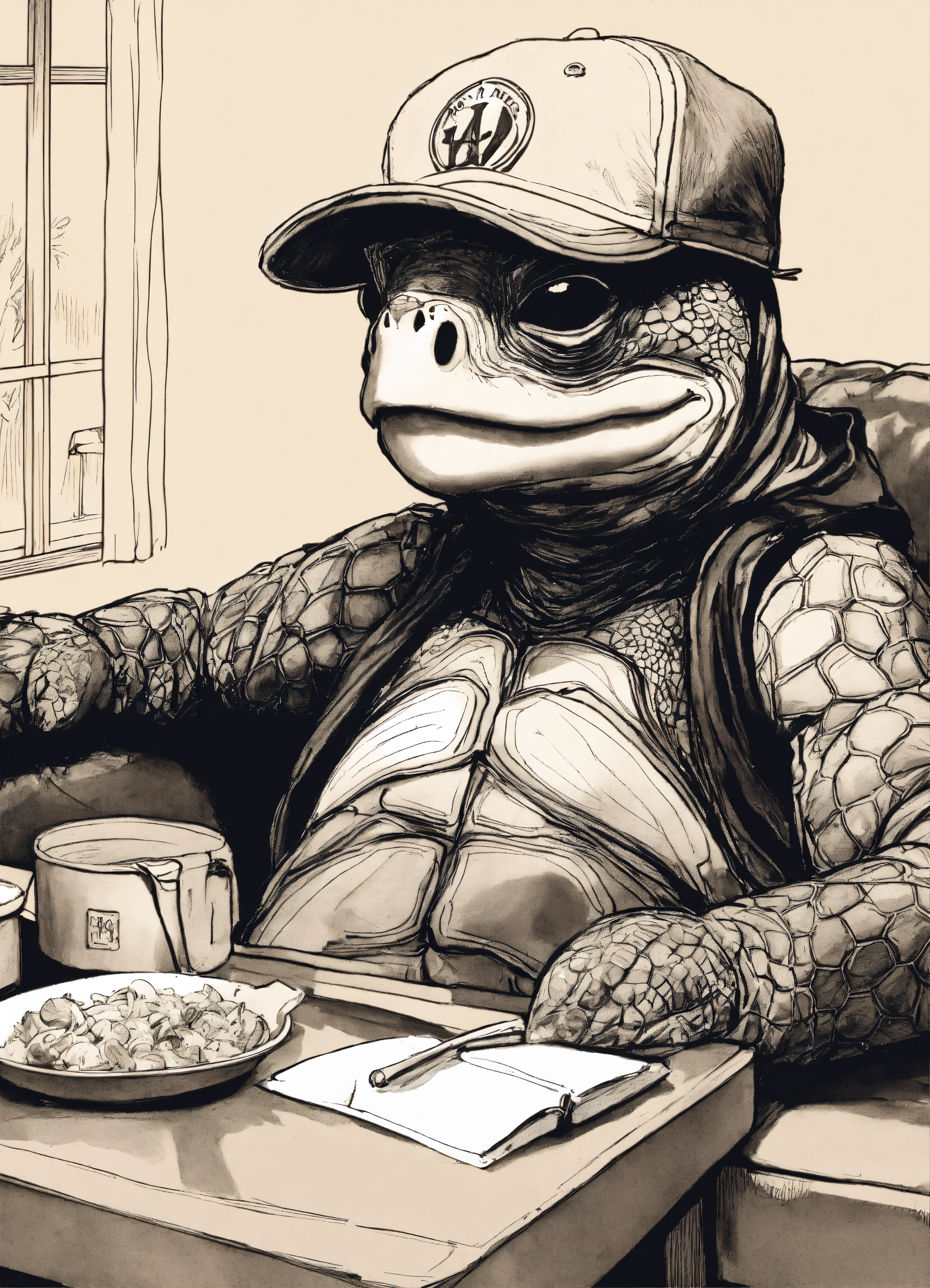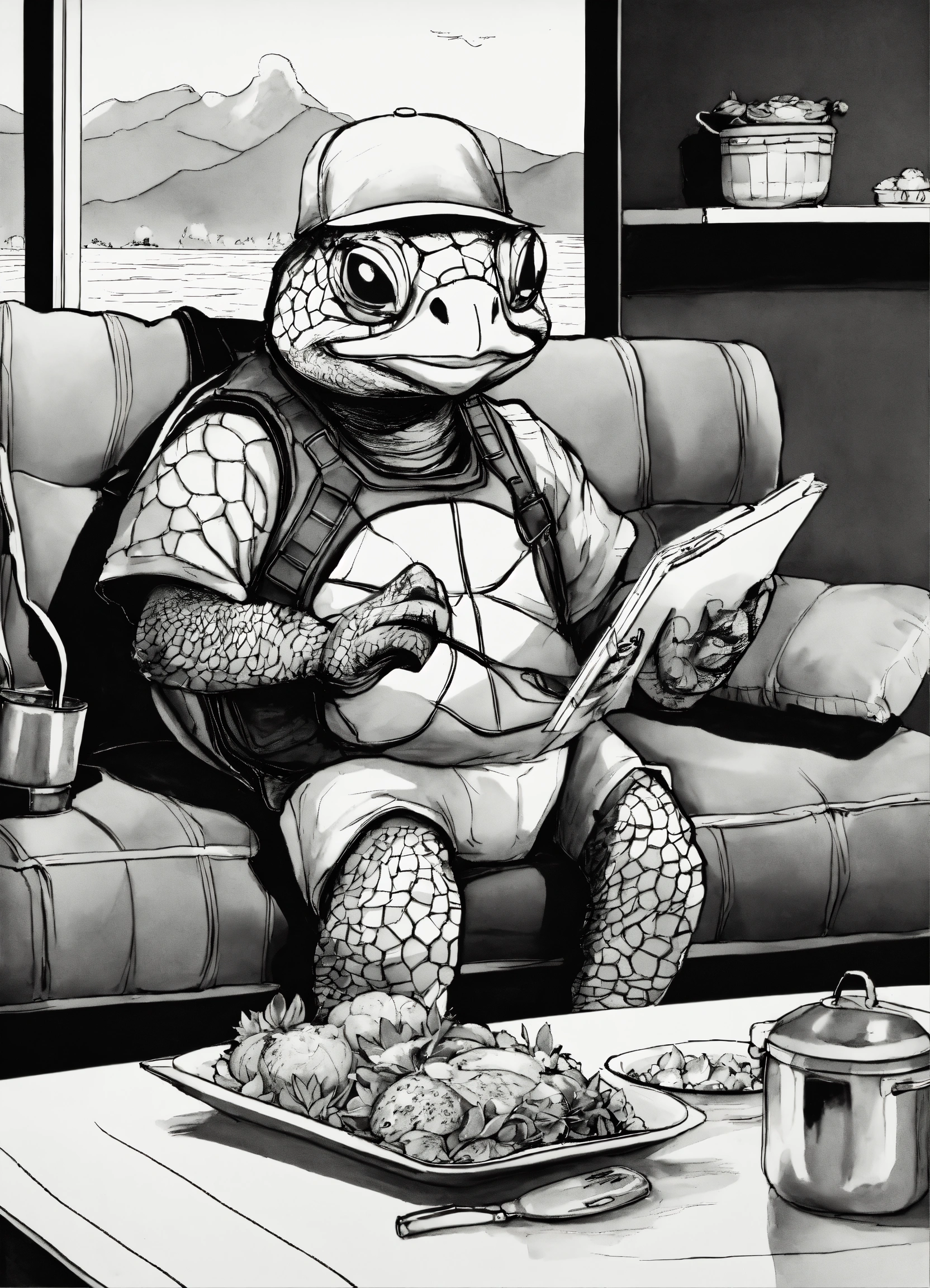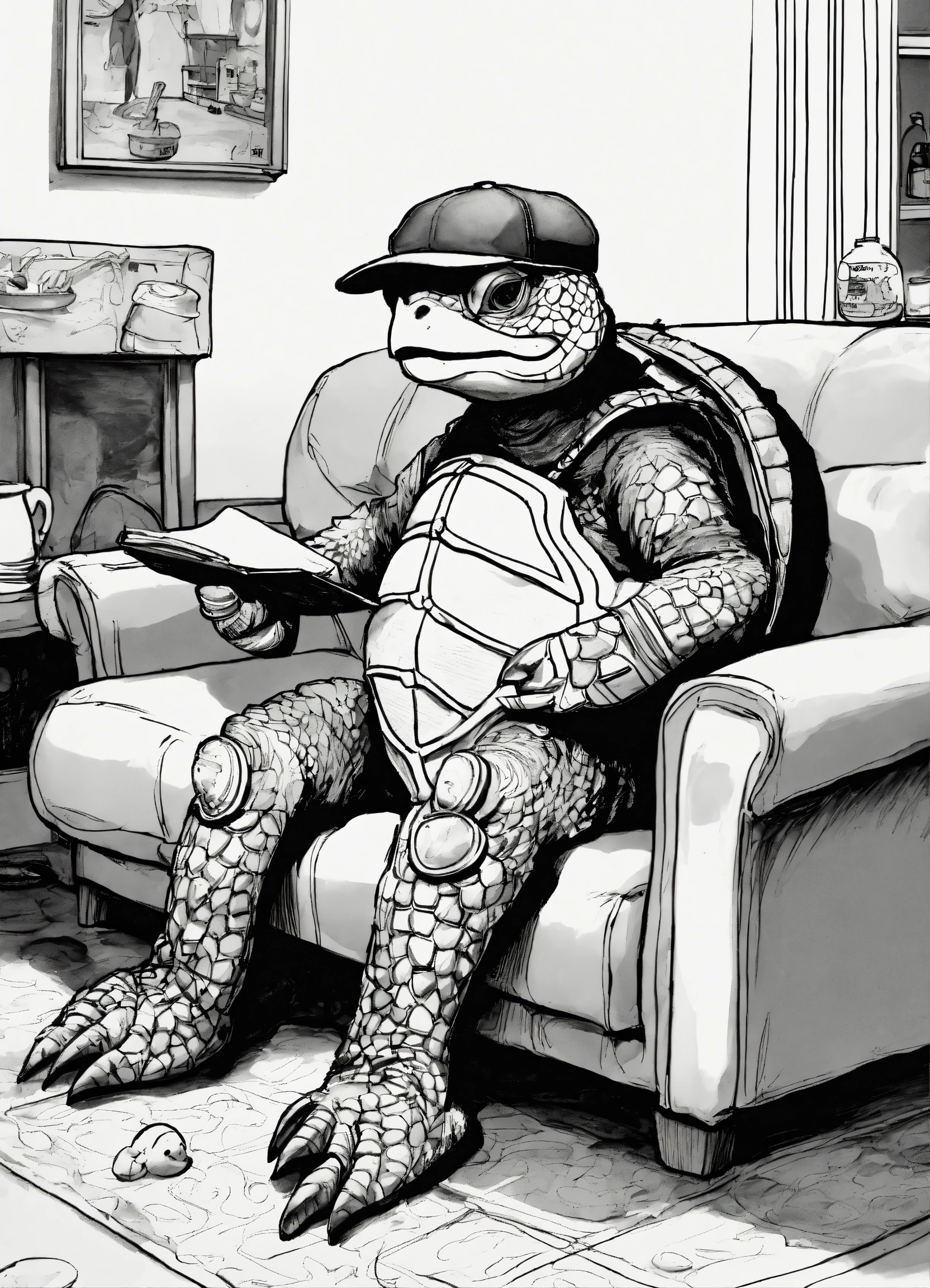An ink drawing of an anthropomorphic sea turtle wearing a baseball hat on a couch cooking a meal