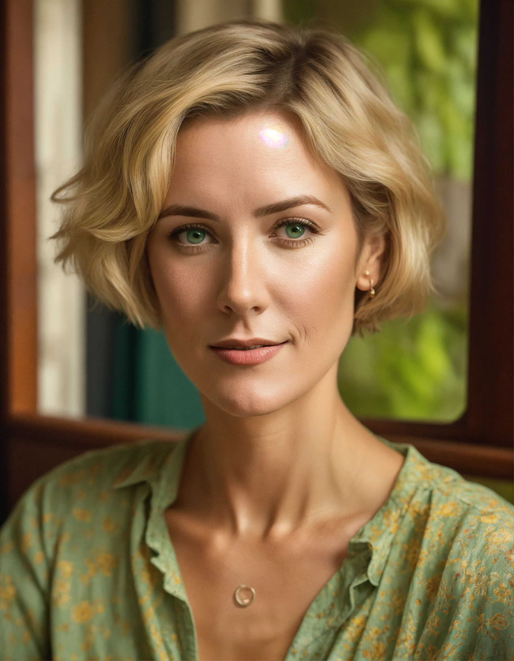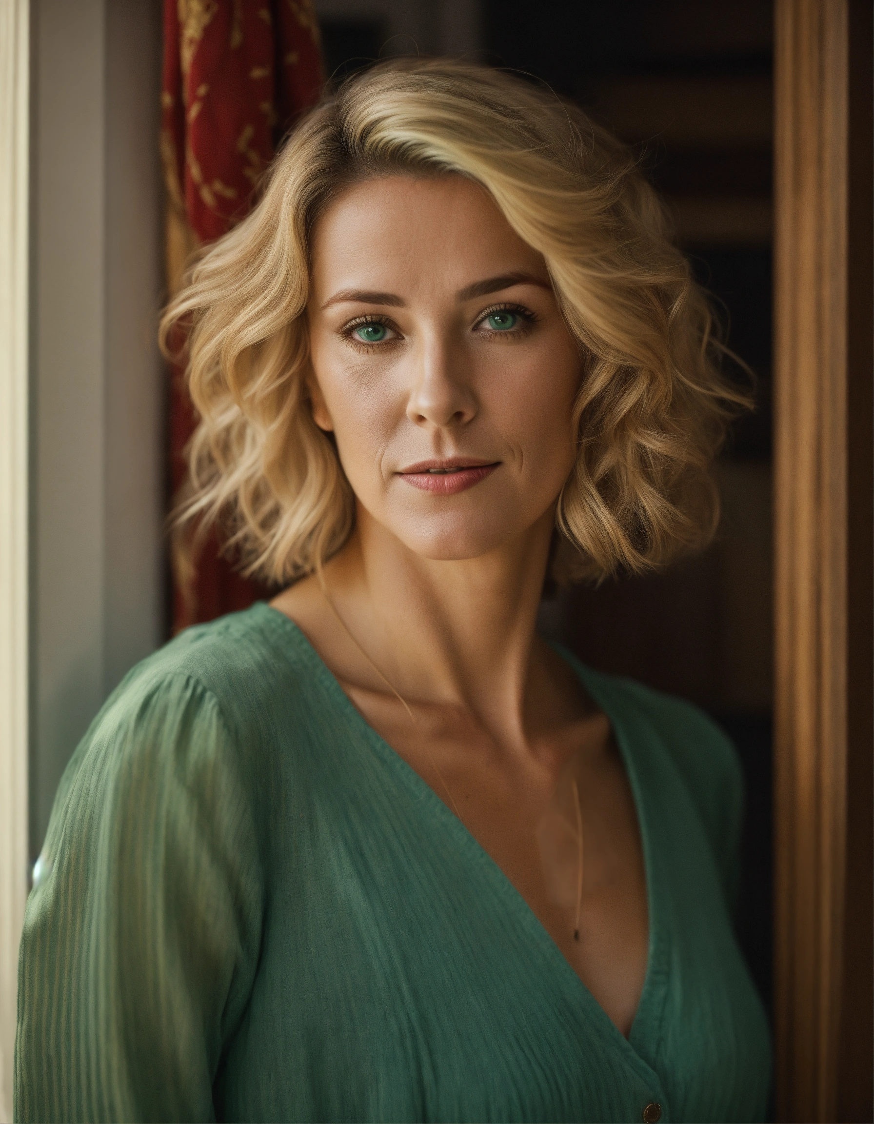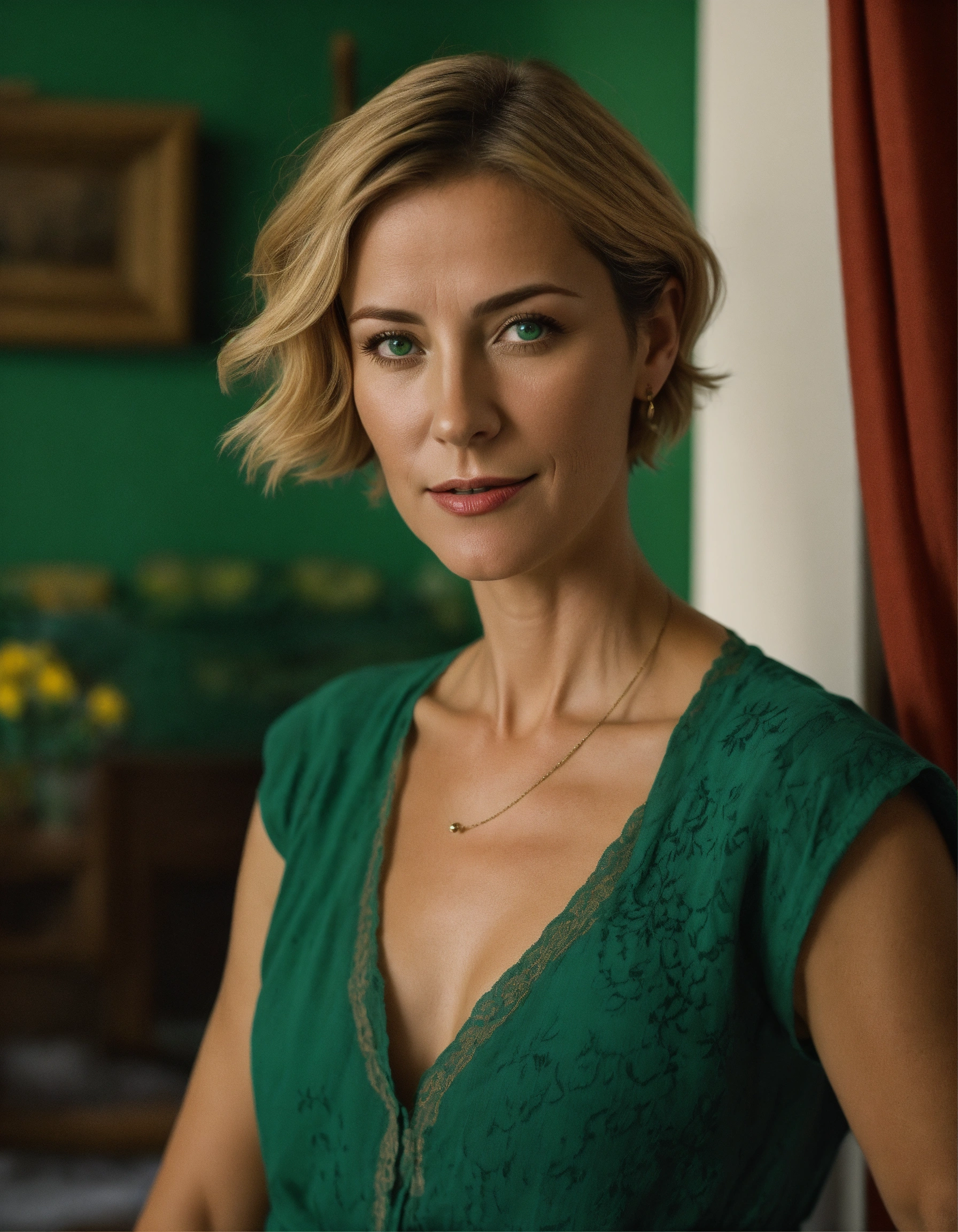A realistic picture of a spaniard blonde 40 years old woman, with short hair, natural green eyes, wearing typical mother clothes, in the interior of a spaniard flat