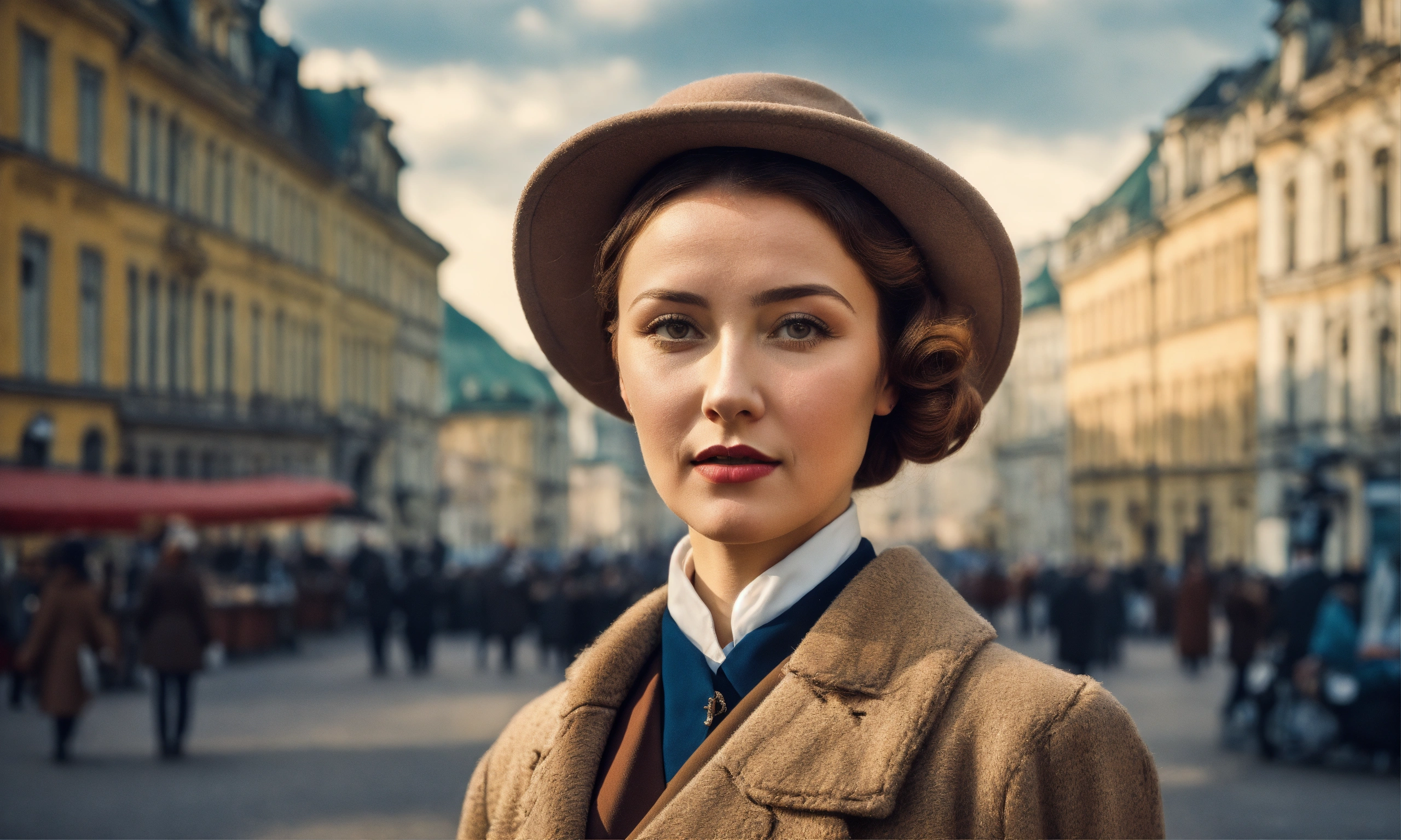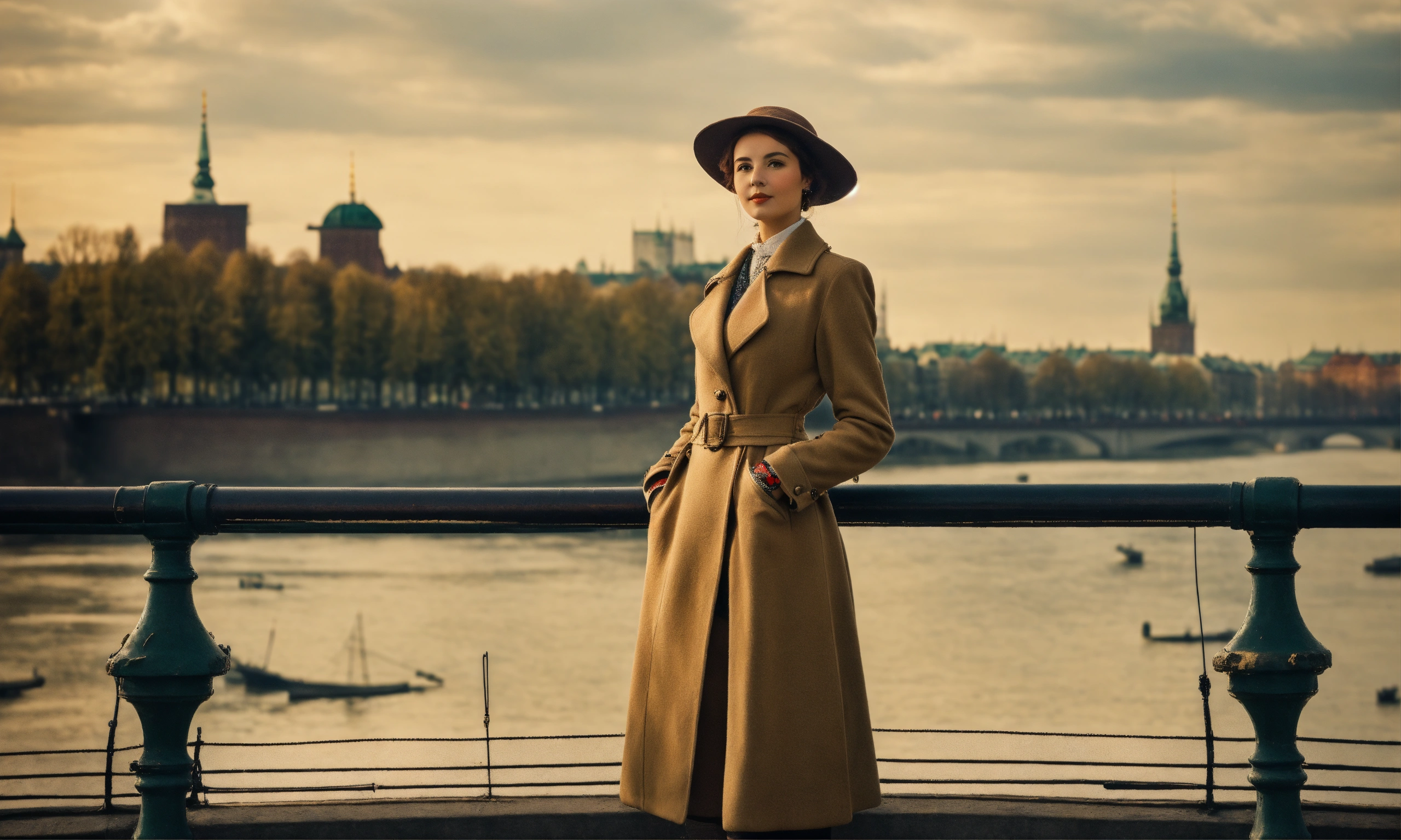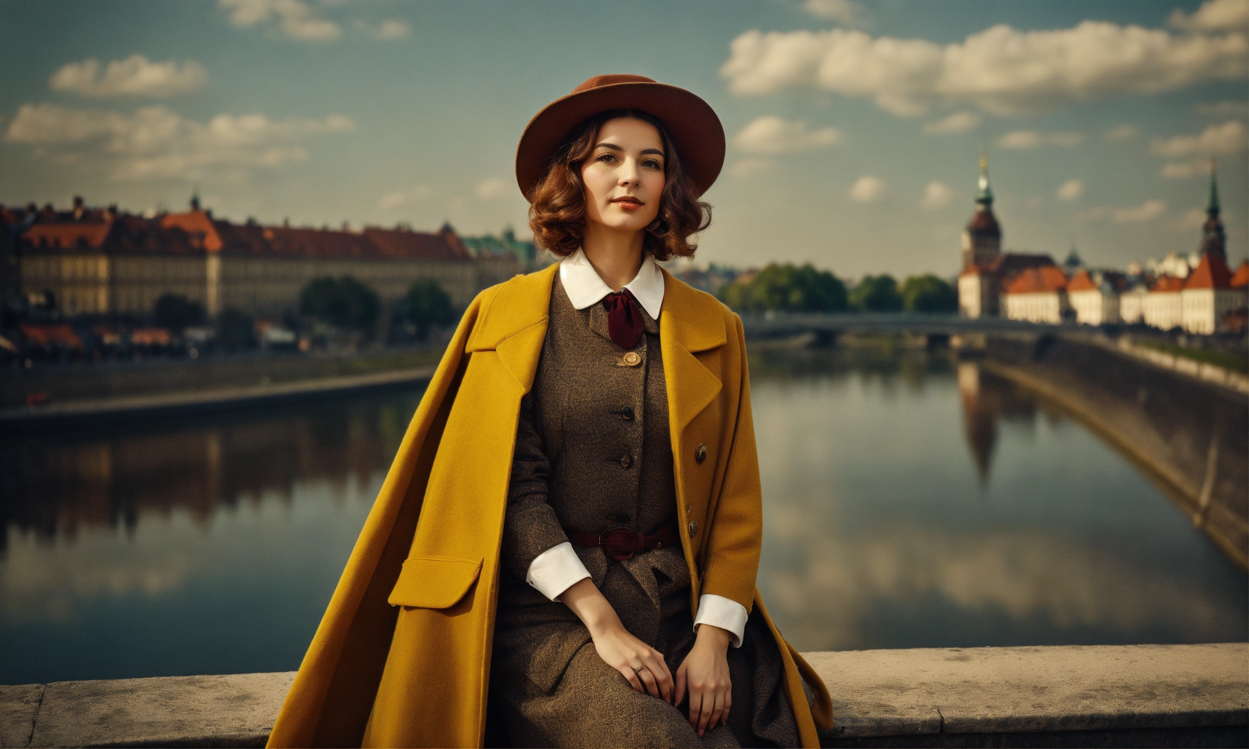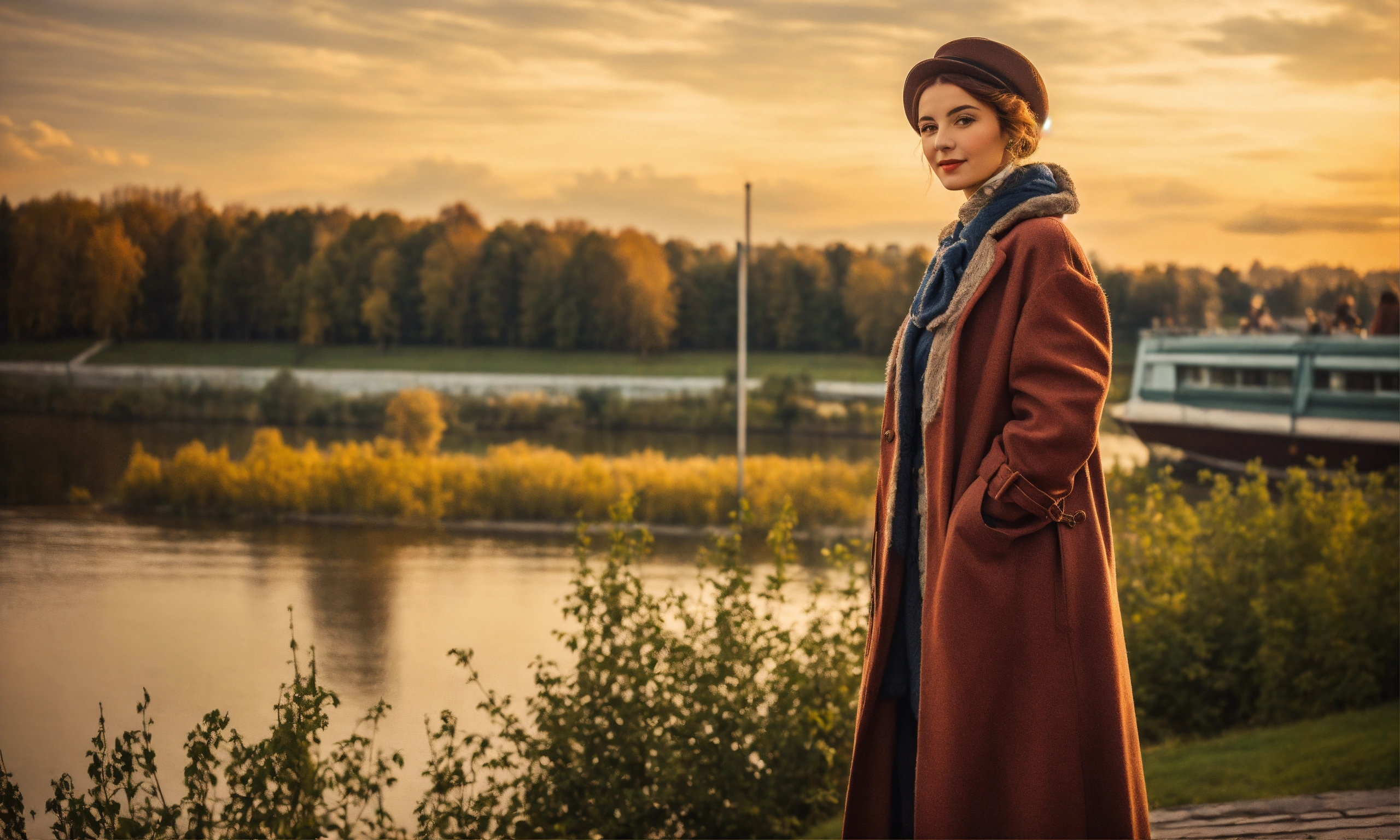 Retro warszawa 1920-1930, сute europian woman, on top of a rievier, looks at the camera at half height, retro style clothing long coat, the woman exudes kindness, calmness and ambition. she has a beard.