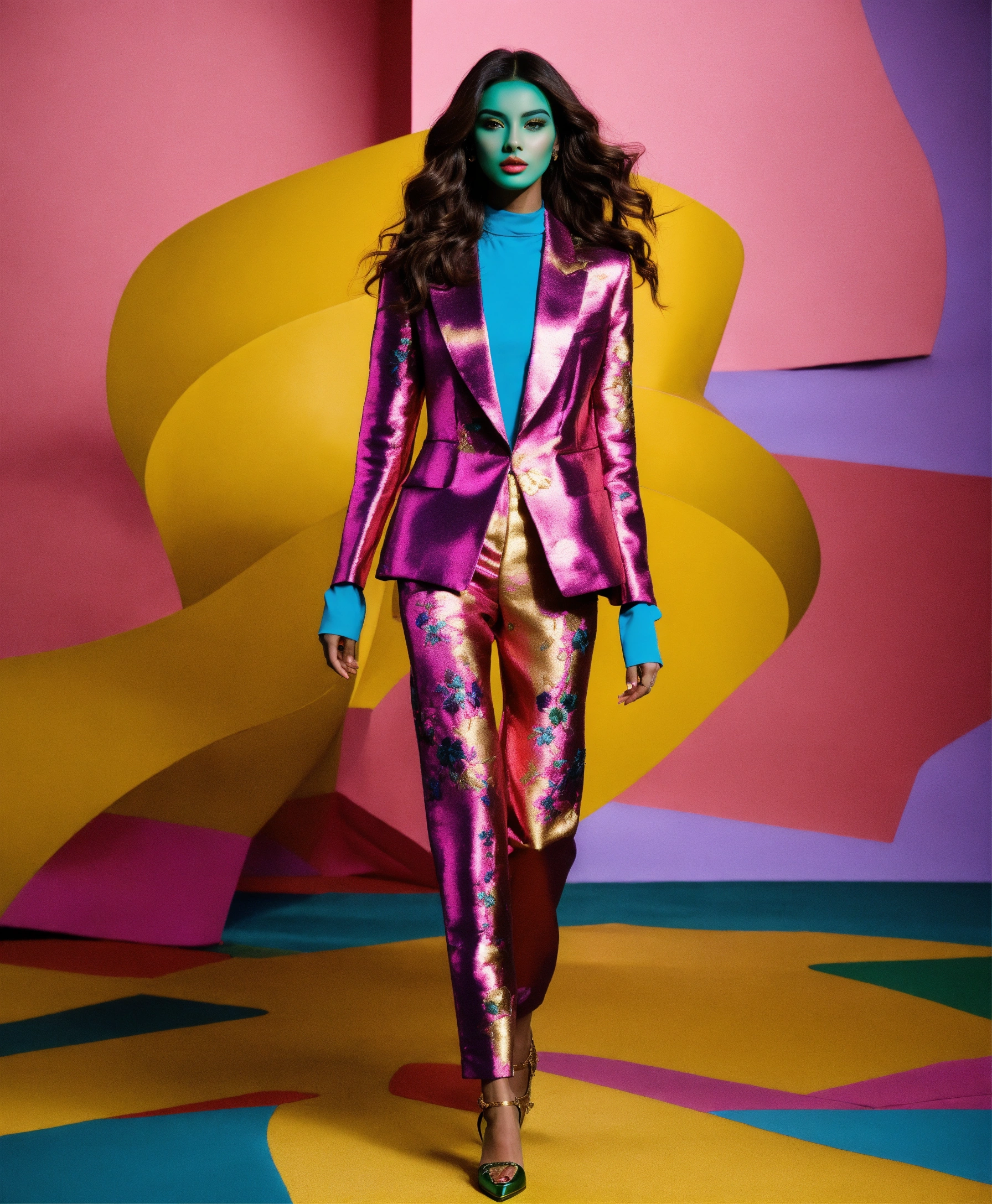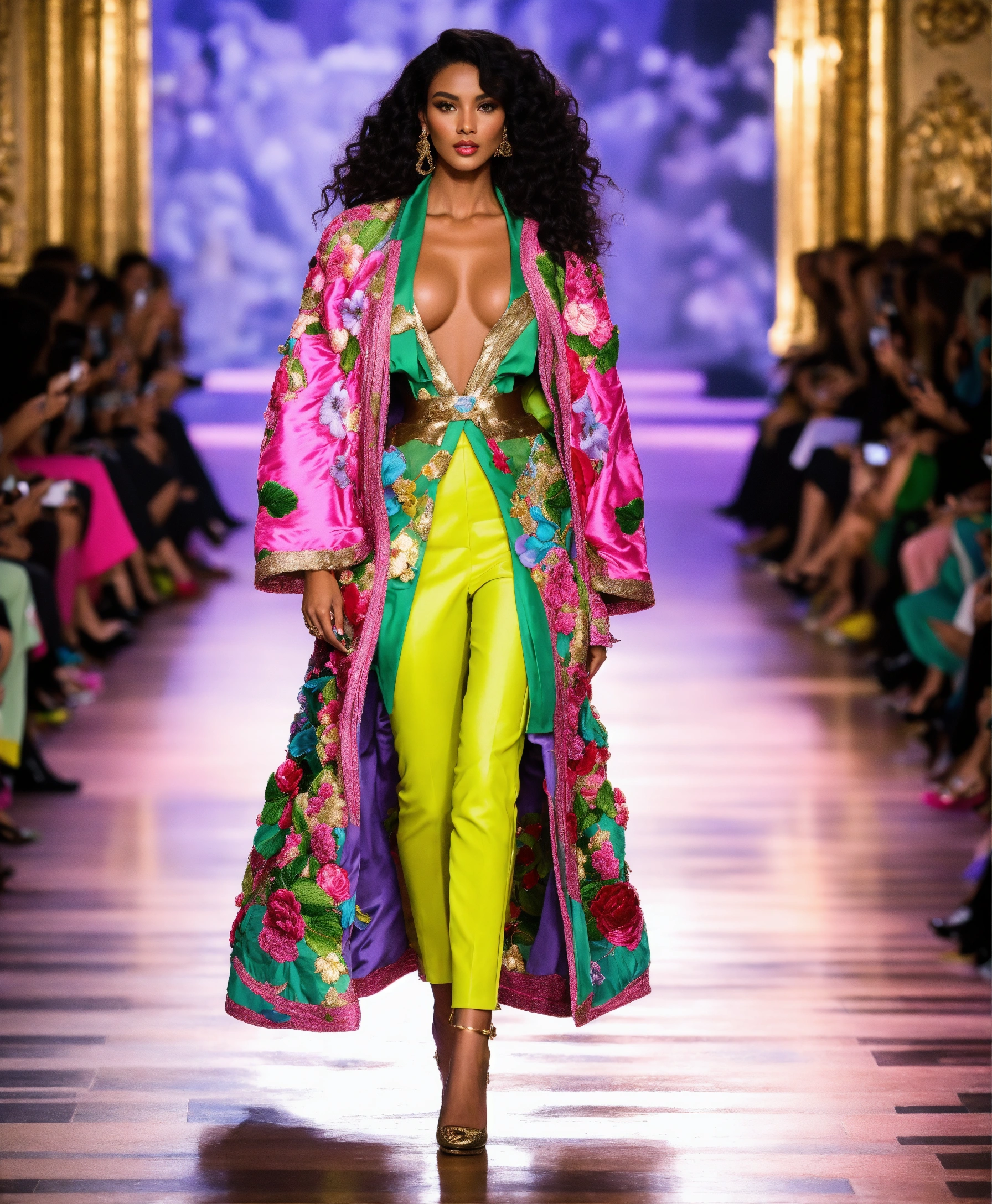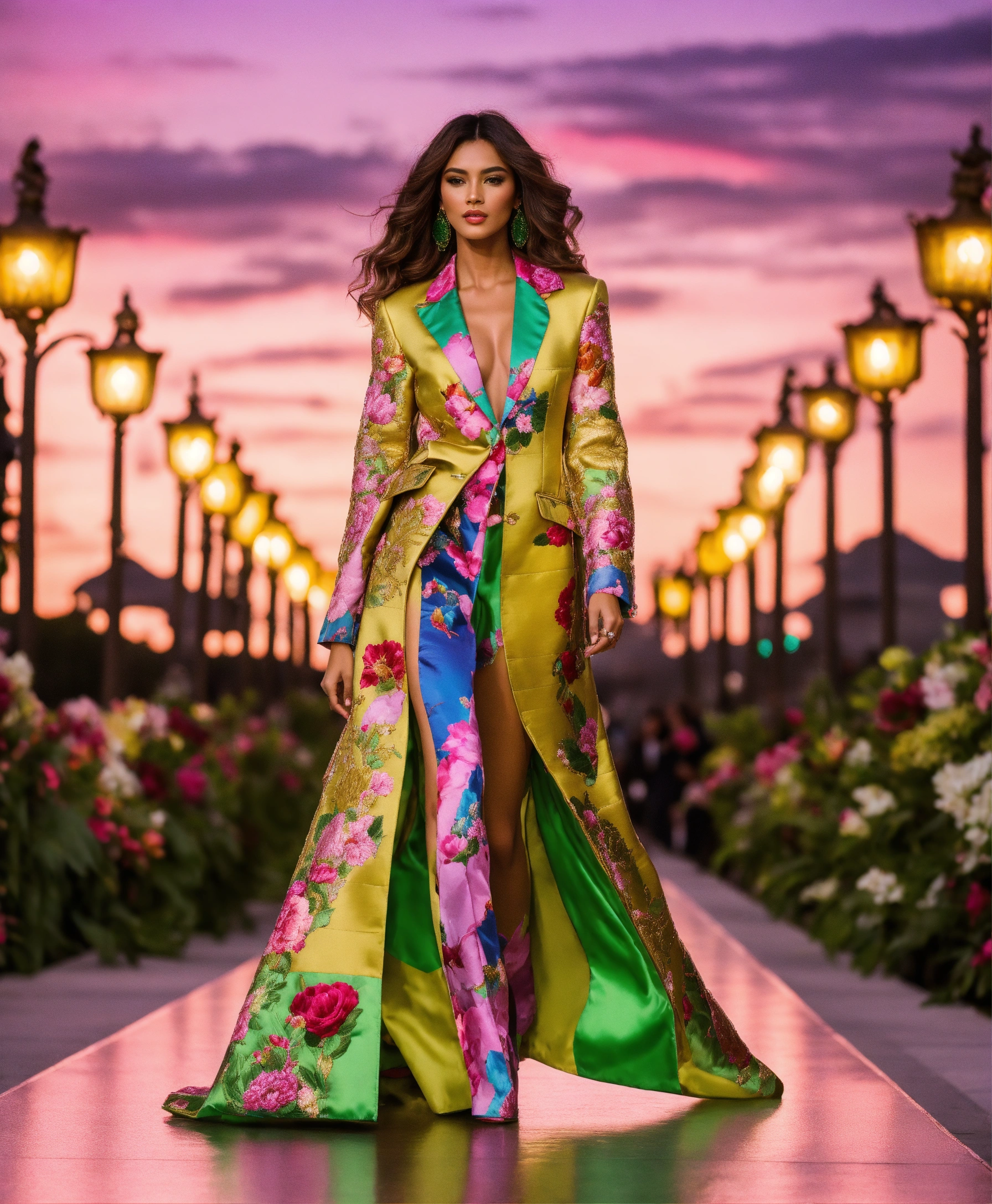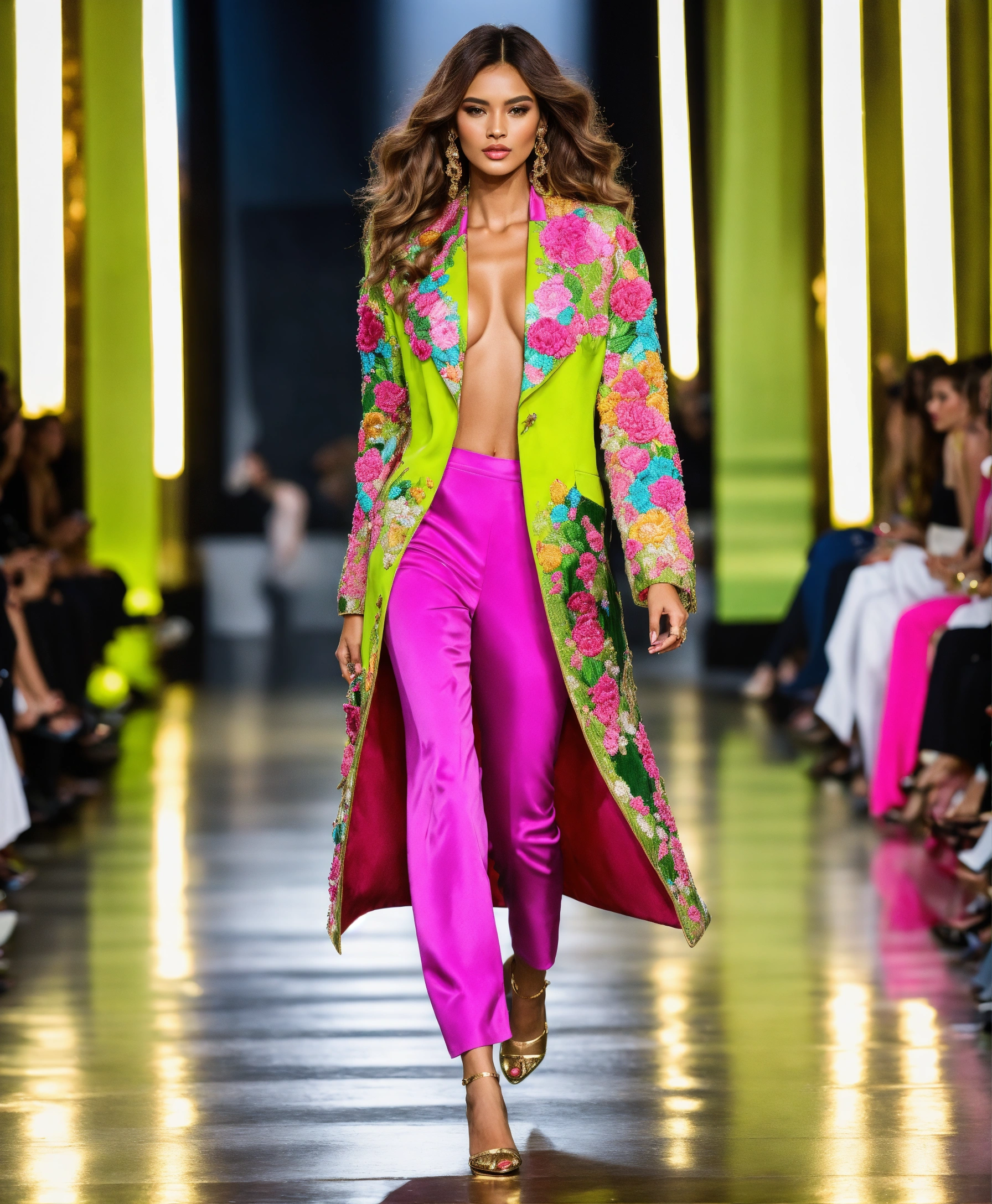 Ultra realistic full body photo of a stylish beautiful elegant attractive supermodel voluminous wavy hair walking the runway modeling summer beach wear brave, paris versailles details cutouts and gold geometric pattern floral structured tailored jacket pink gold green lilac peridot silver magenta lime fuchsia yellow blue black gray copper mauve bronze haute couture embroidered gorgeous contrasting colors vivid intricate bold vibrant glamorous ultimate elegance beautiful luxurious awesome wealthy opulent exquisite resplendent sheen magnificent sublime 12k