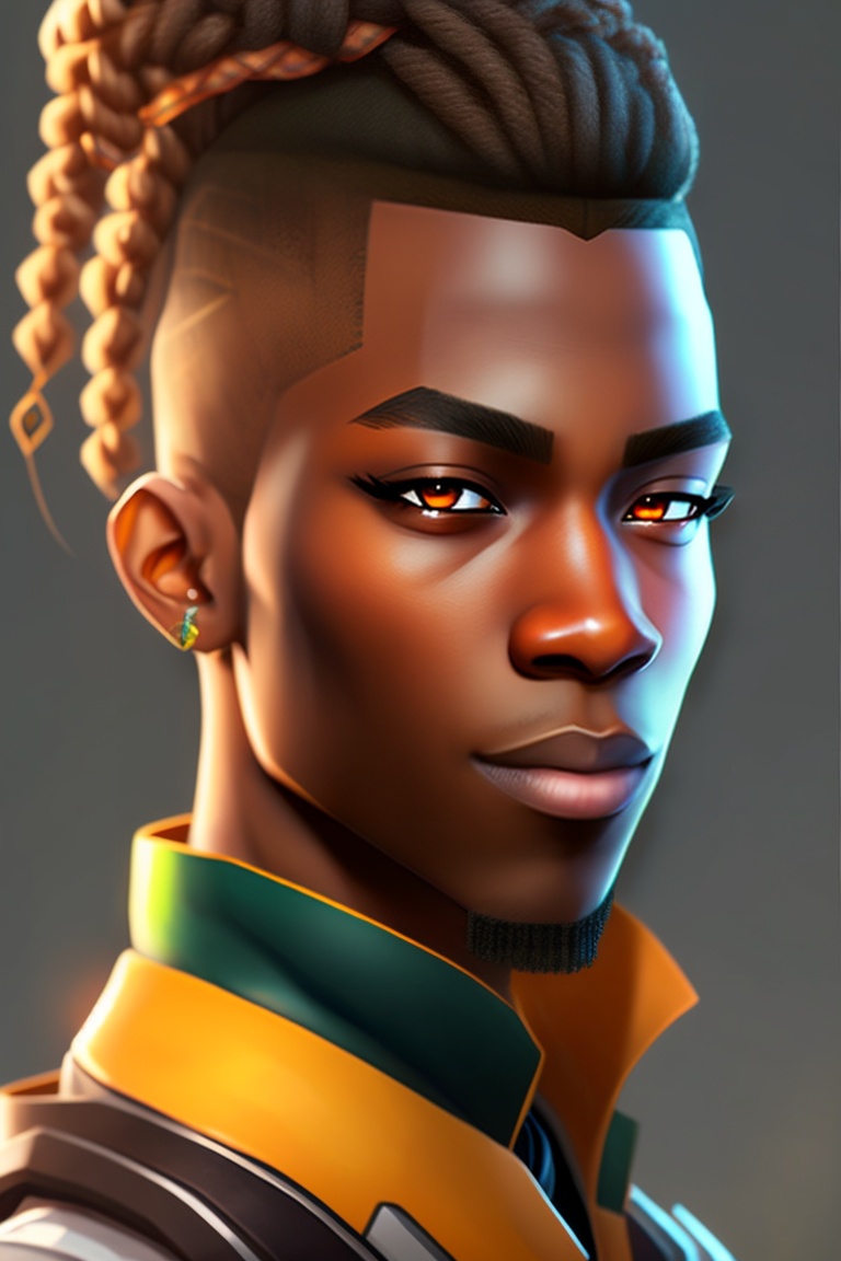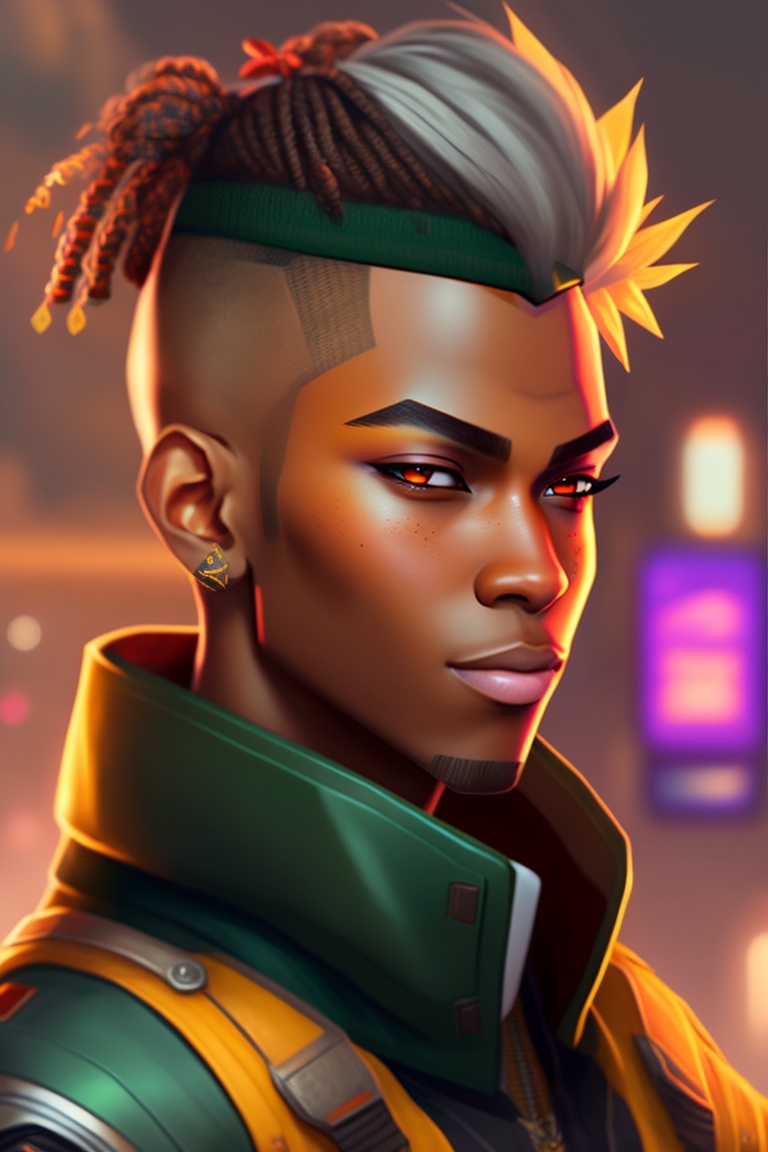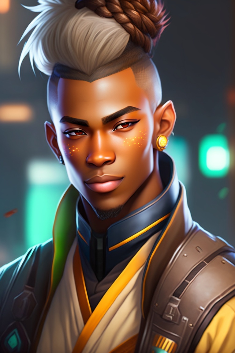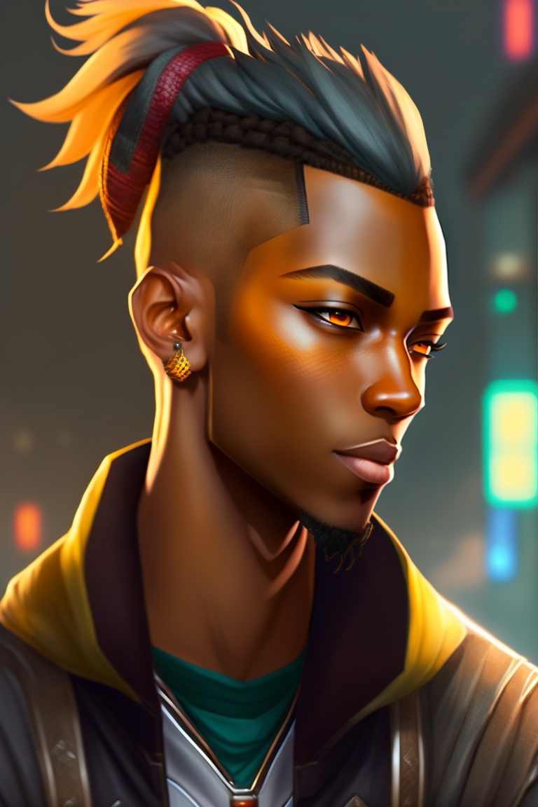 Ekko, cyberpunk, ninja, male, amber eyes, mischievous, happy, athletic, joyful, braided hair, shinto earring, human ears, portrait