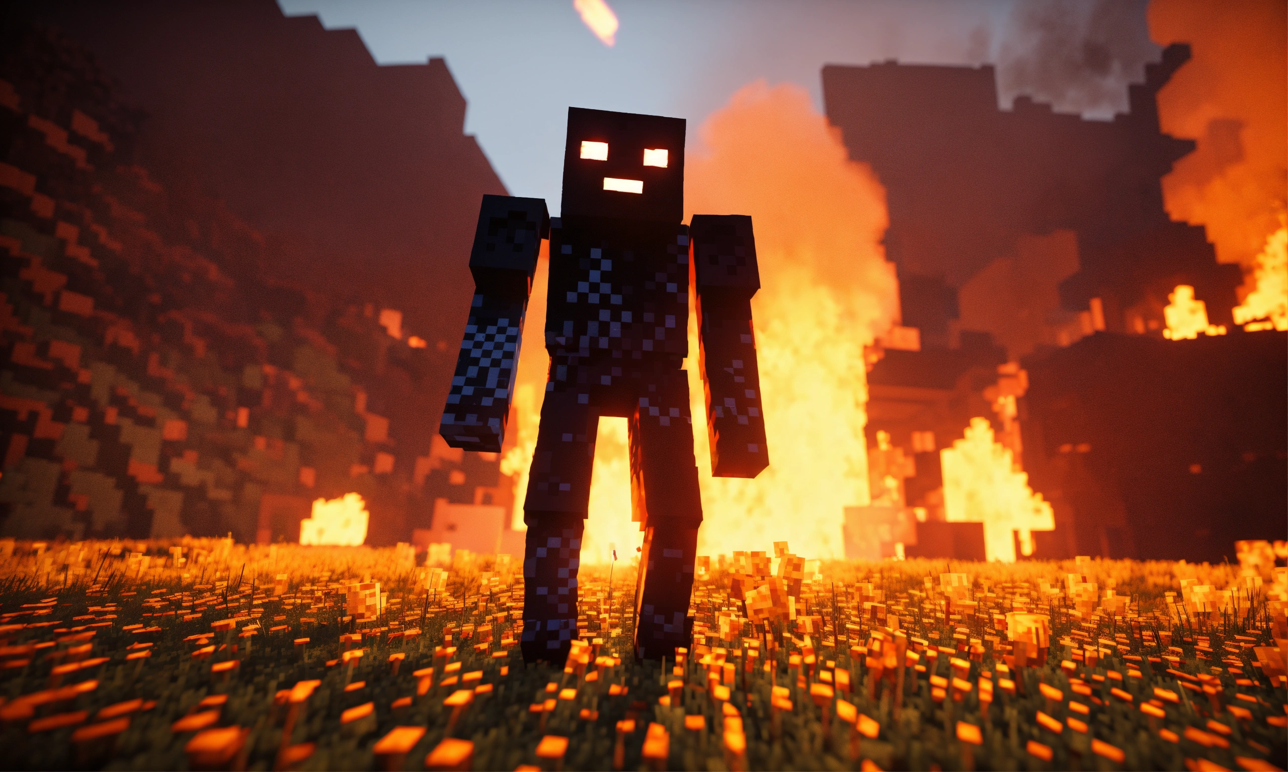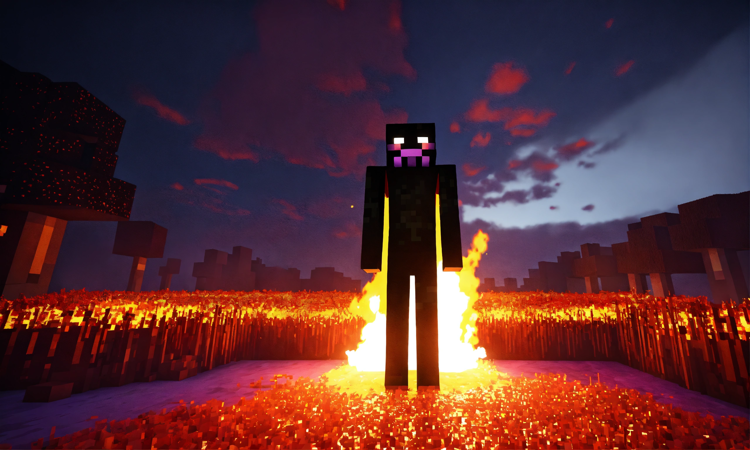 Minecraft enderman, scary, surrounded by a field on fire. a scary light theater stage cinematic lighting, ultra 4k hd