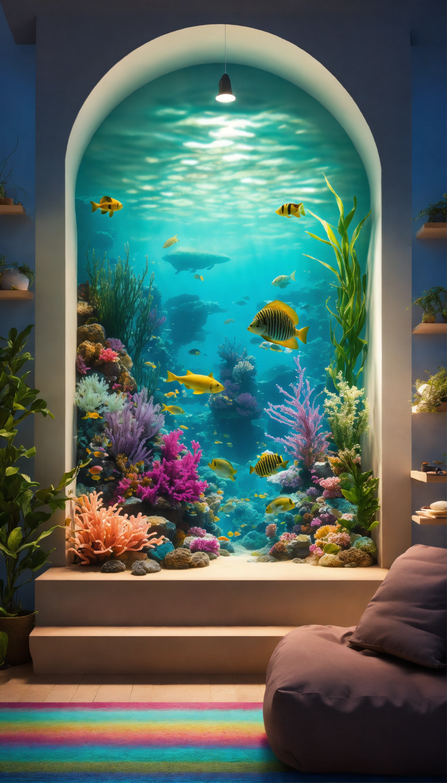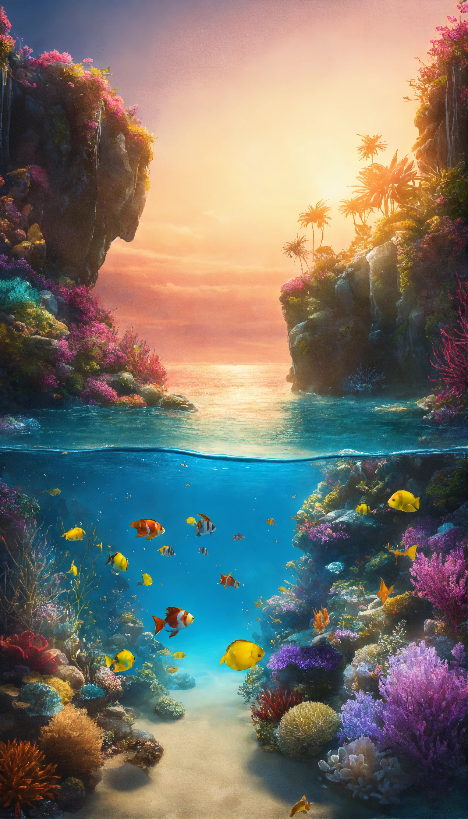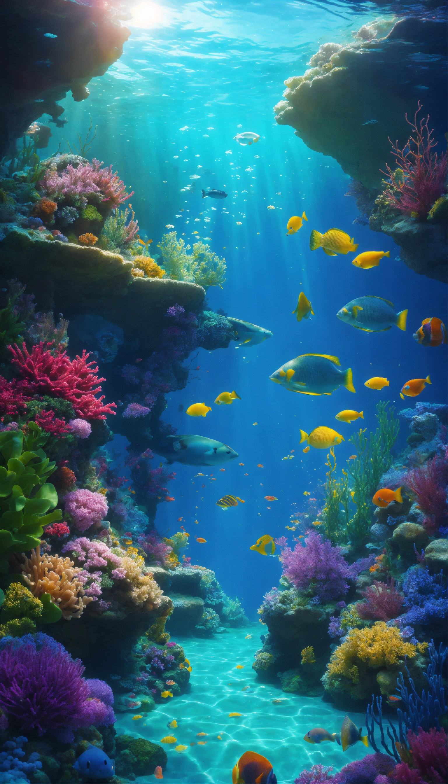 Crear un escenario bajo del mar con luz brillante, burbujas, plantas, flores y enredaderas acuaticas, colores brillantes, nitidos y coloridos