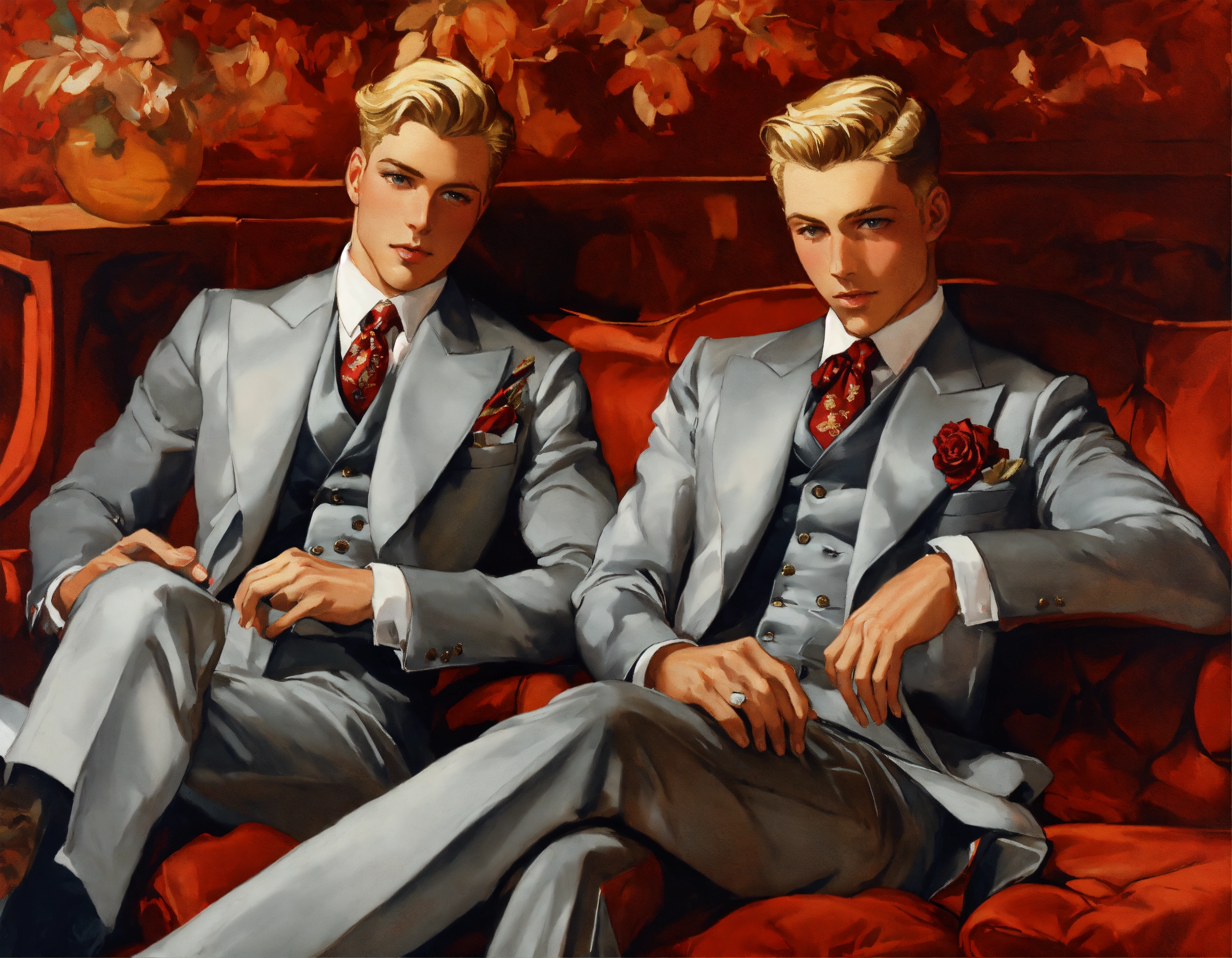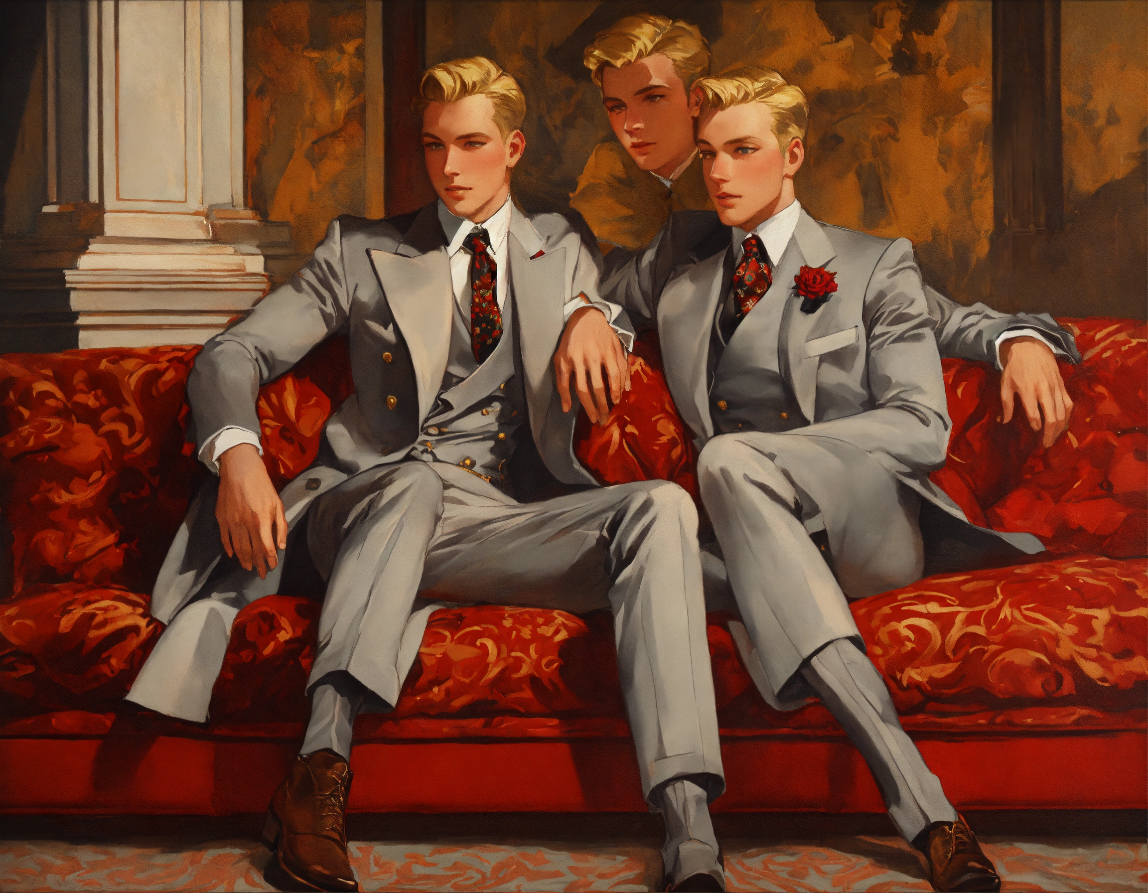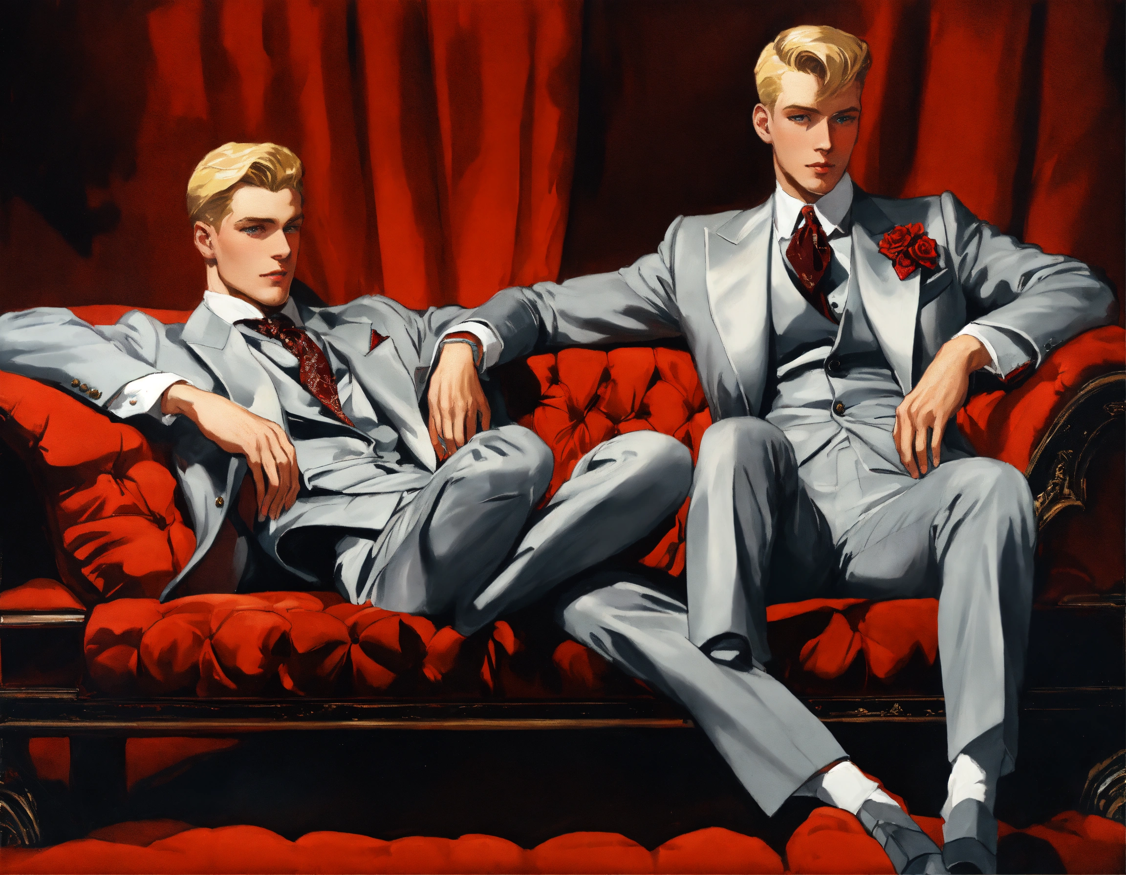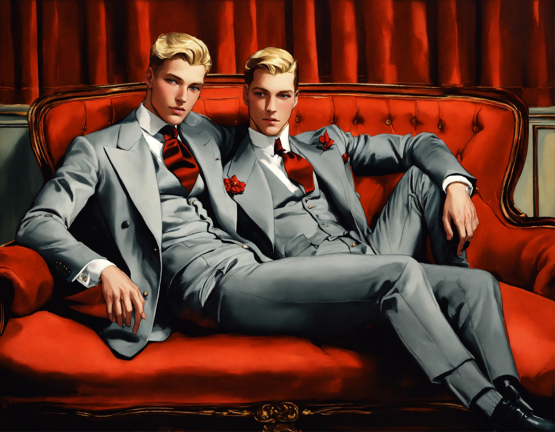 Two blonde sportsmen in grey double breasted suit, club tie, lying on a red velvet couch, leyendecker style