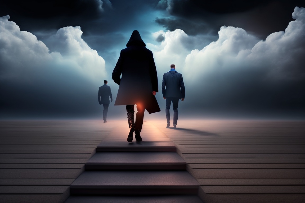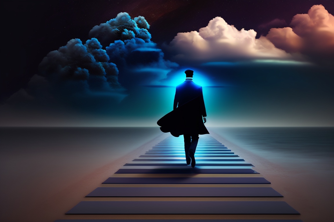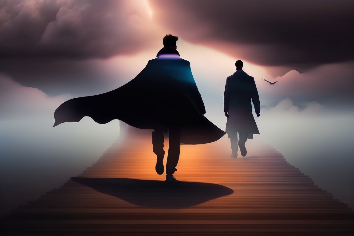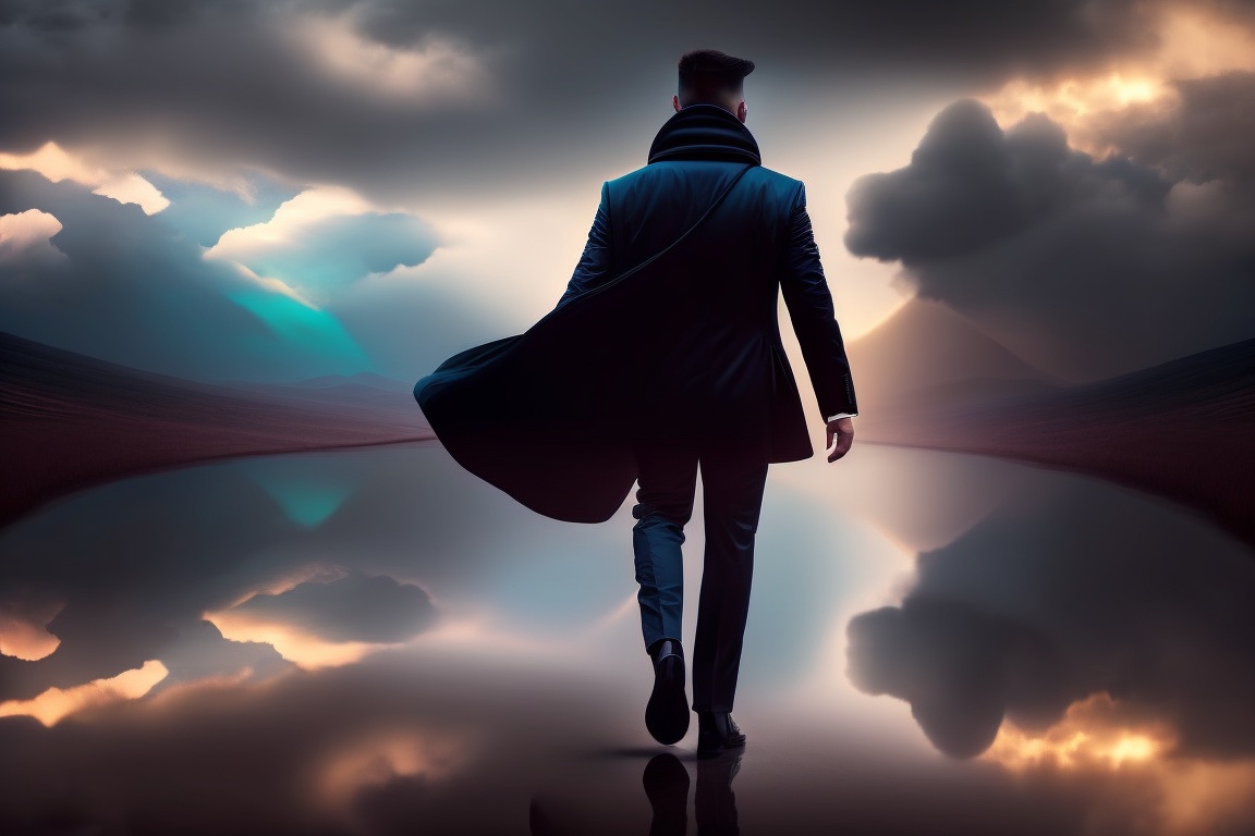 Dark, shadowy figures or clouds symbolizing fear and doubt can be shown fading away in the background as the person steps forward with confidence and belief in themselves.