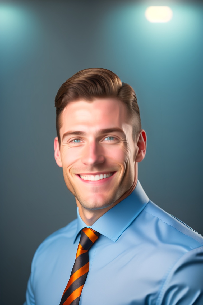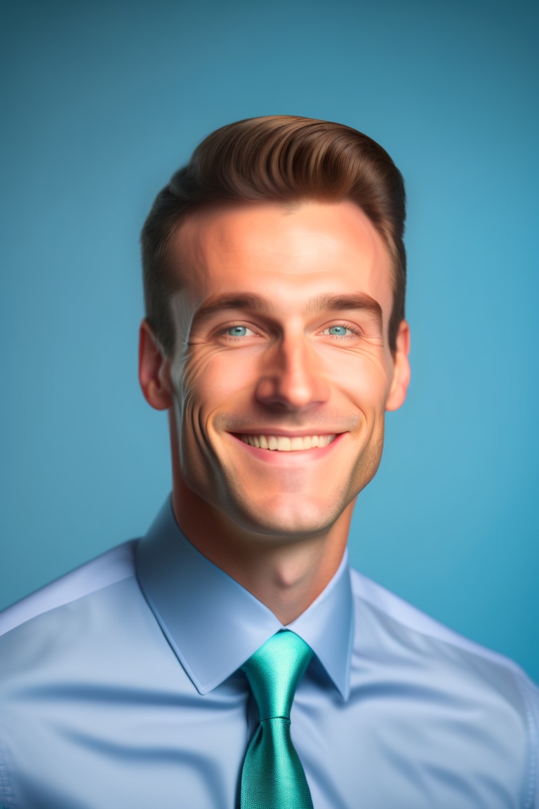 A corporate professional profile photo of a successful man smiling, highly detailed upper half body headshot photograph, best corporate photography photo winner, centered uncropped symmetrical beautiful masculine facial features, 4 k high resolution, canon 5d mark iii photo, professional studio lighting, face must be like clear smooth face of a person, camera facing expressive eyes, super resolution, cyan color background