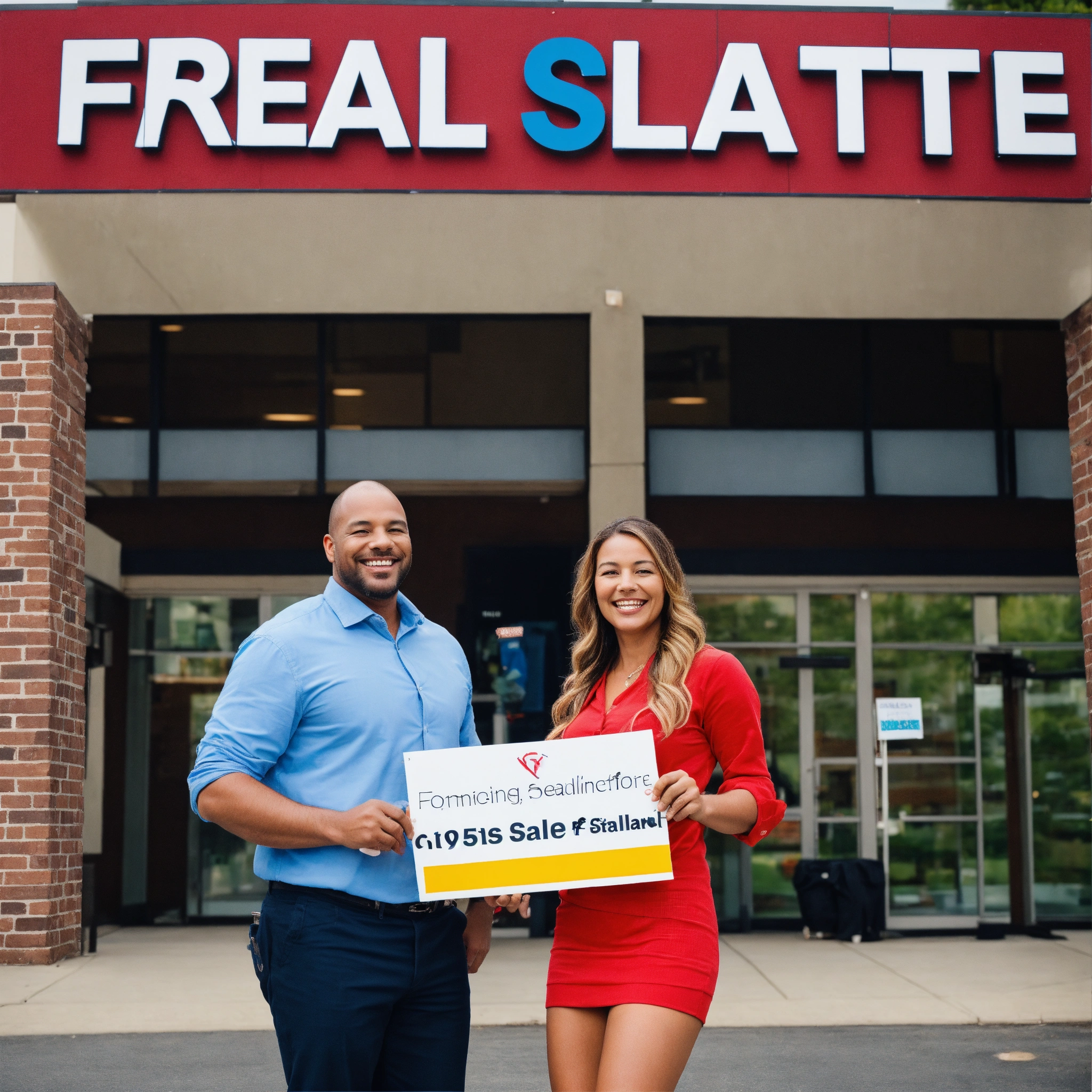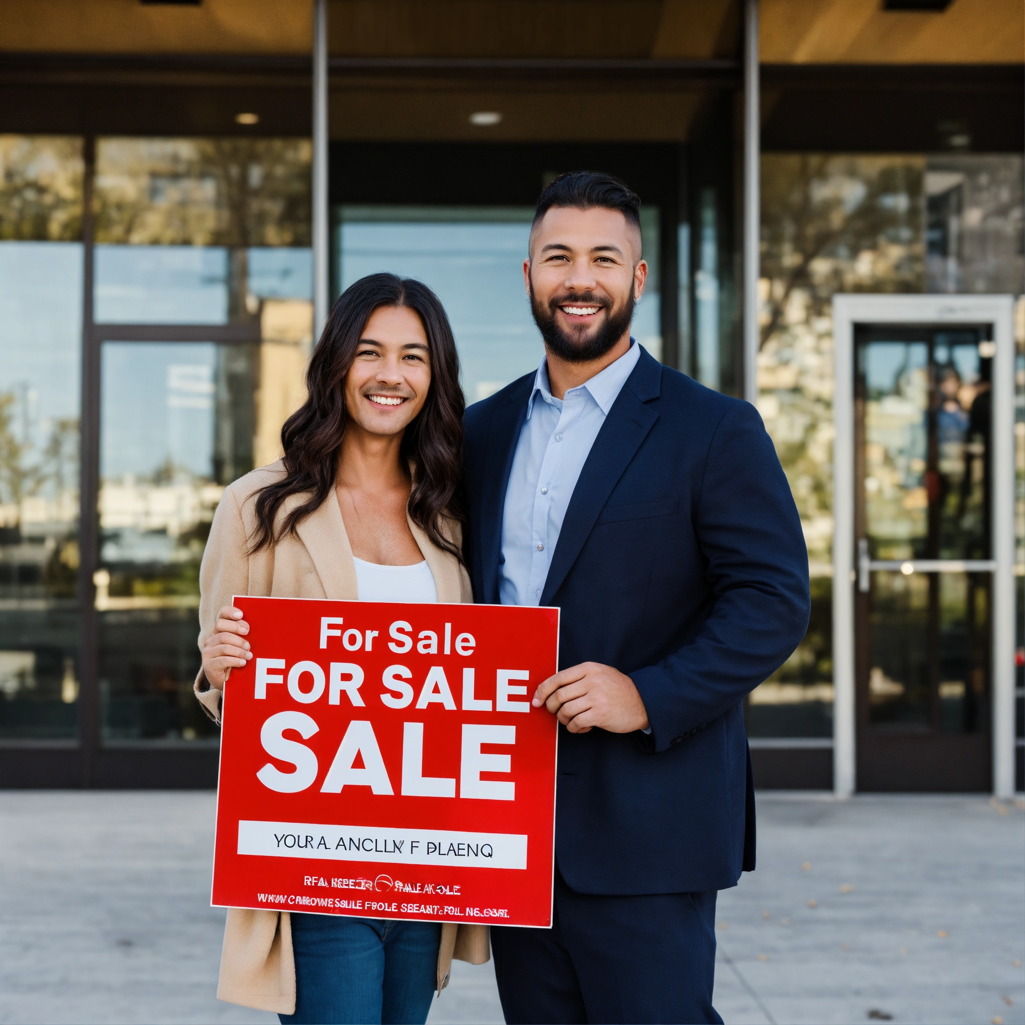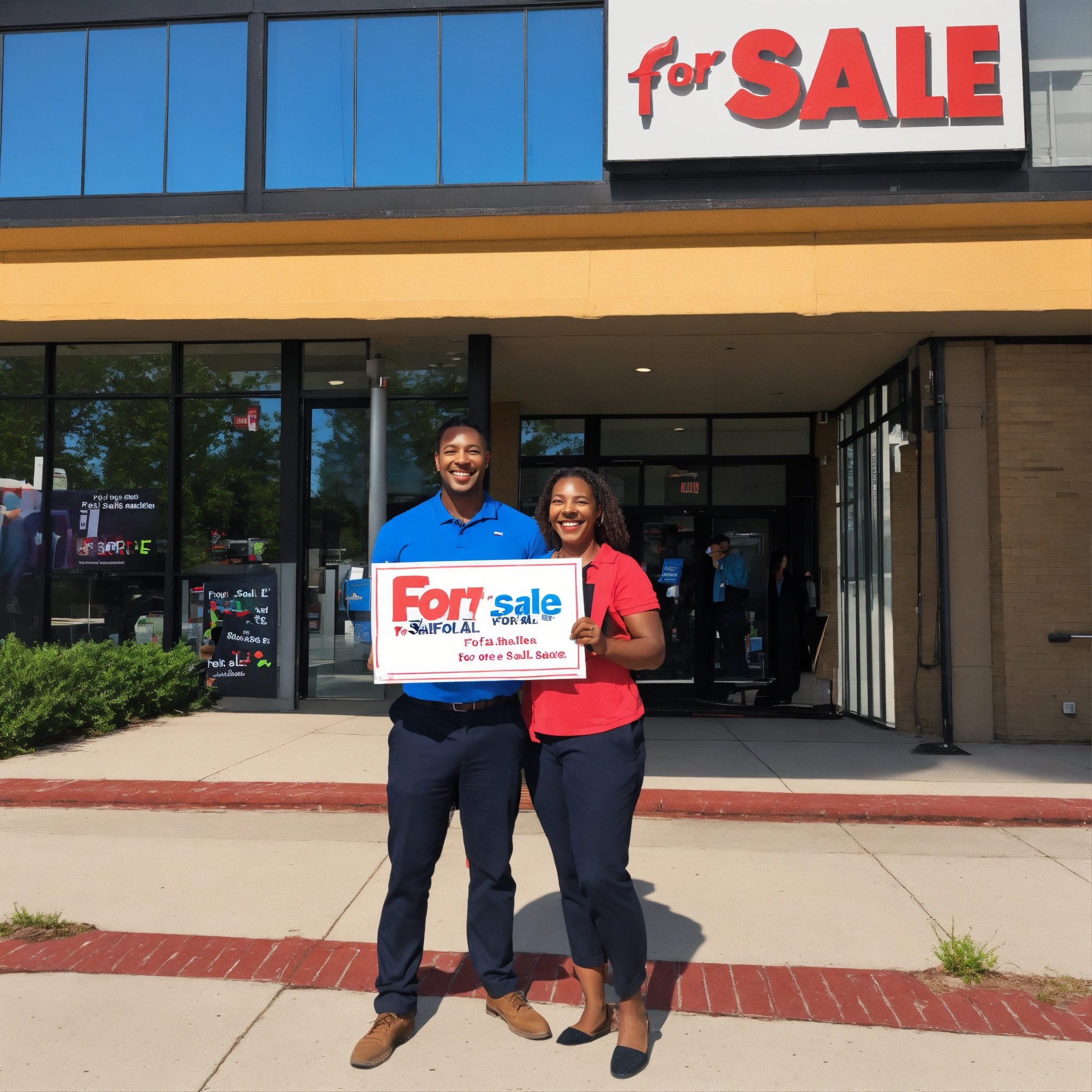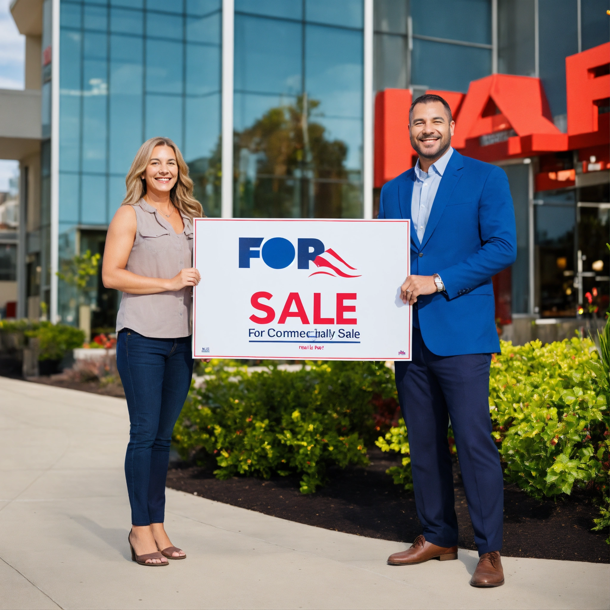 A photo of a man and a woman standing in front of a commercial real estate building, they are smiling and holding a sign that says "for sale"