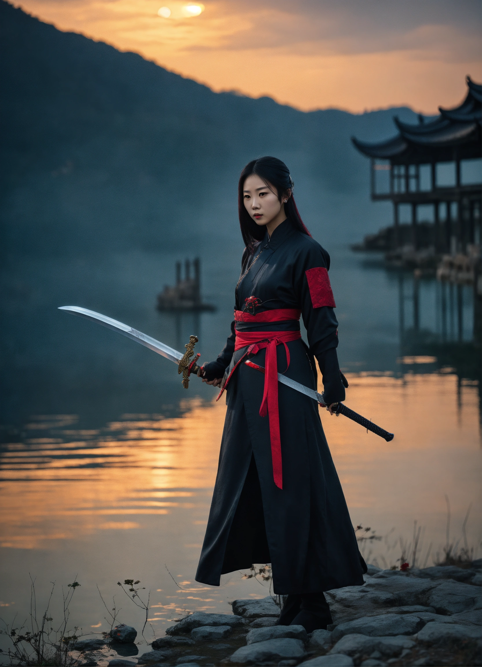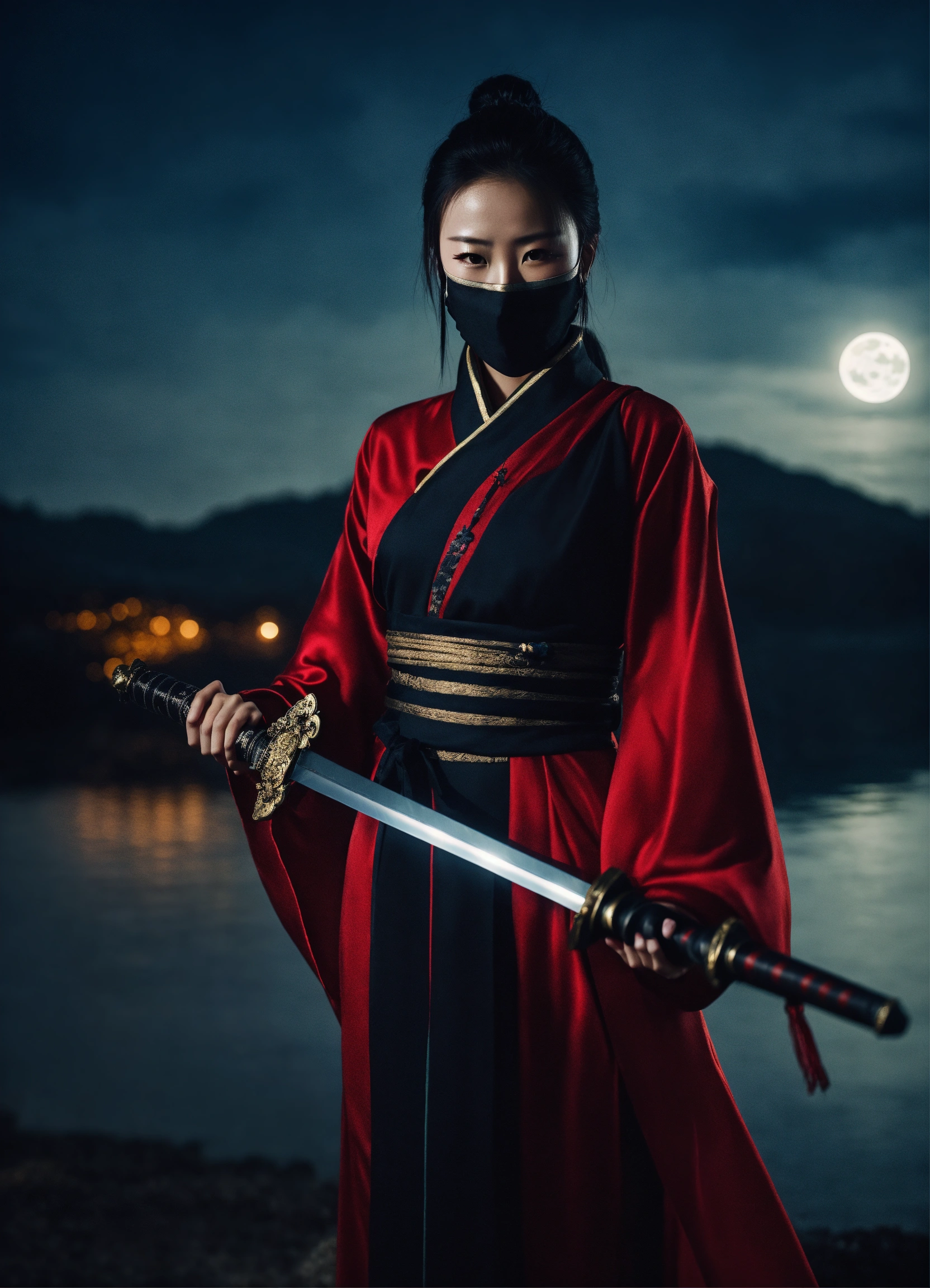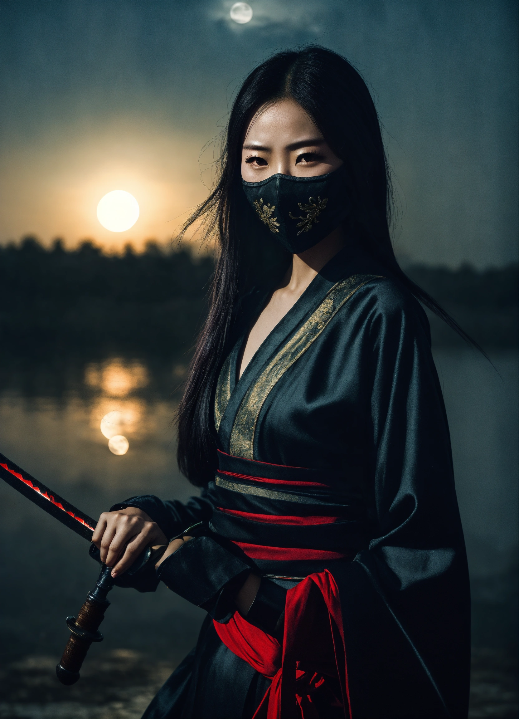 Beautiful modern-dress chinese female assassin with sword and black facemask, long-distance mood shot by lake, moonlight