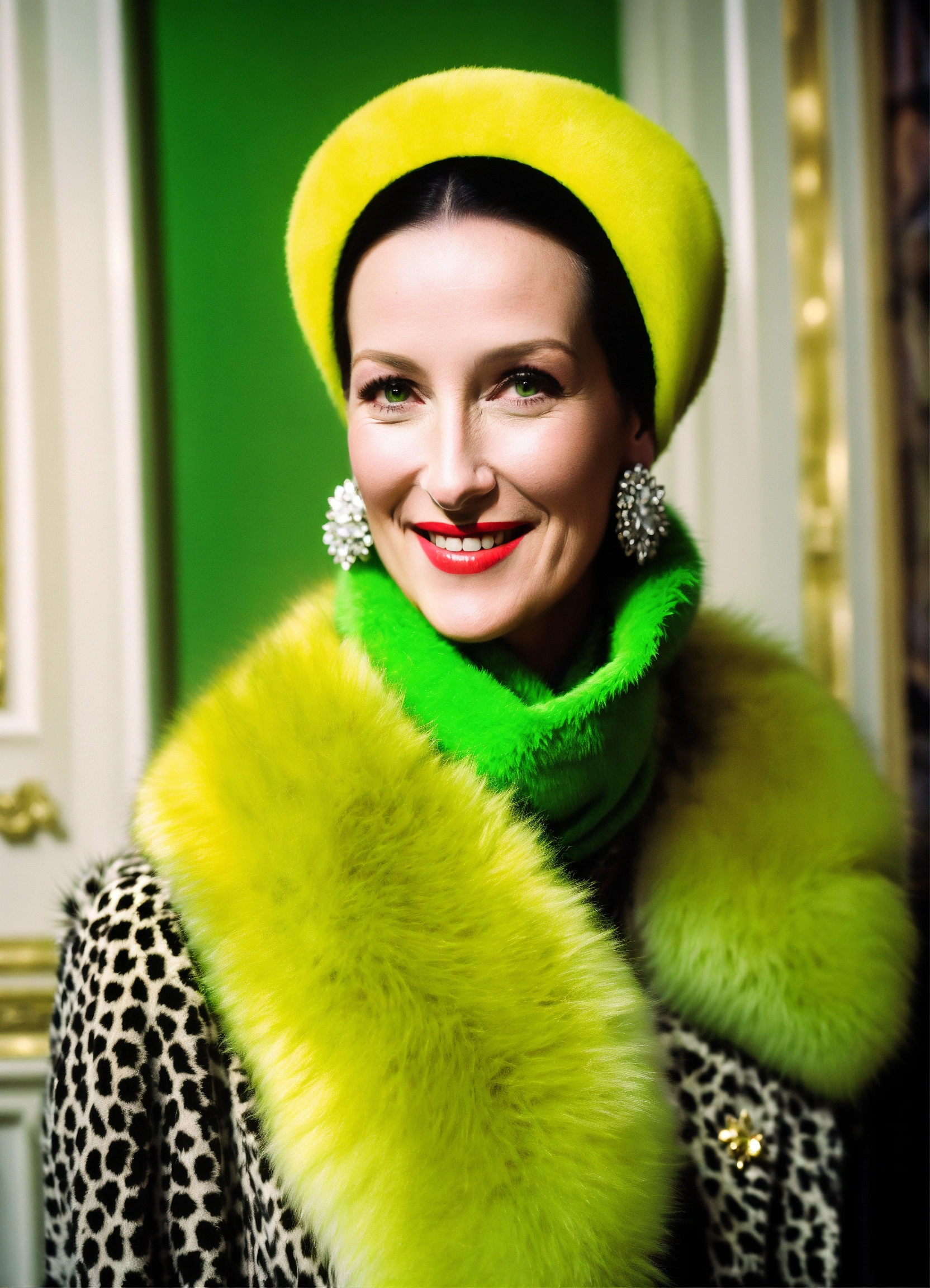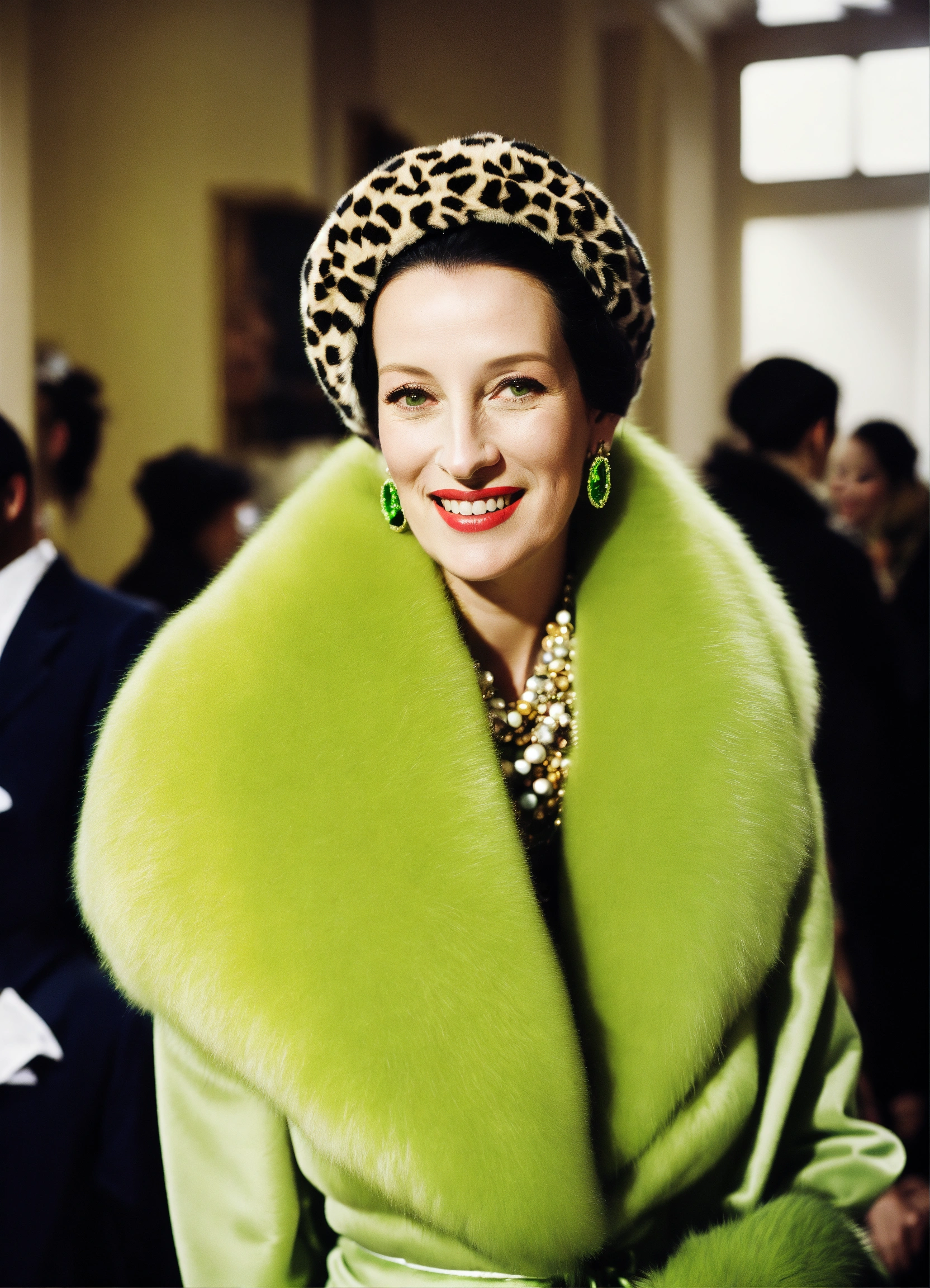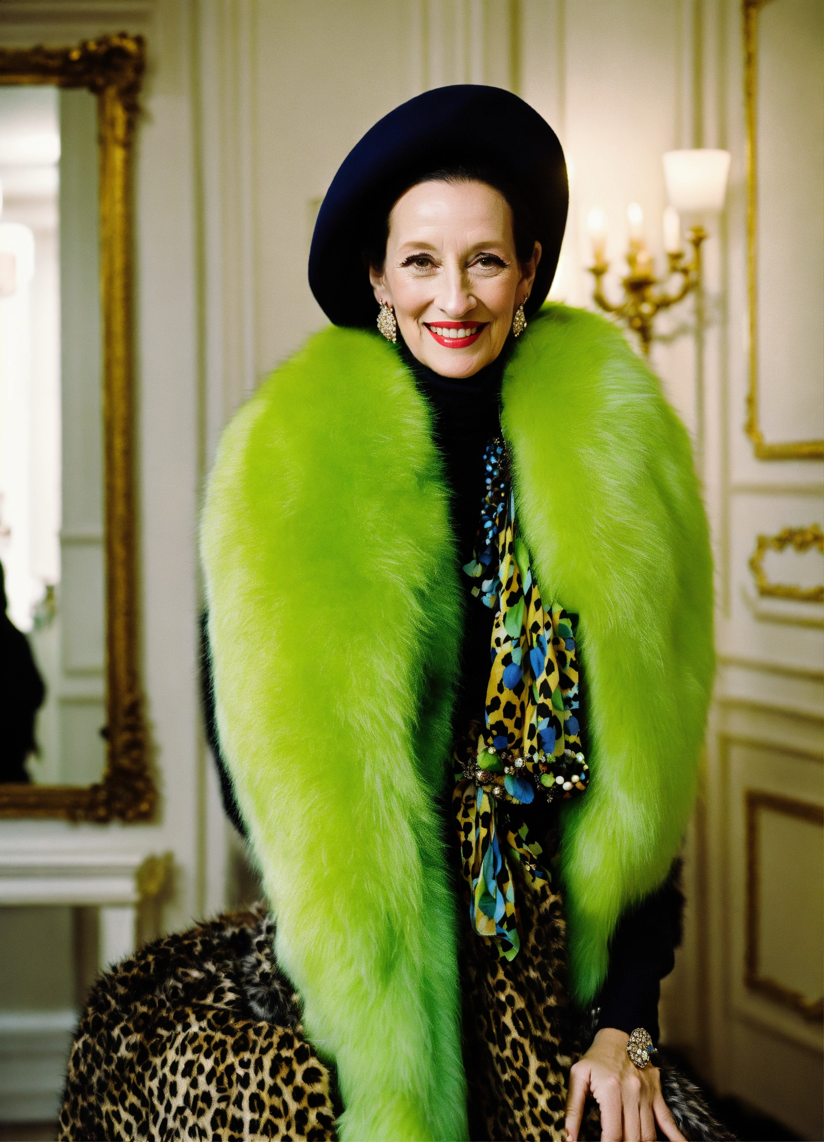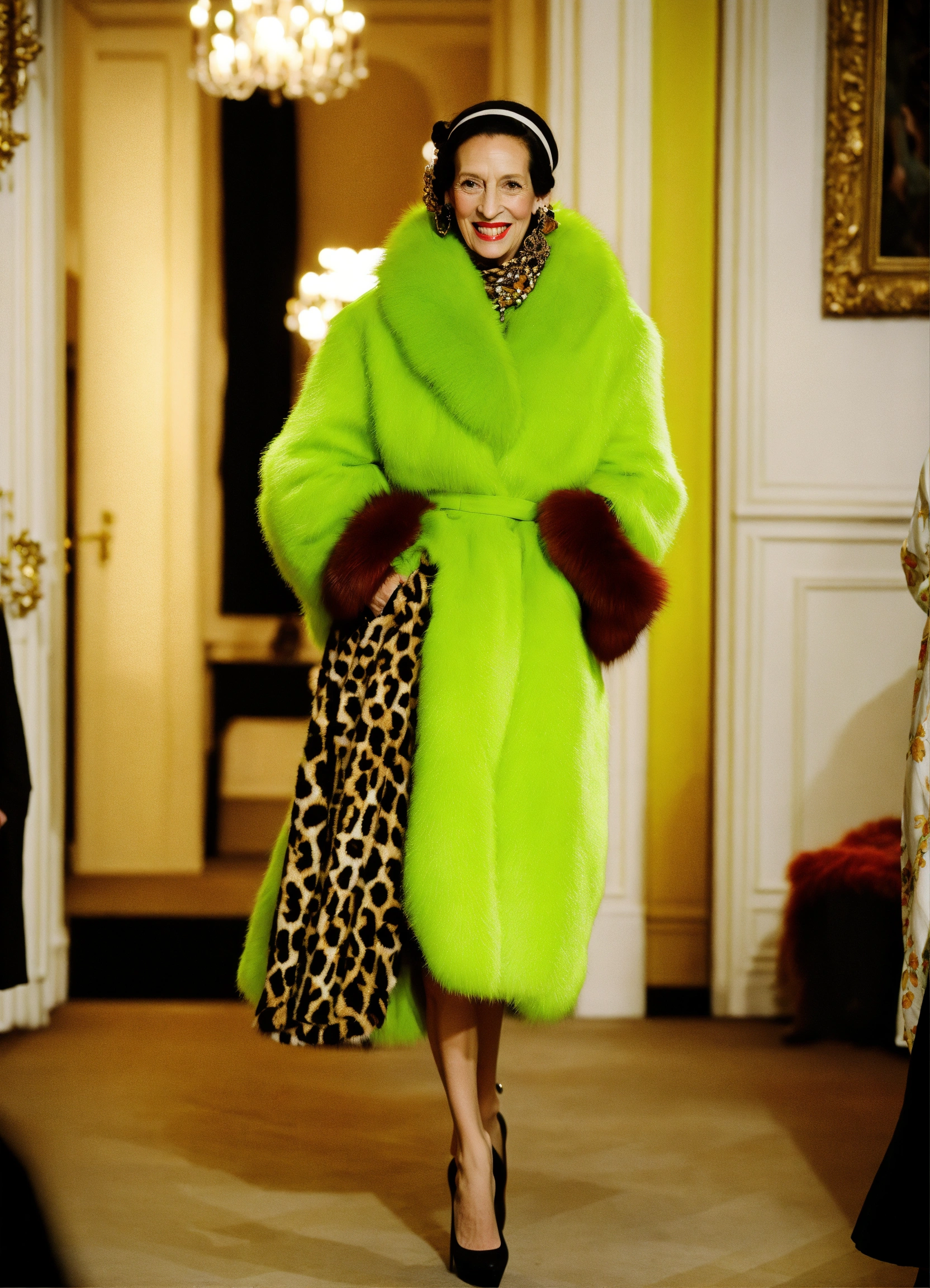 Photo of diana vreeland of grey gardens scarf covering scalp smiling as a runway model catwalking, wearing her scarf and her usual clothing style either skirt and brooch or fur coat on runway in a parisian salon, boutique, montaigne avenue, bright space well, white walls, fluorescent green fur, leopard.
