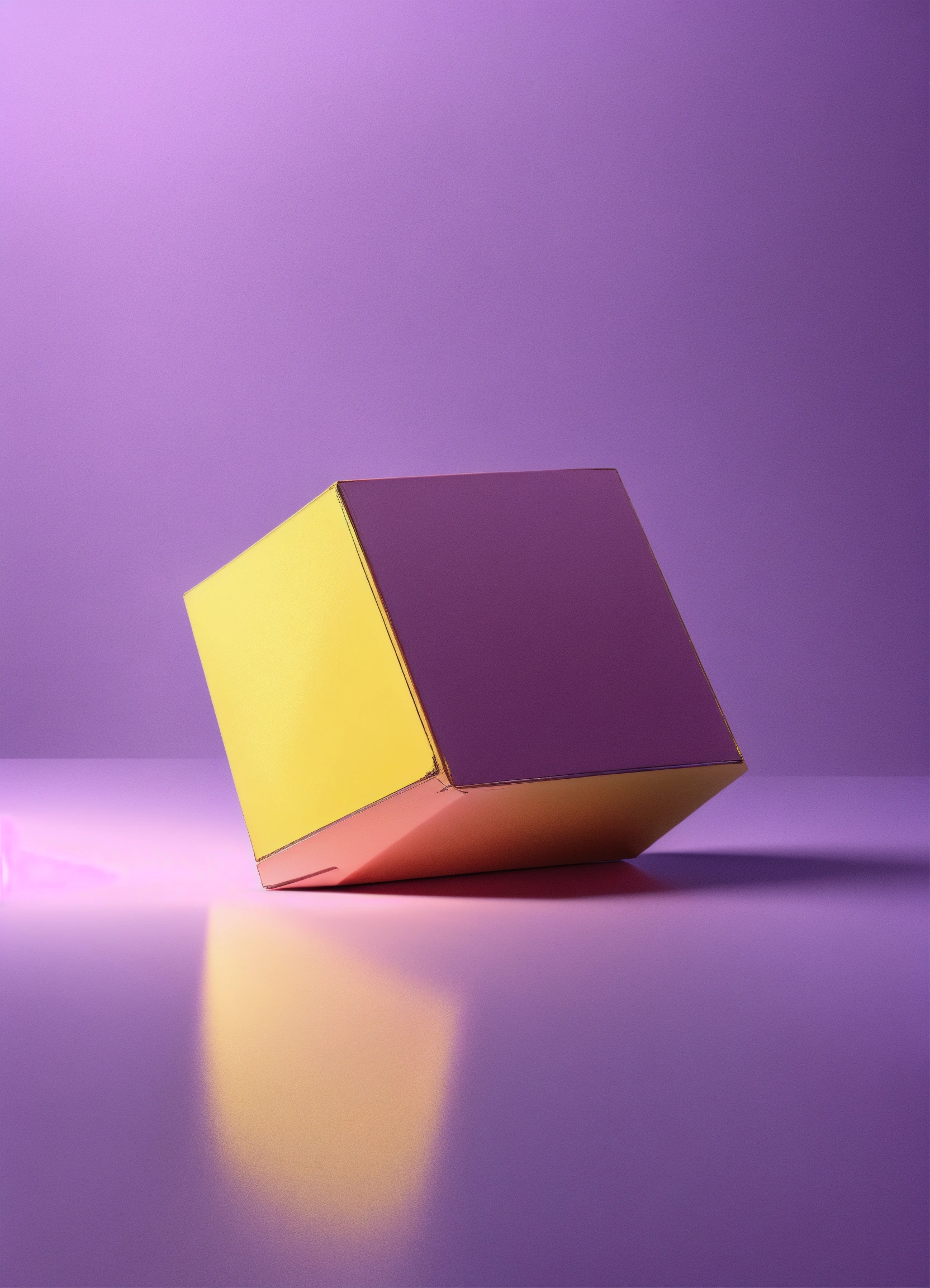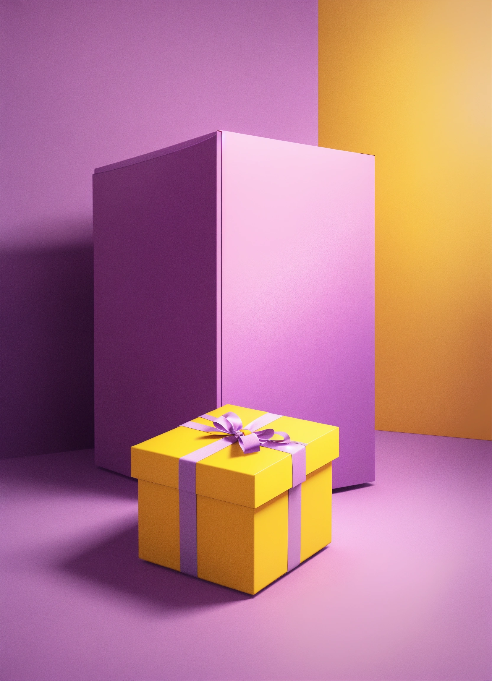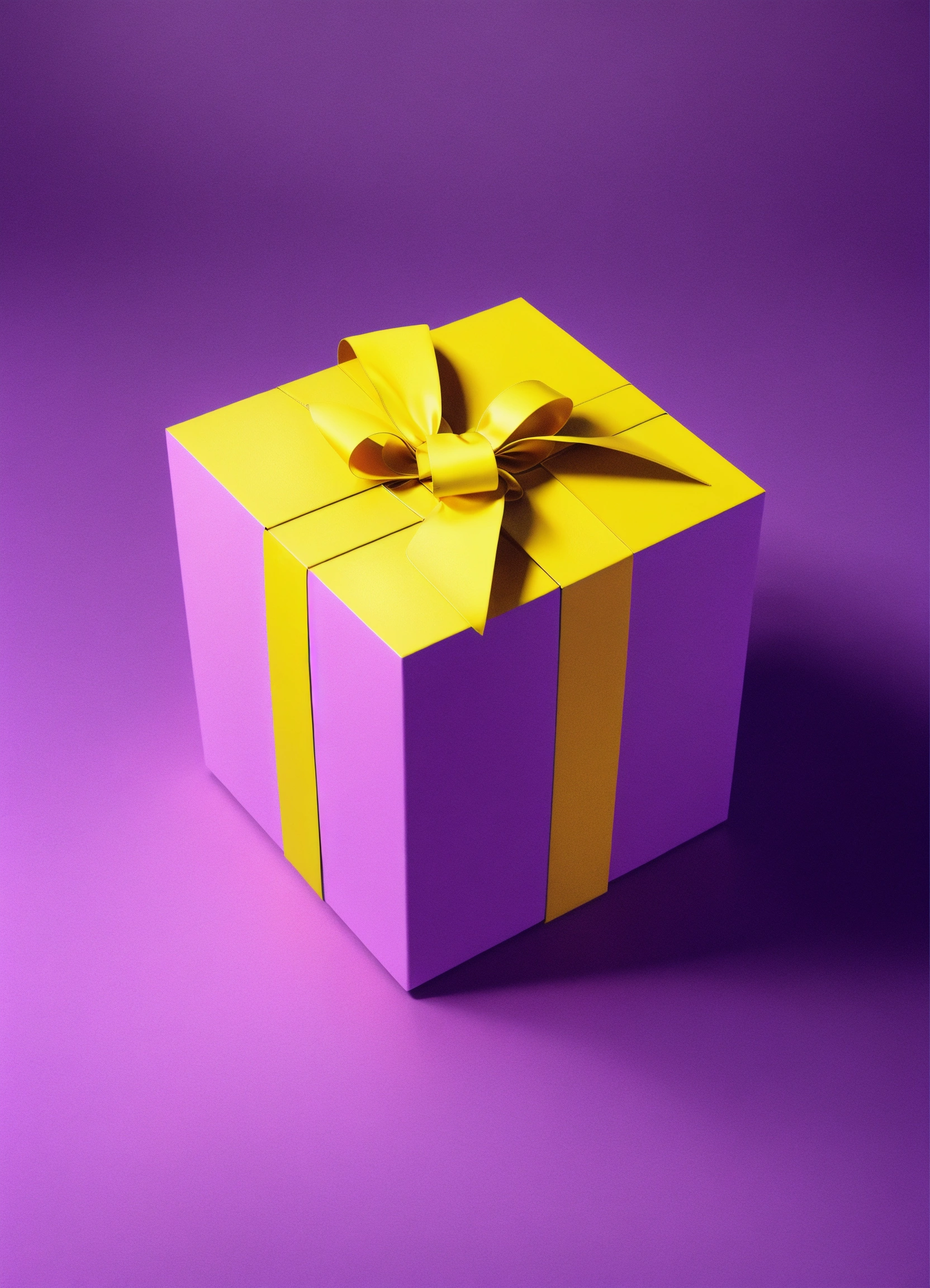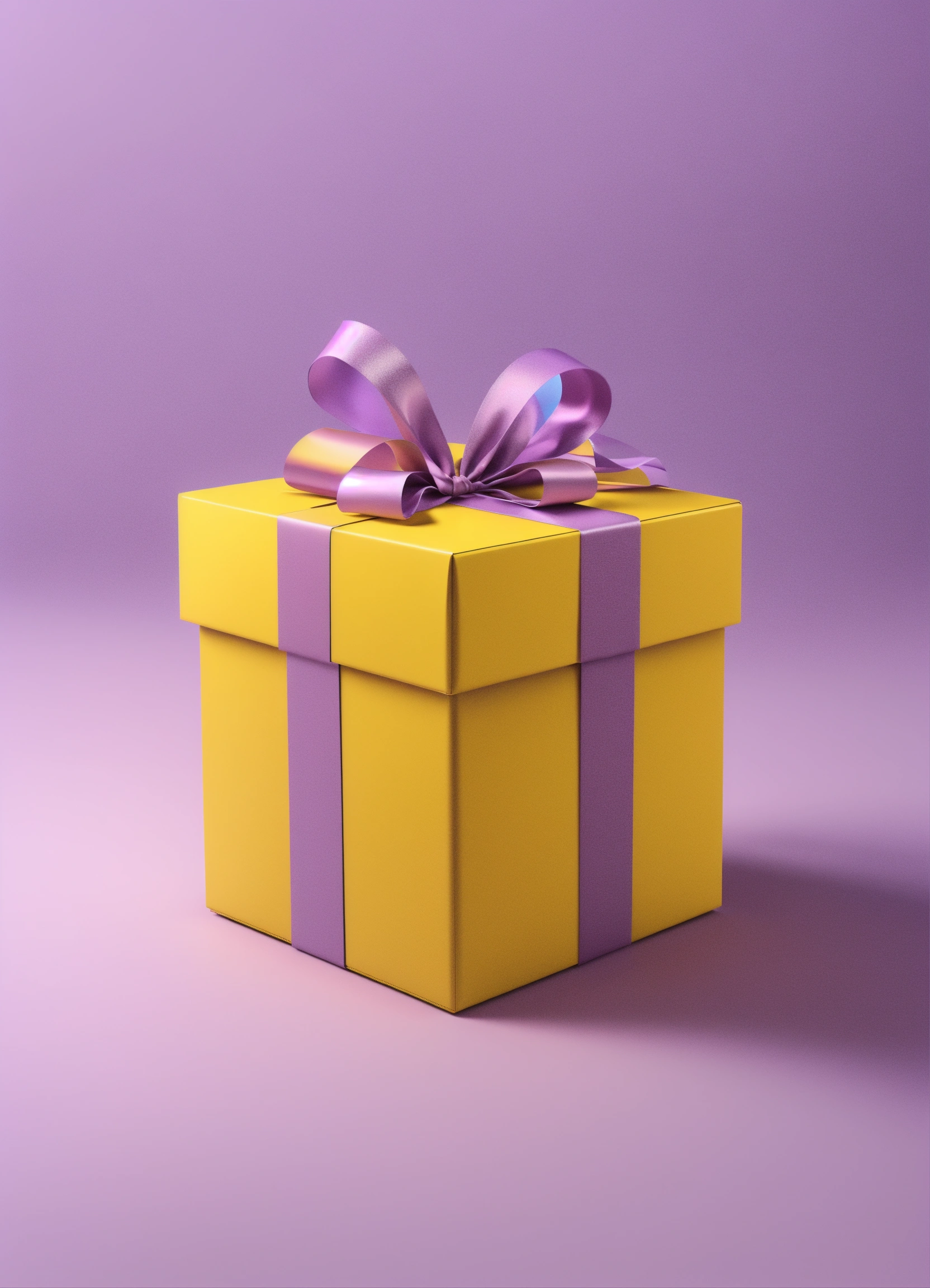 Ultra hd! realistic, pastel, dreamy, realistic, futuristic, sharp focus, octane render! digital art, photorealistic, soft, minimal, emptyness, background, giant yellow present box on violet background