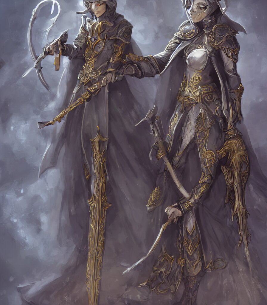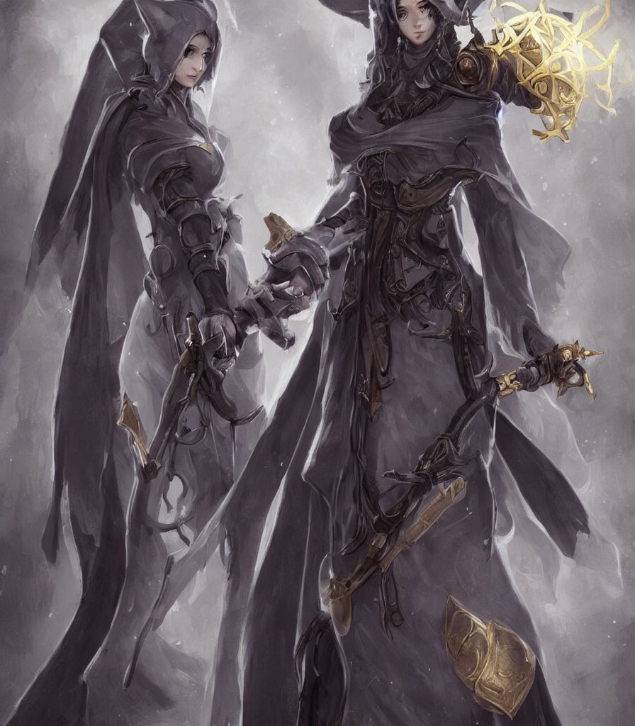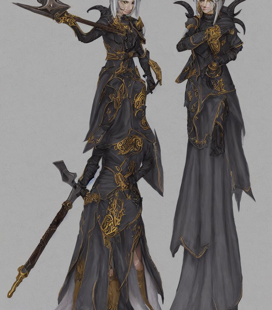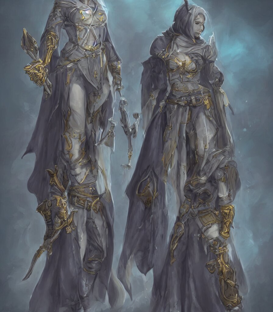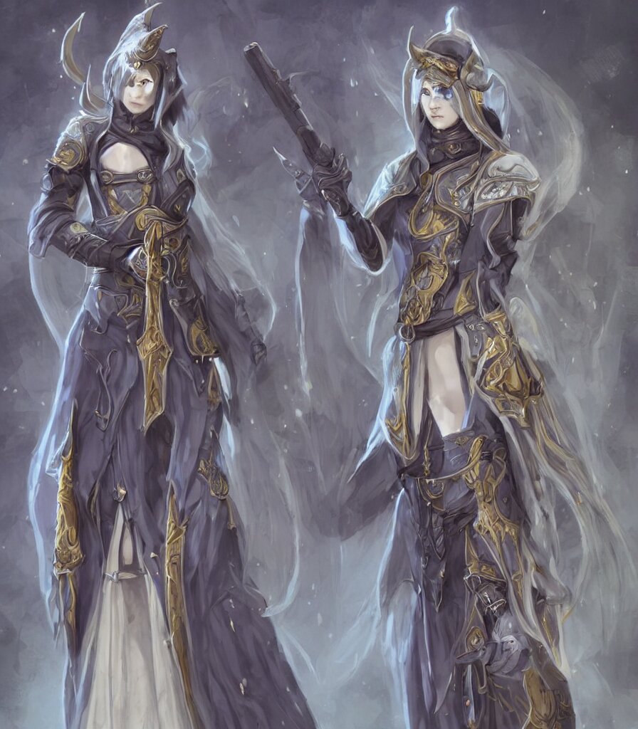 Female character concept, tiefling cleric gunslinger holding pistol, final fantasy concept, full body, grey skin, fine detailed, demon tail, blue cleric priestess robe with golden embroidery, nun veil, final fantasy character art, game character design, dark fantasy
