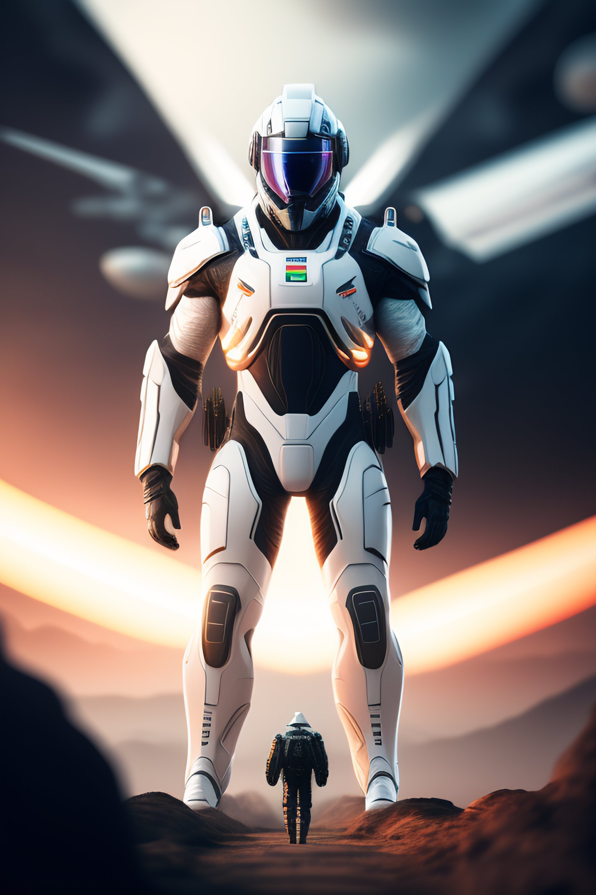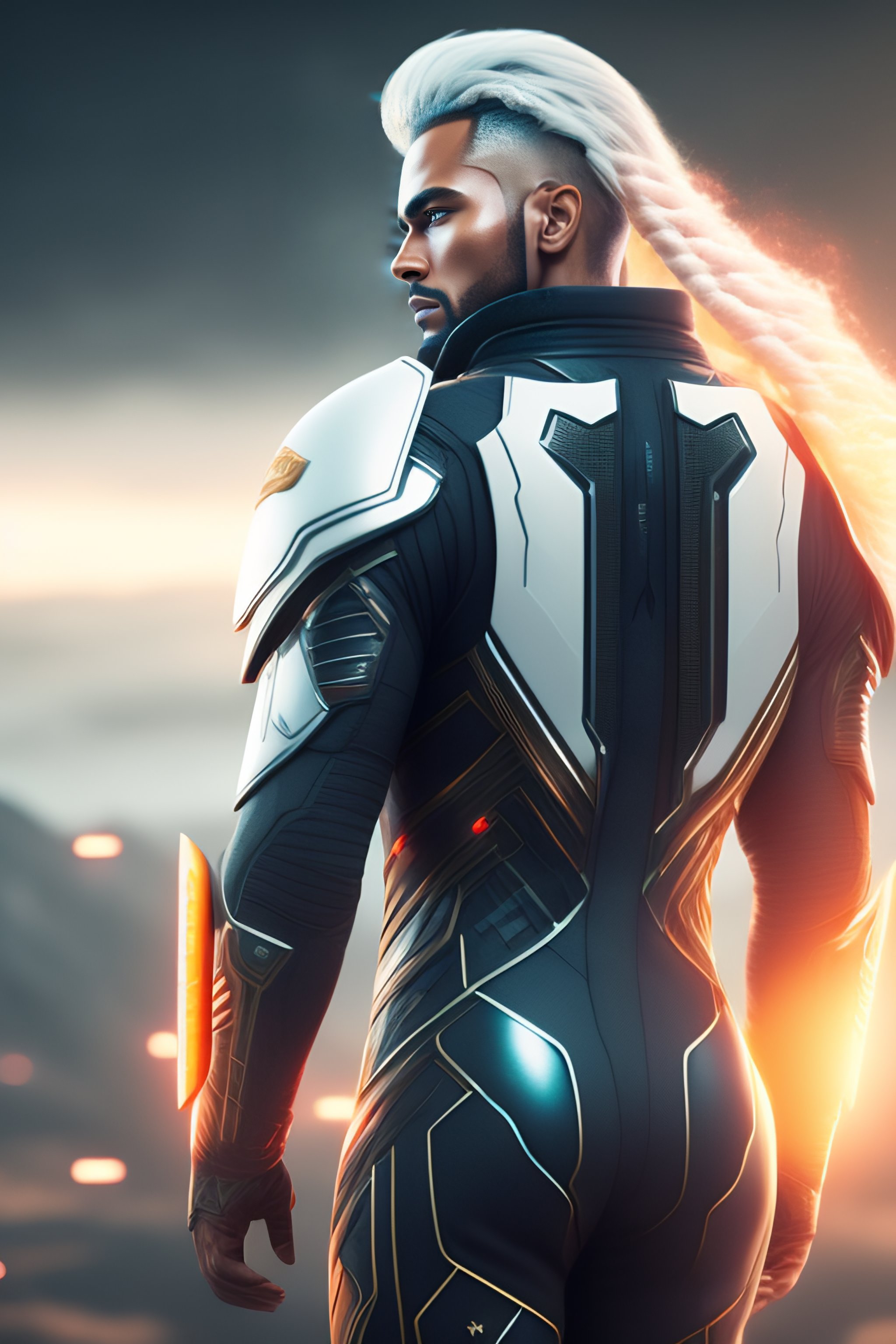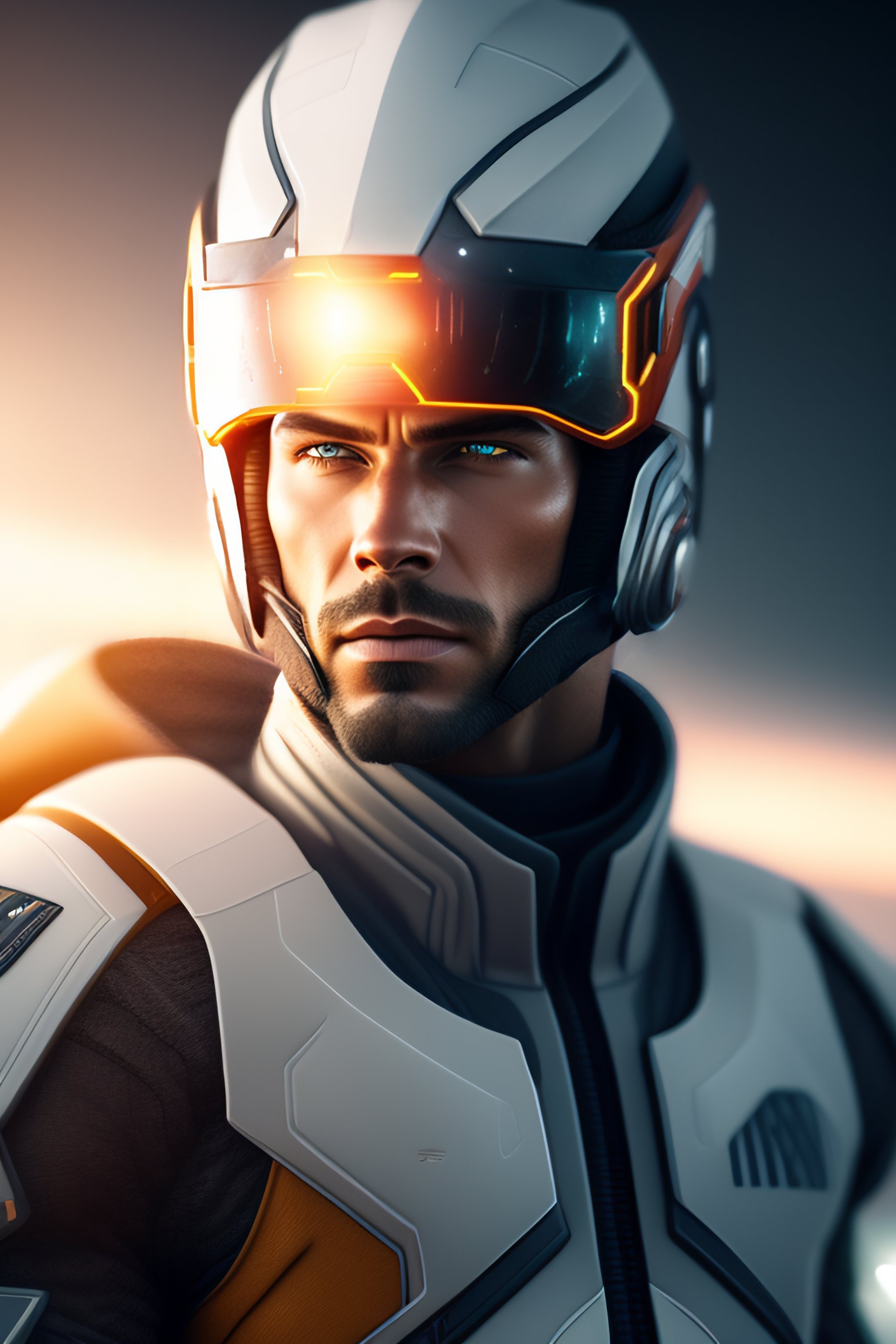 (extremely detailed cg unity 8k wallpaper), action shot illustration of a (((badass man sci-fi soldier))) with ((white hair)), ((wearing an advanced futuristic pilot suit)), standing on a flying glider
