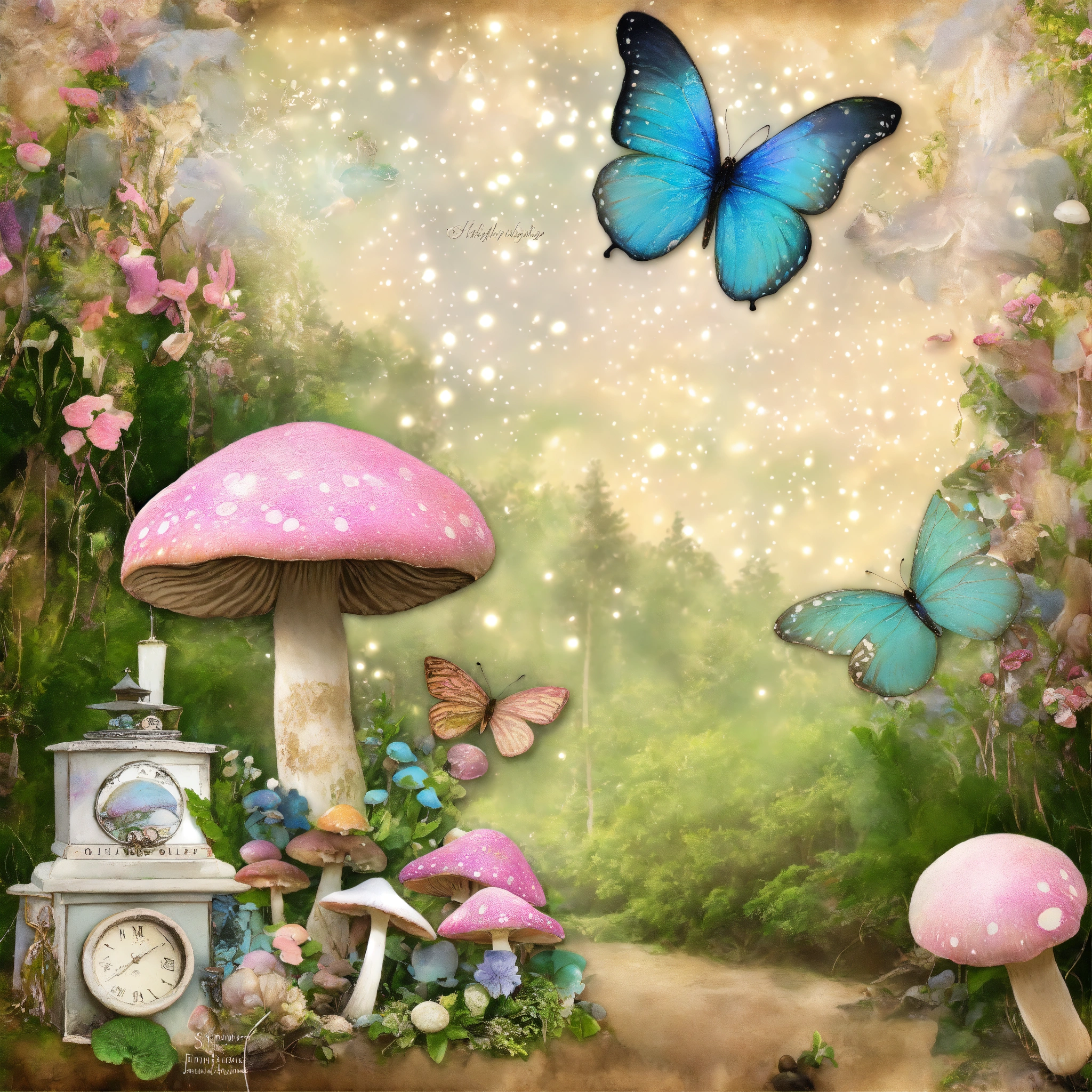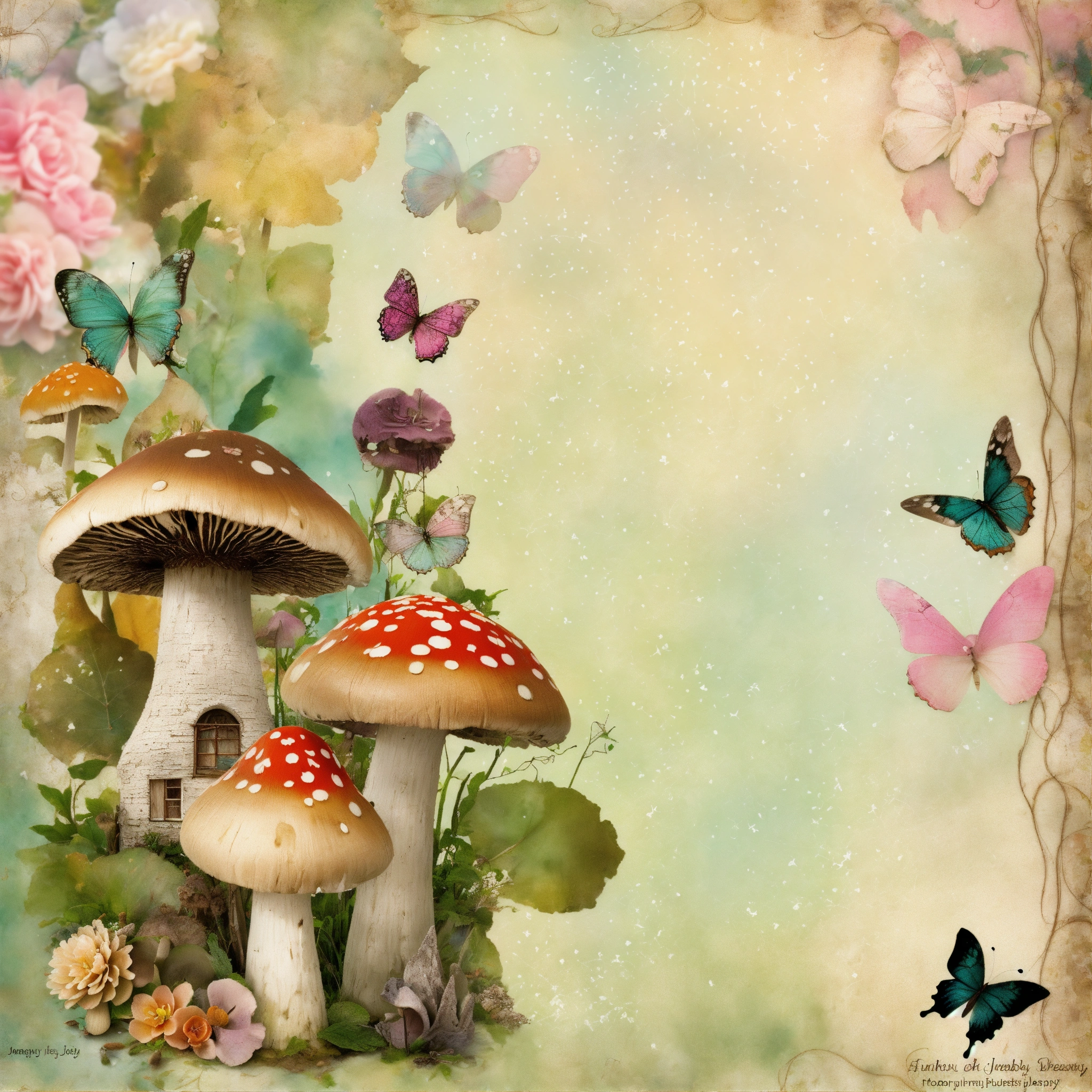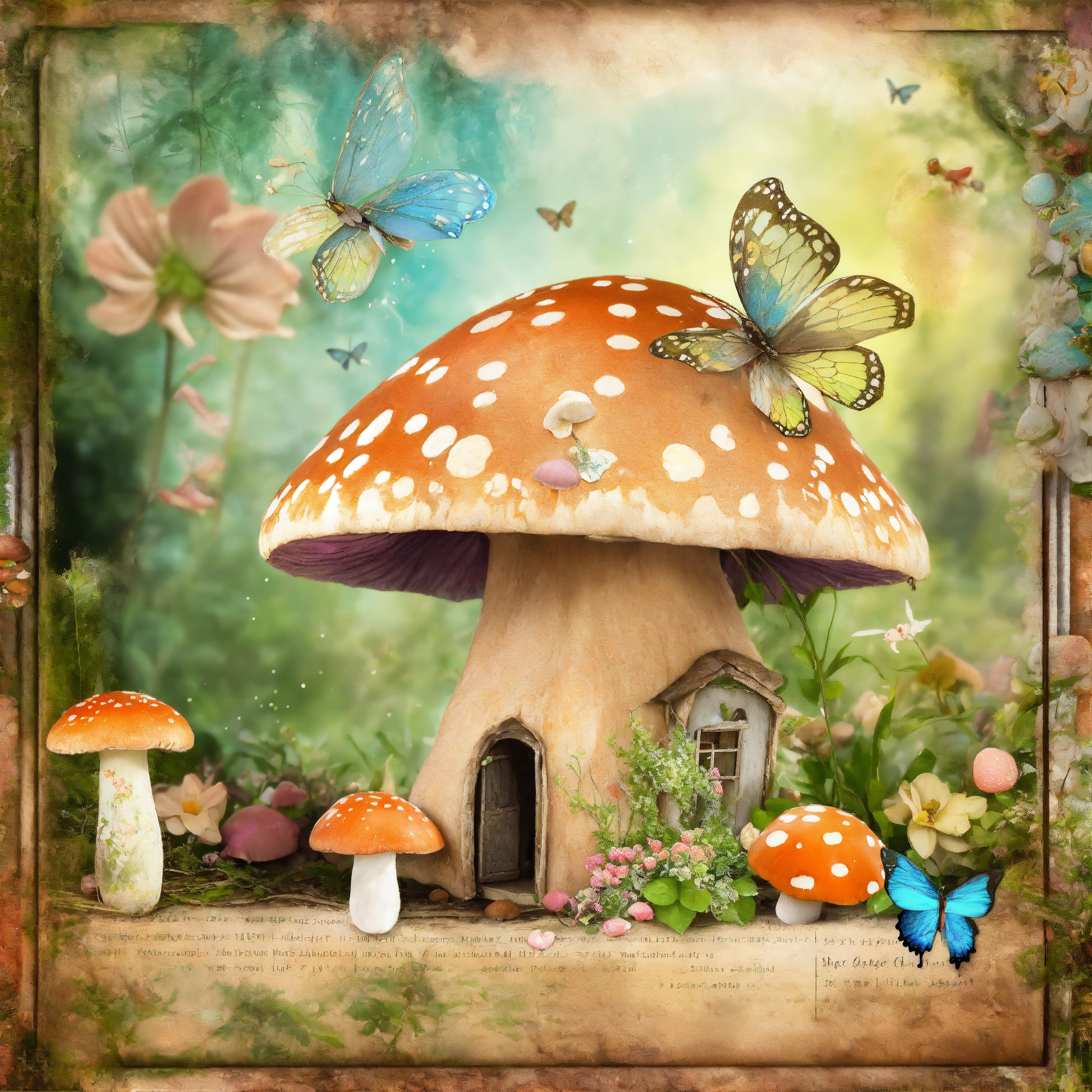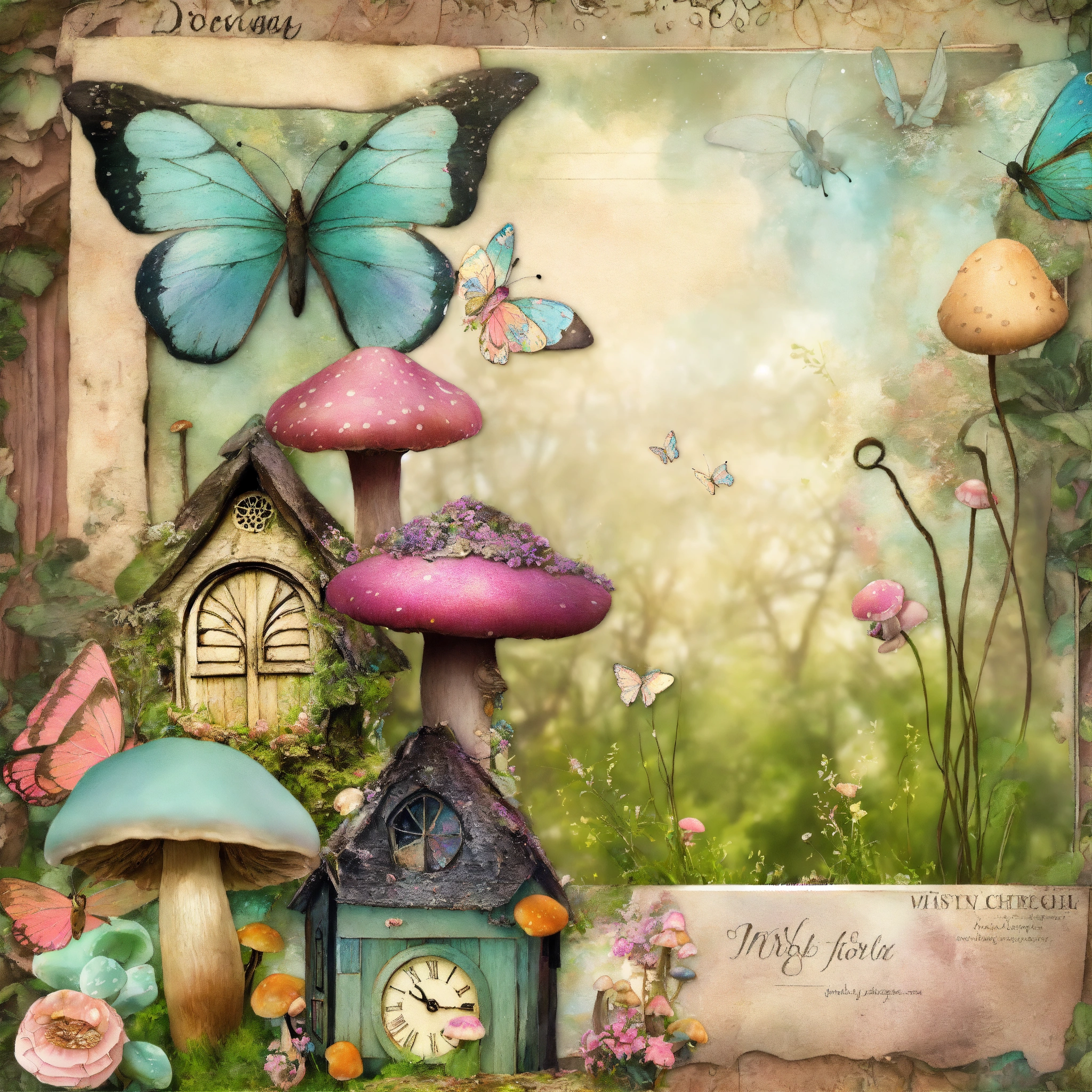 Shabby chic dreamy mist pastel junk journals mushroom cottage forest junk journal kit textured mixed media fantasy fairy garden butterfly cottage digital paper scrapbook printable page swirling magical fairytale abstract art style