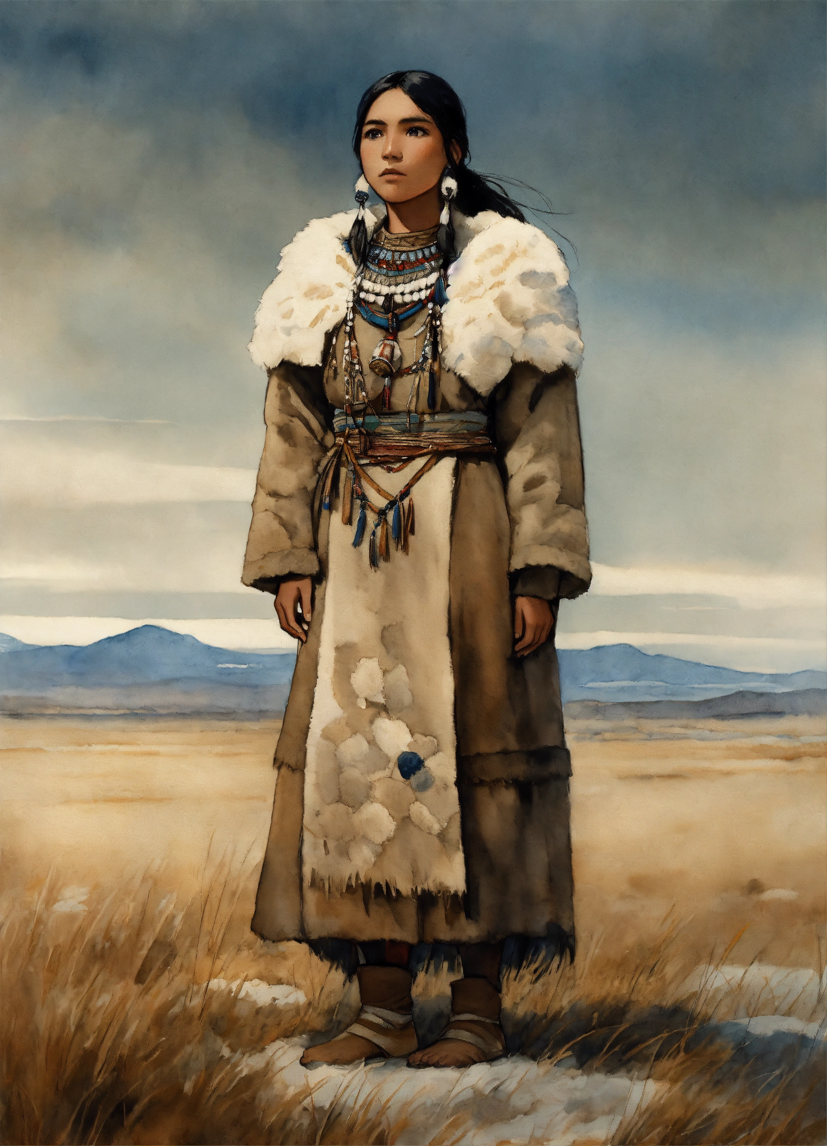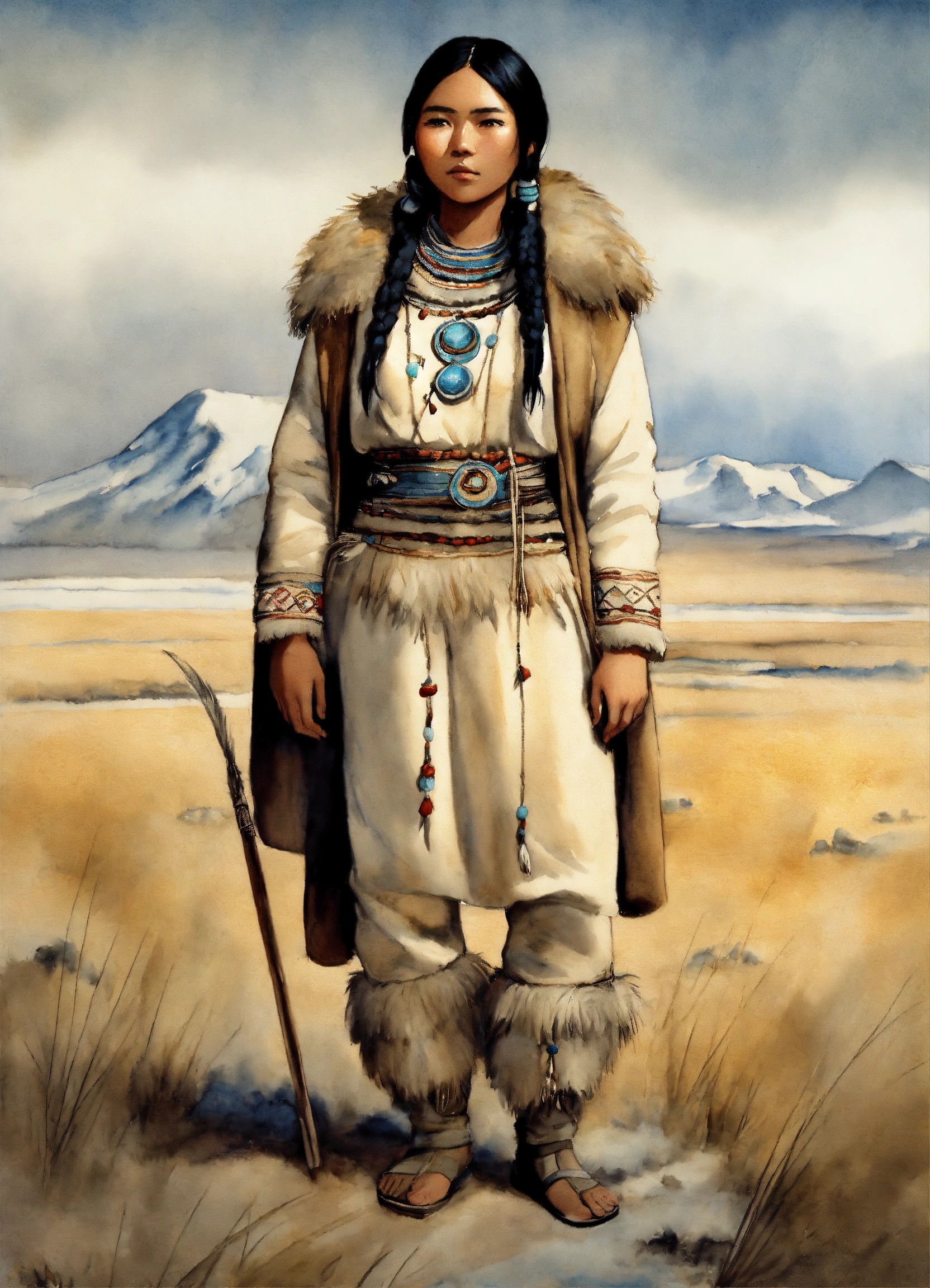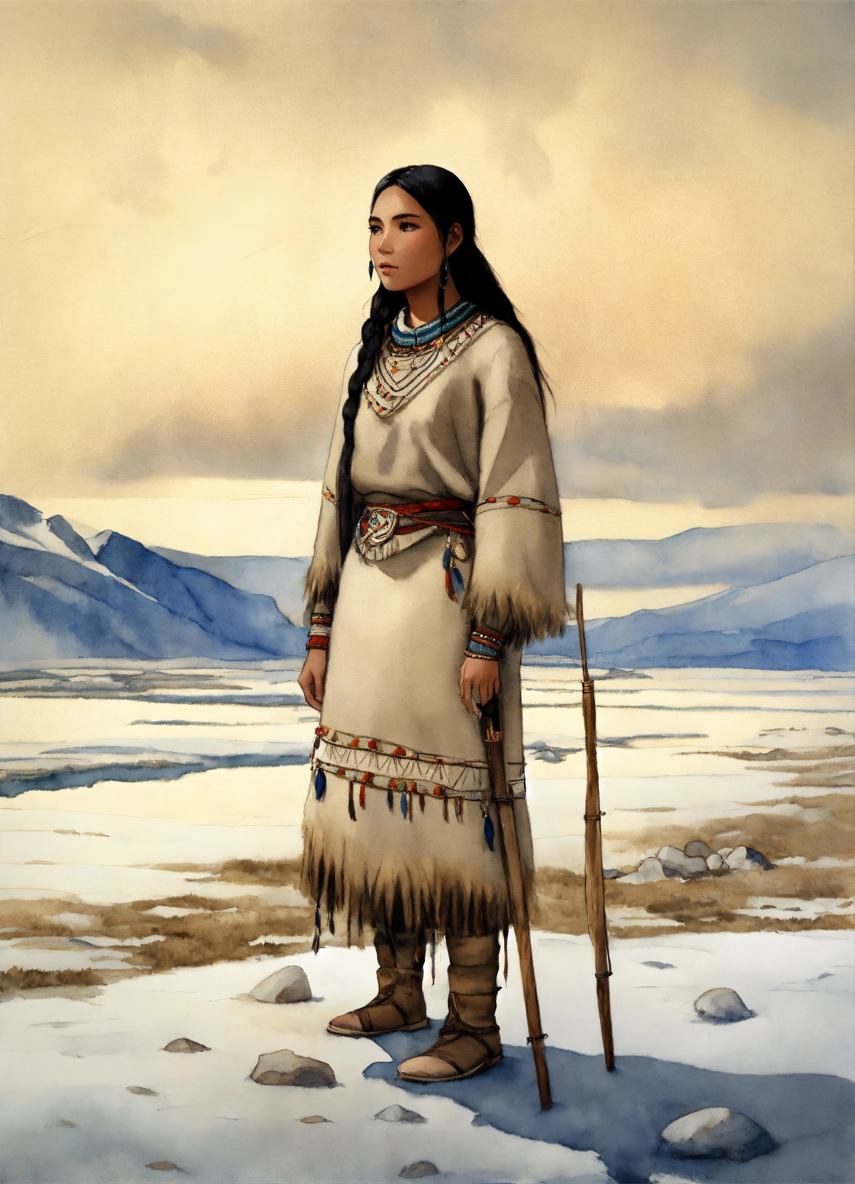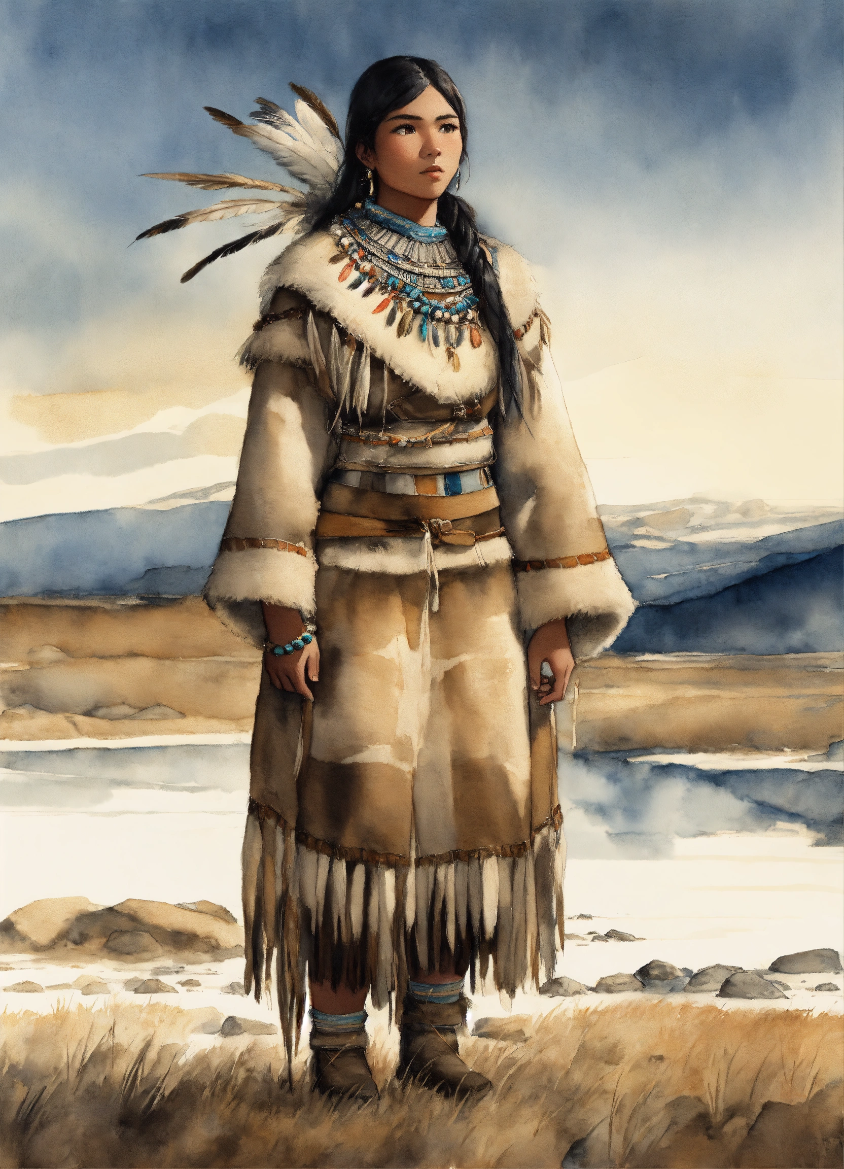 Full body illustration of an inuit woman, navajo phenotype, young, 18 years old, beautiful, wearing stone age clothing made from natural fabrics like linen, cotton, or furs, adorned with feathers, beads and shells, stading on the steppe tundra landscape, watercolors, gloomy and depressing ambient, artwork by tom björklund