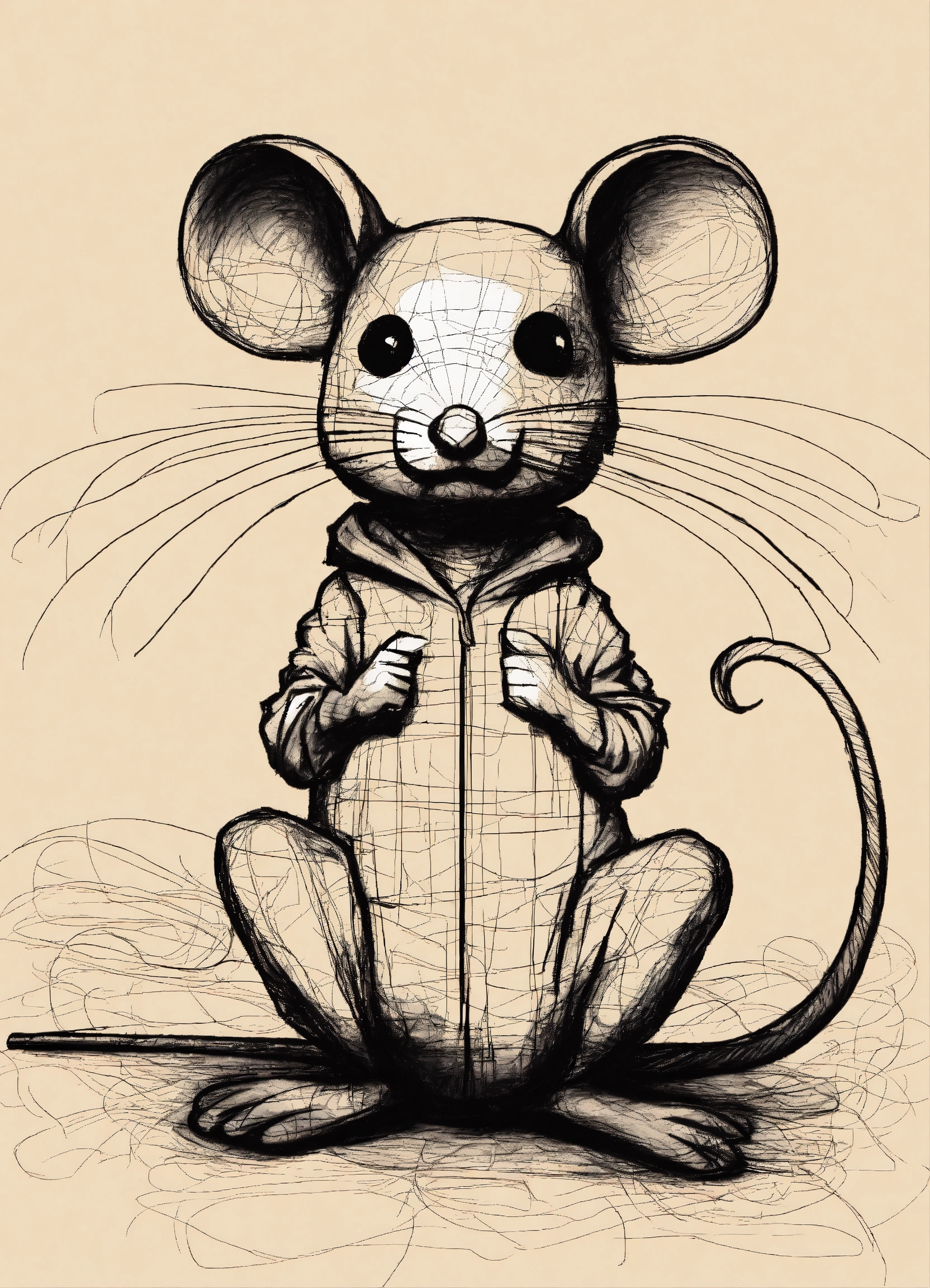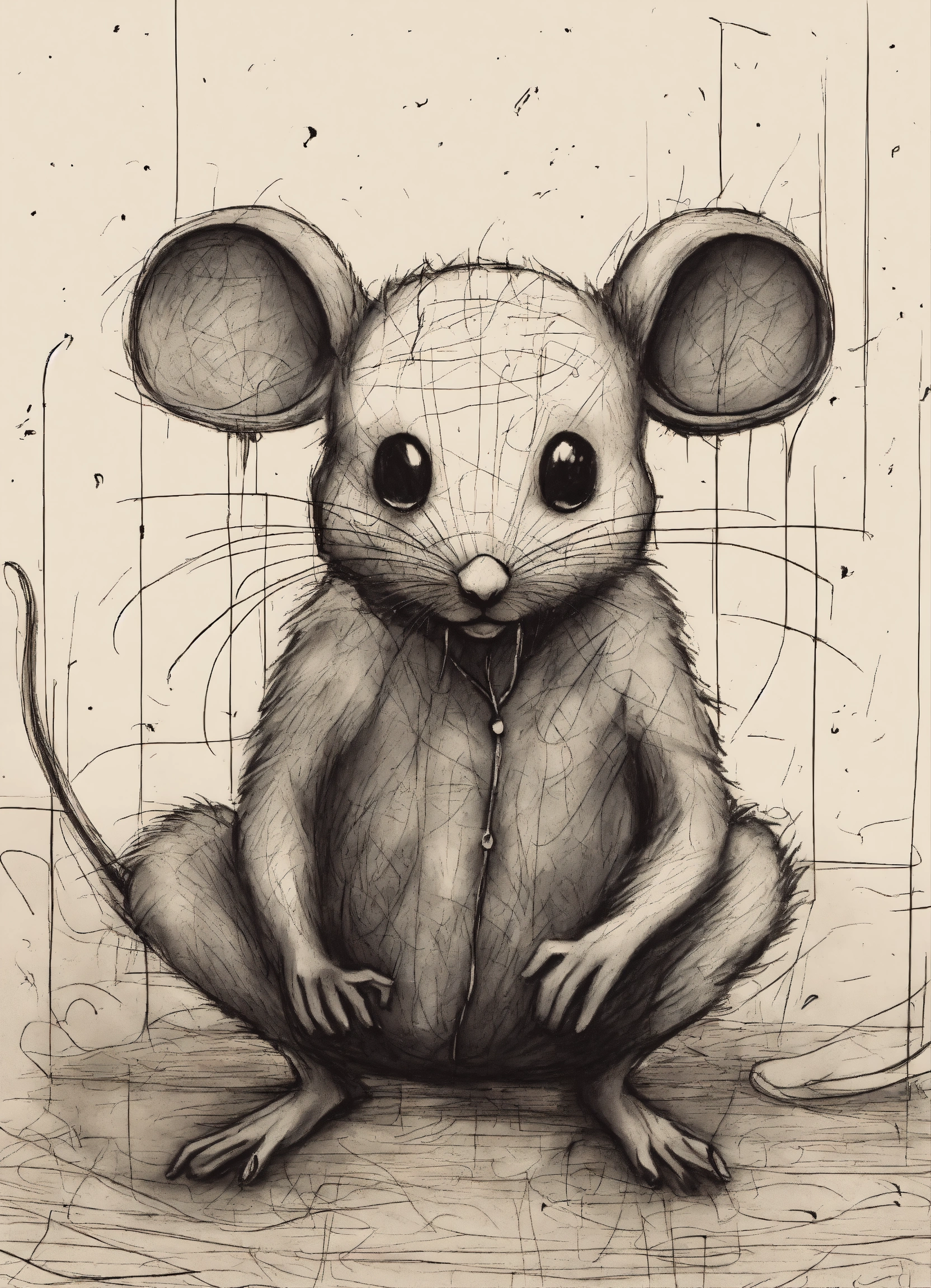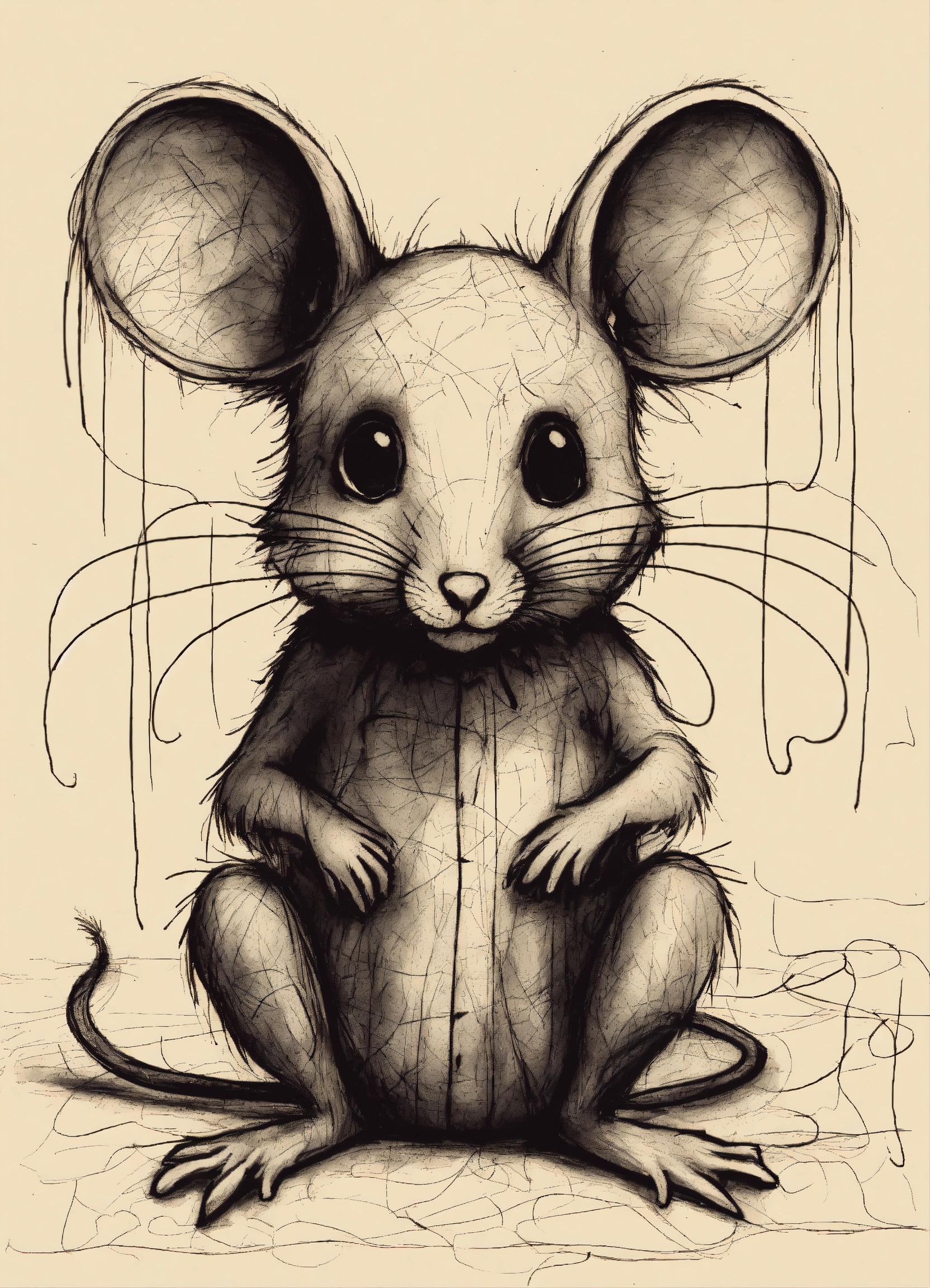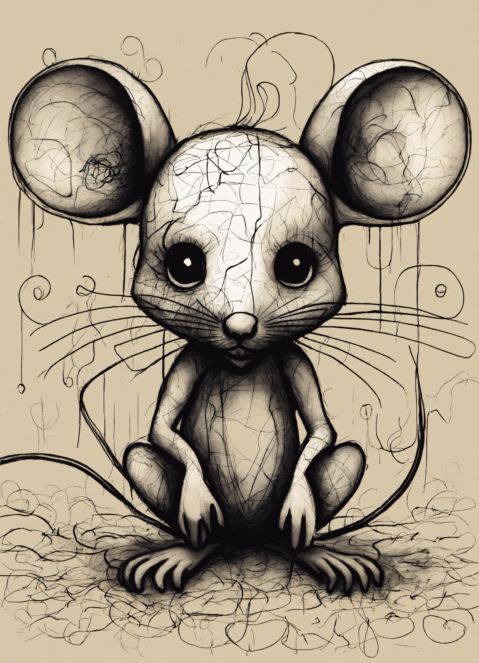 Sketch of a the manifestation of anxiety as a creepy mouse, pen sketch, chaotic, minimalist, ((anxiety))