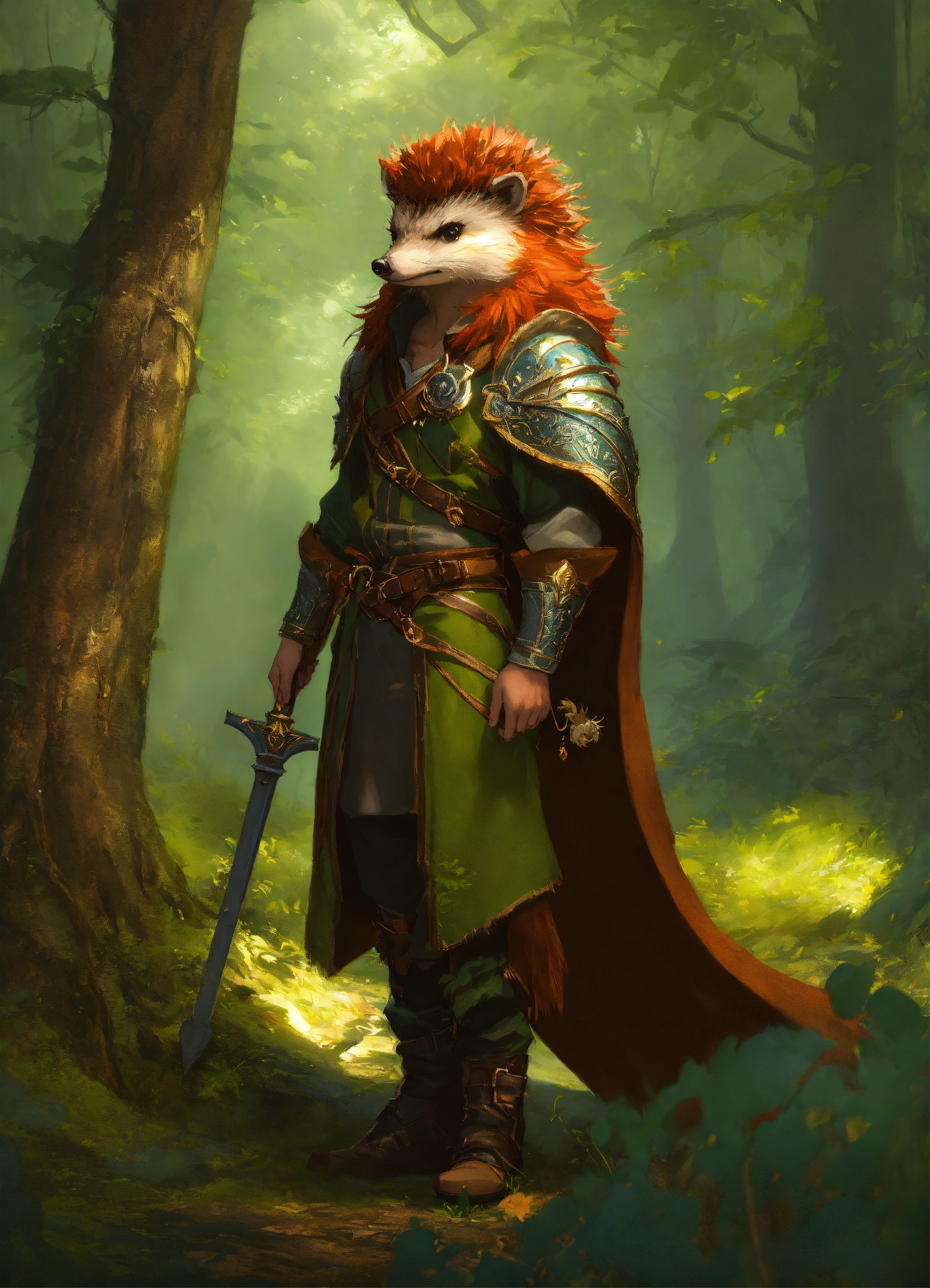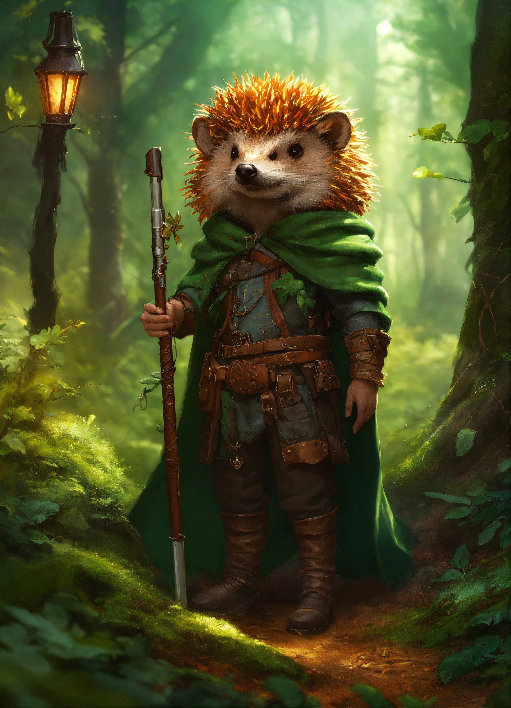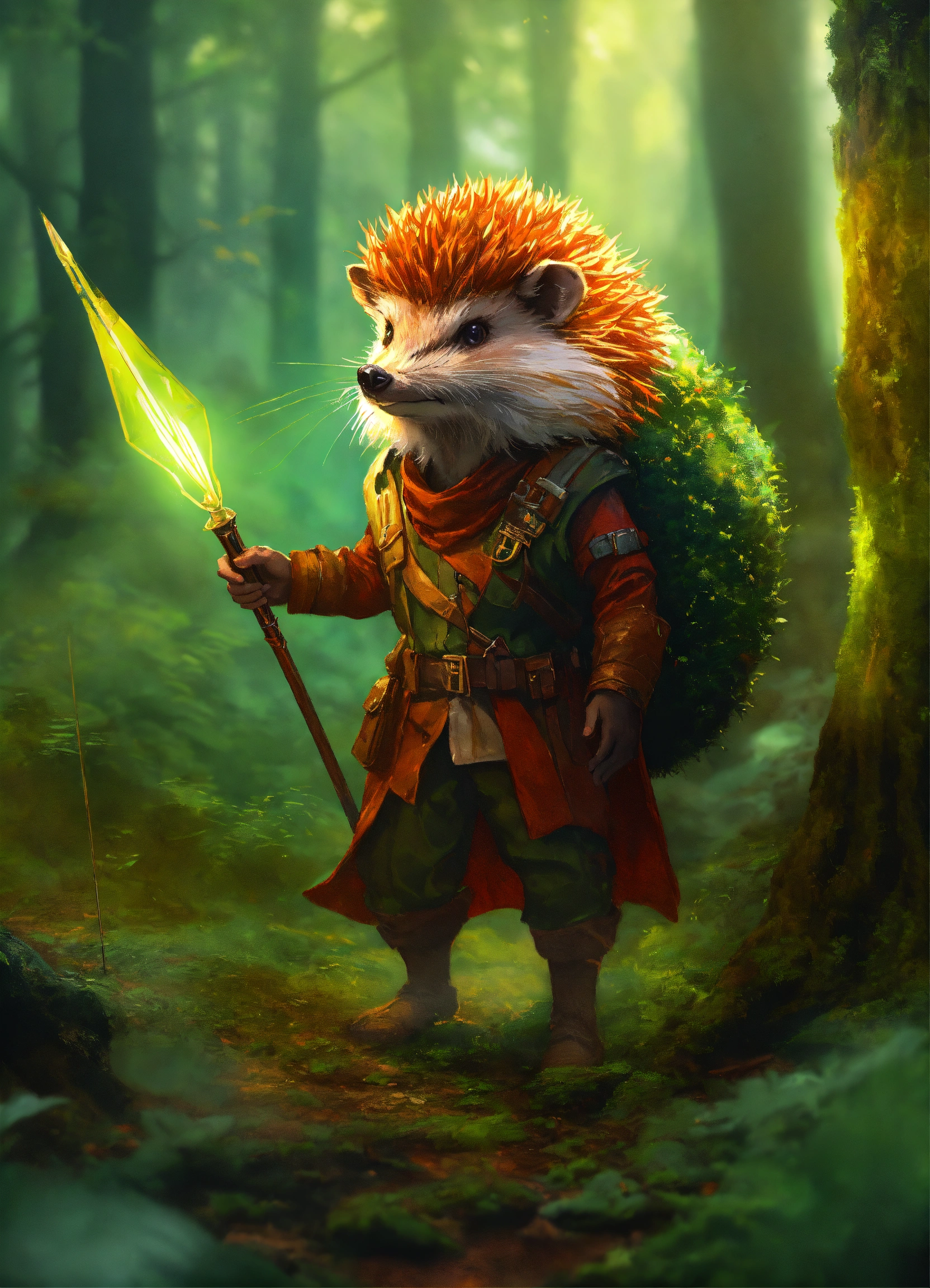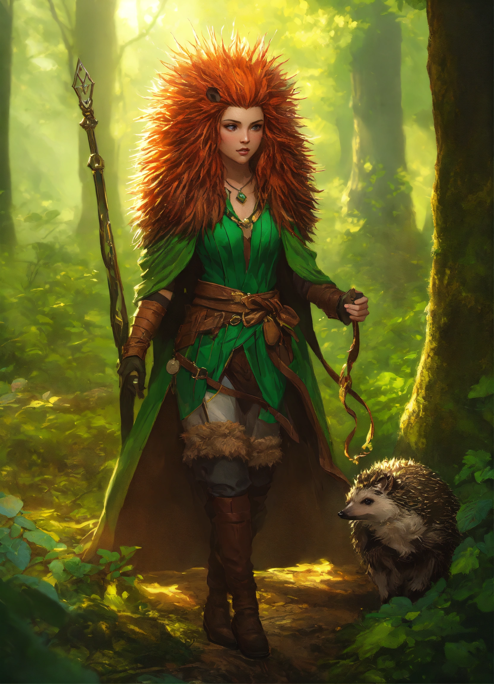Hedgehog druid woomenhedgehog red - haired long-legged, with hair needles in a forest, outfit in shades of green and browns, portrait, gaia, nature, forest background, magic the gathering artwork, d&d, fantasy, cinematic lighting, centered, symmetrical, highly detailed, digital painting, artstation, concept art, smooth, sharp focus, illustration, volumetric lighting, epic composition, 8k, art by akihiko yoshida and greg rutkowski and craig mullins, oil painting, cgsociety