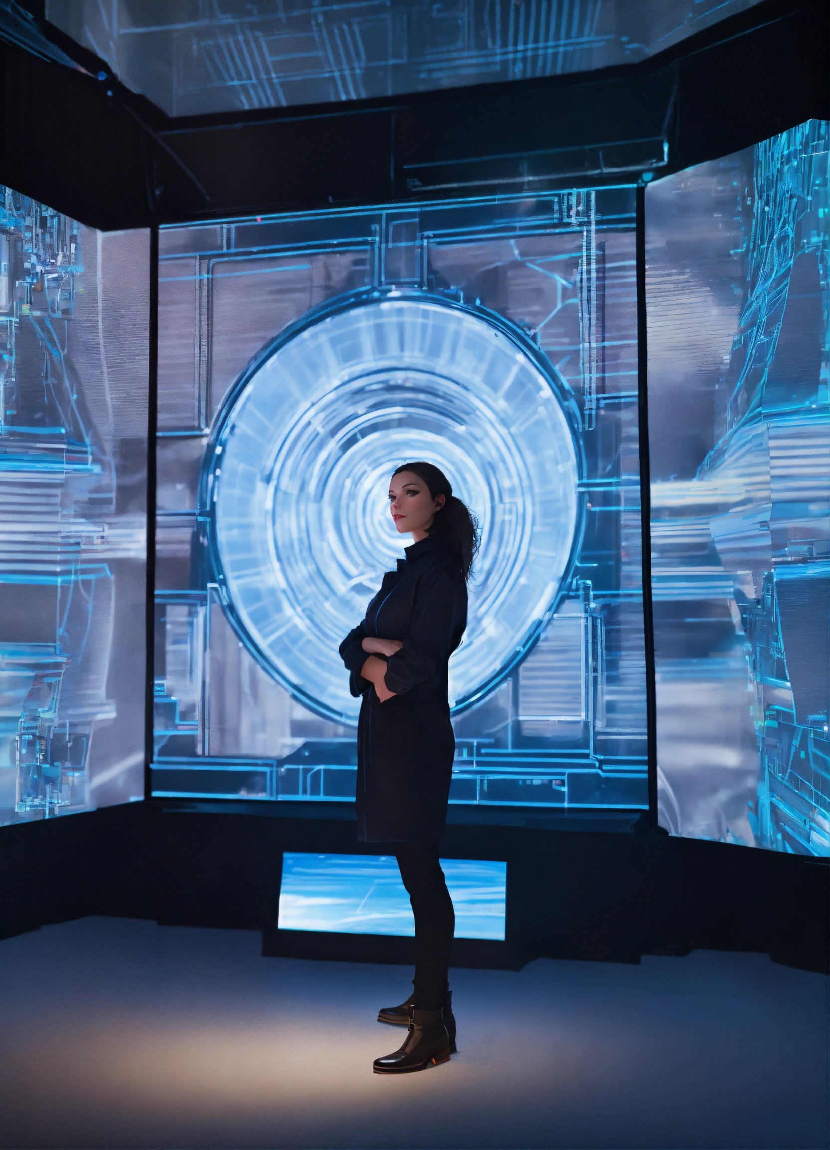 Nice woman, working in a futuristic computer a projection mapping in a facade, portrait, big futuristic hologram, corporative presentation
