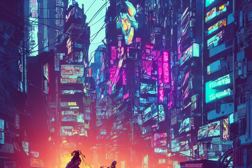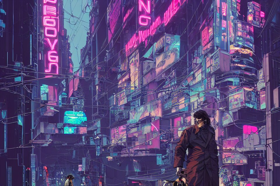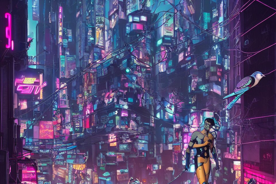 Cyborg feeding electric pigeons in front of a neon church, cyberpunk, neon noir, by josan gonzalez and tomer hanuka and geof darrow and brad rigney and greg rutkowski and moebius, ghost in the shell, blade runner, highly detailed, james dean as a cyborg, uhd, 8k, wet street, trending on artstation, bokh, dof