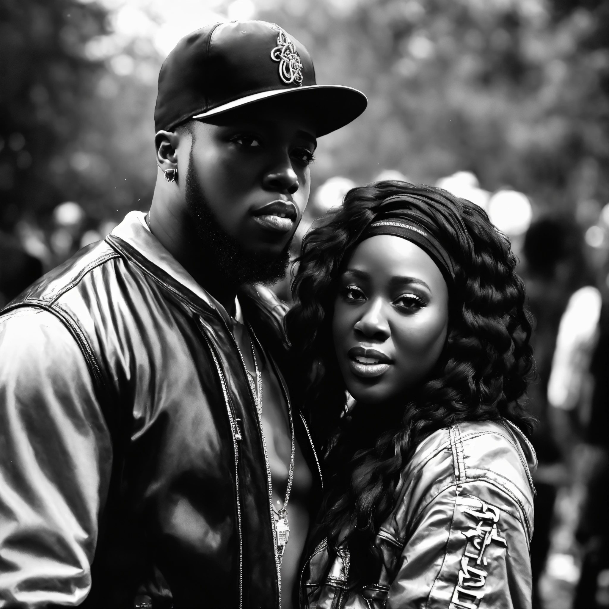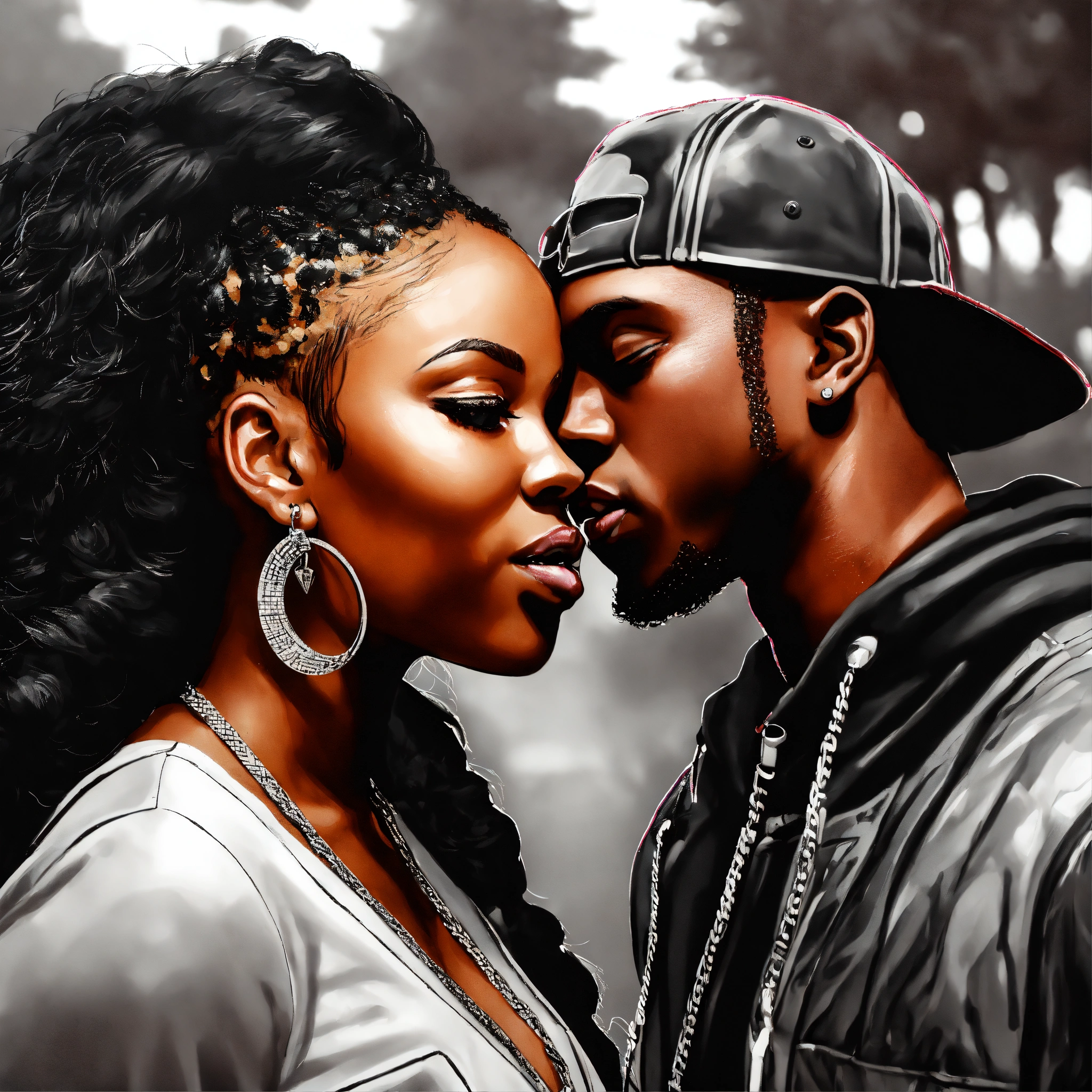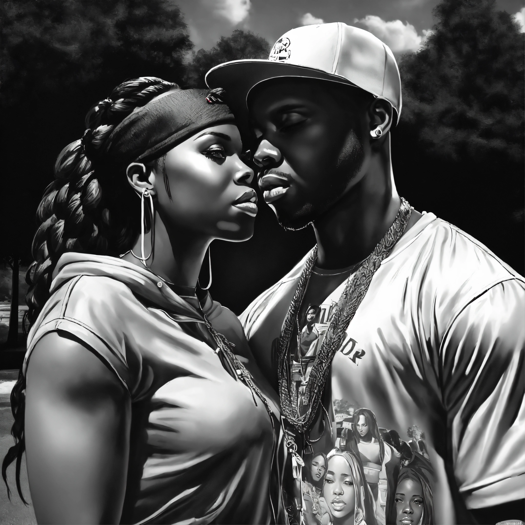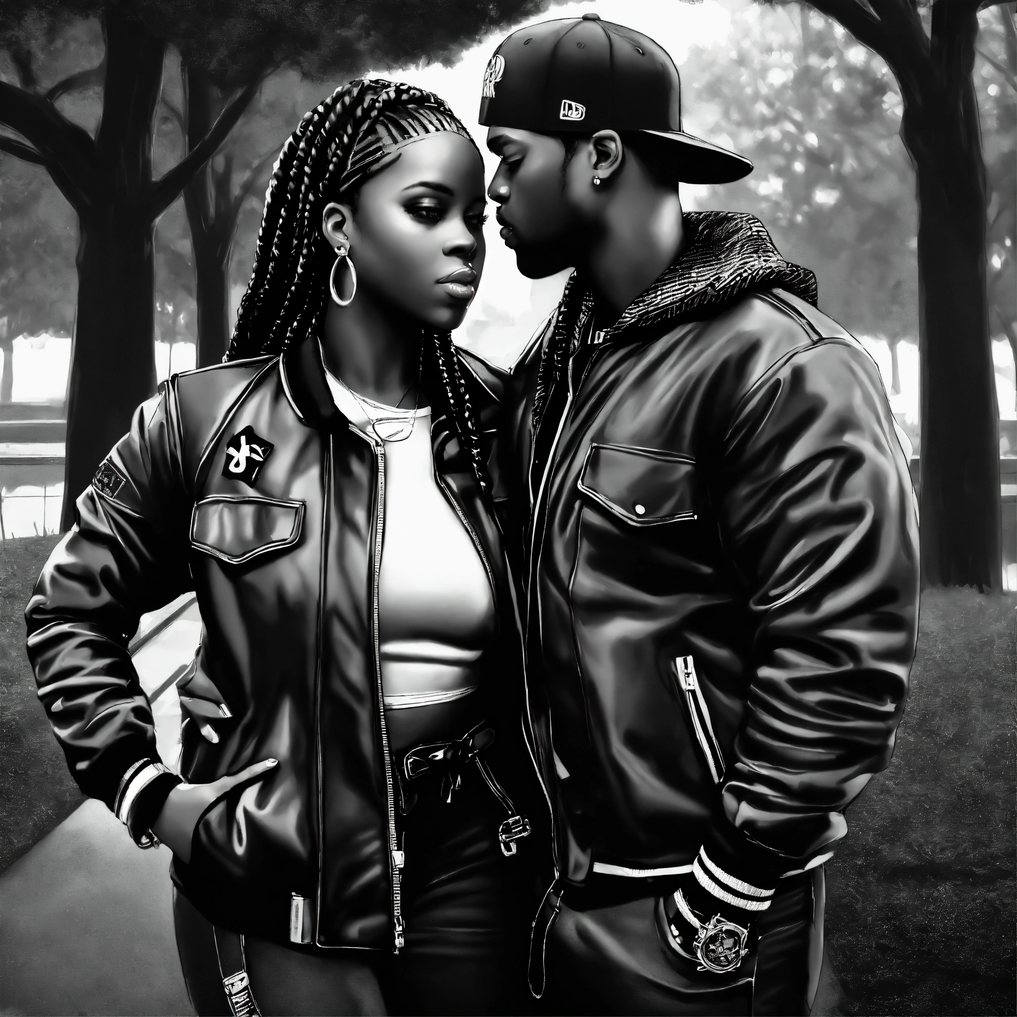 Pop art, hyperrealist portrait of black rapper "papoose" and black woman rapper "remy ma" embracing, walking in a park in love, black and white painting, fantasy art, photo realistic, dynamic lighting, artstation, poster, volumetric lighting, very detailed faces, 4 k, award winning