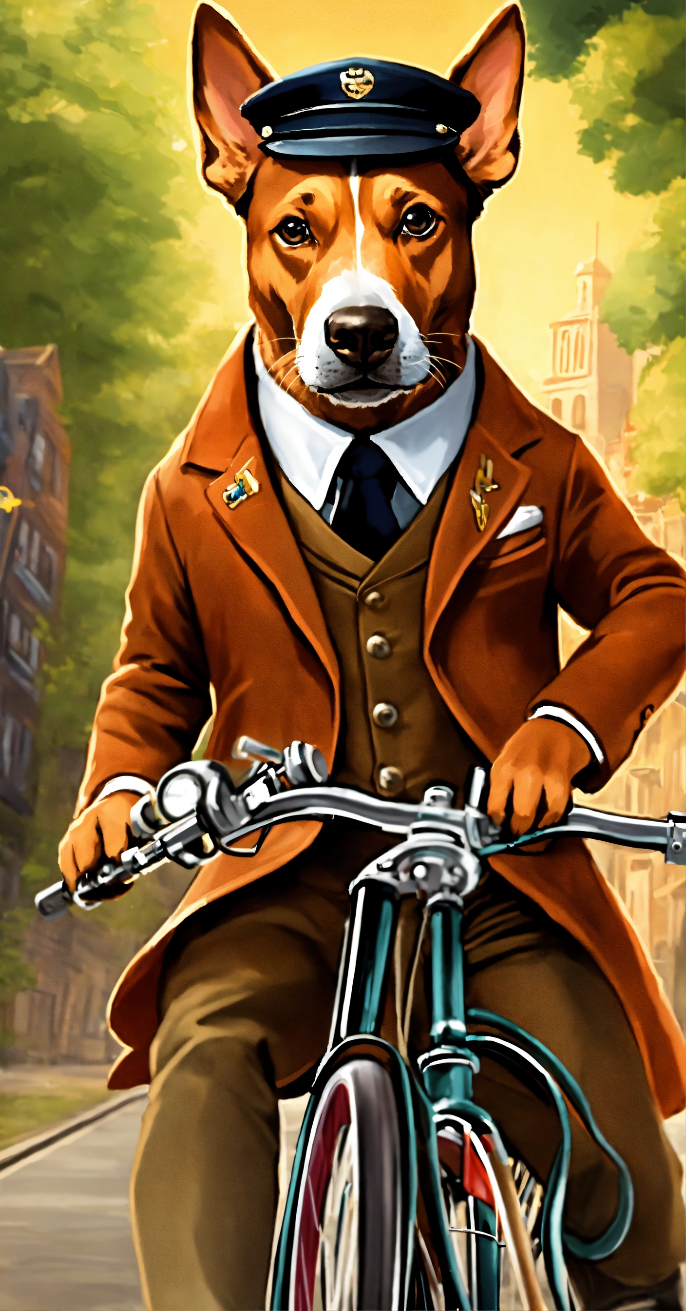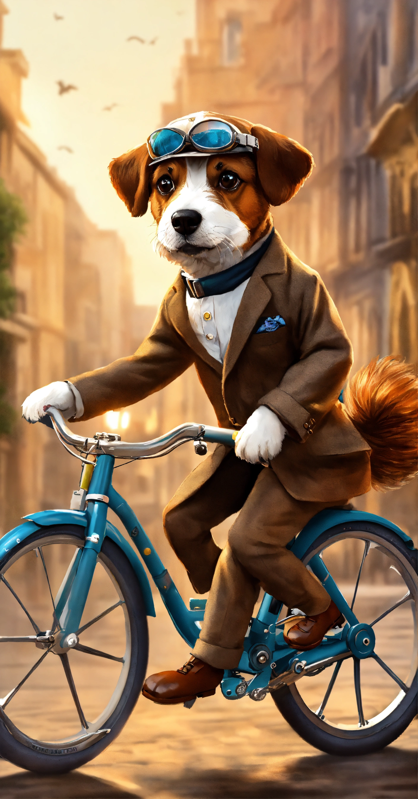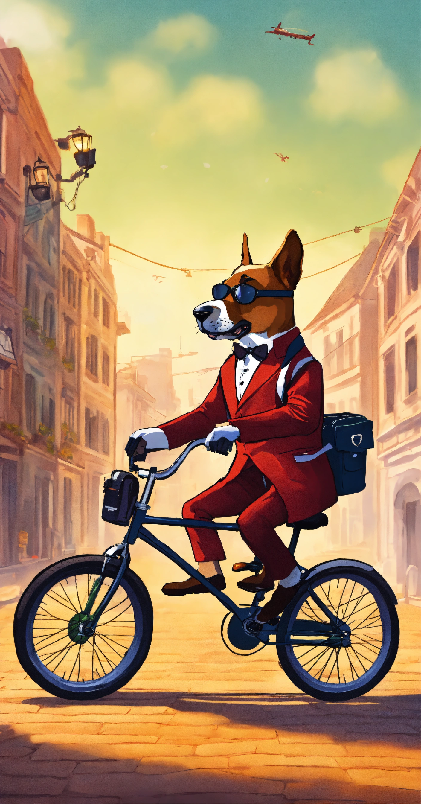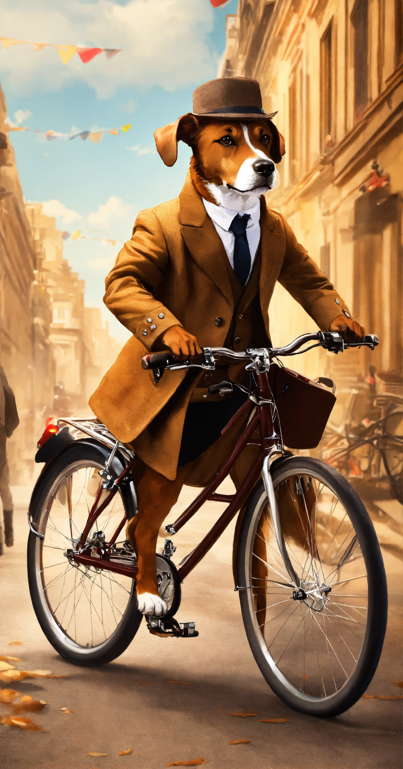 Design a picture of a dog as a dashing spy, riding a bike on a secret mission with spy gadgets hidden in the bicycle.