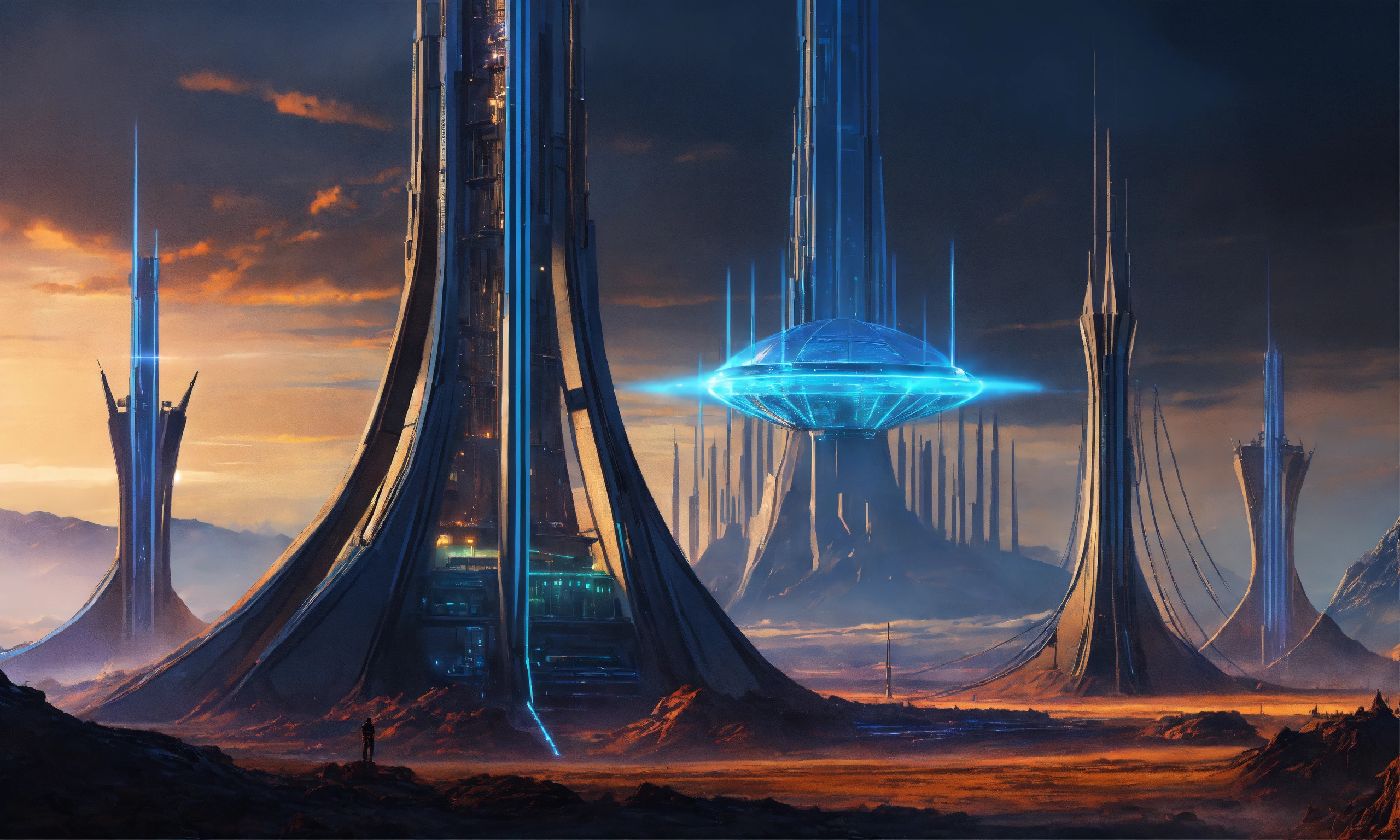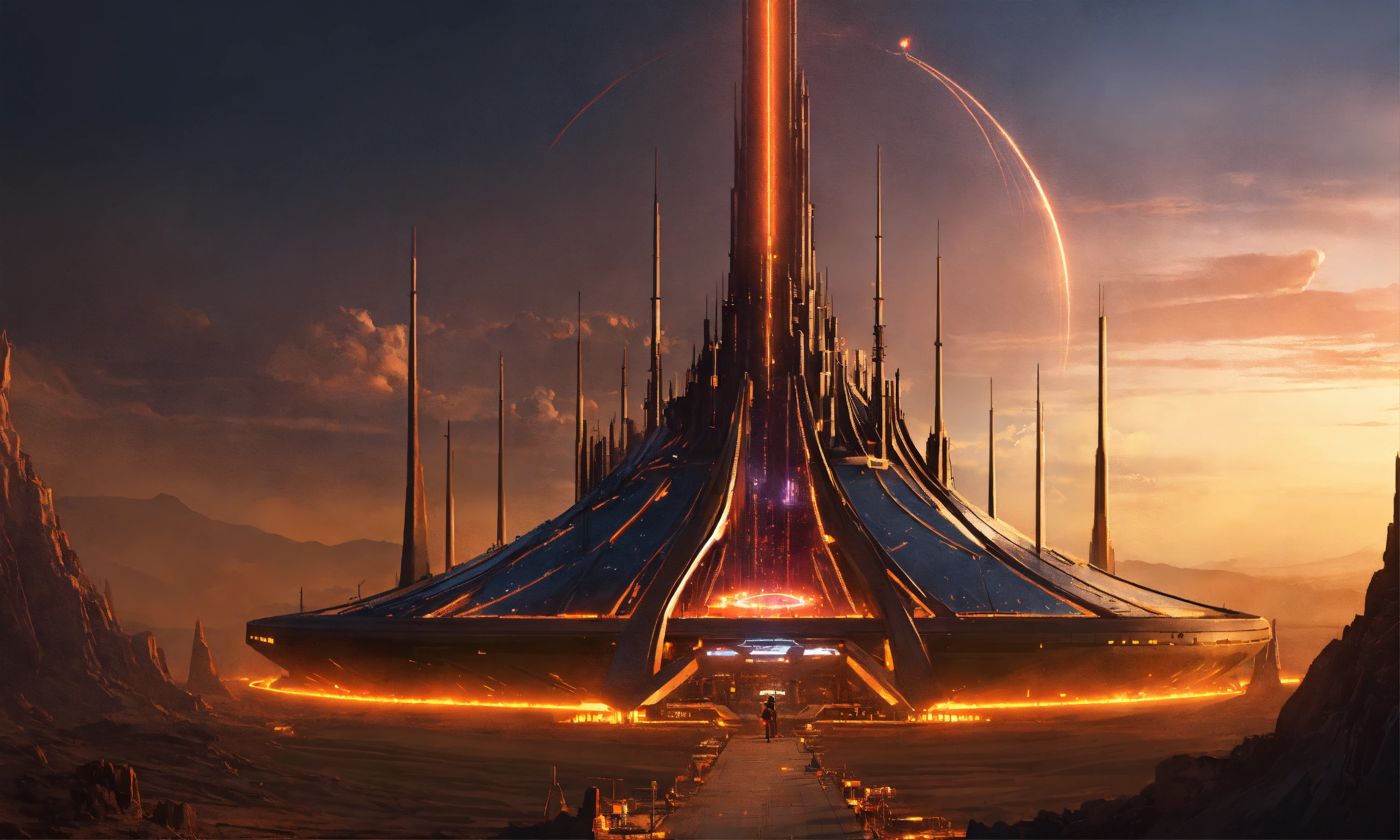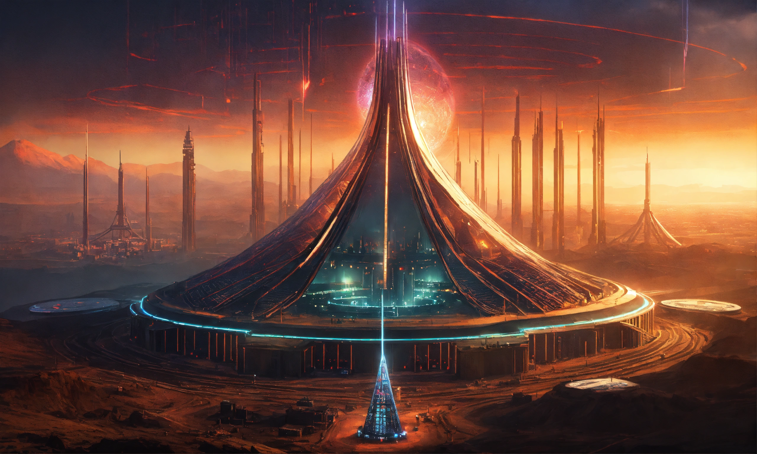 Dark alien tower of sauron seen from a distance is a towering fortress with hi-tech circuit lines going up the structure with energy field blasting through the top to create a dome force field, digital hologram, tron, looks like music equipment with meter bridges, speakers, and transmission towers sound wave, in the middle of a wasteland, 8k realistic, pixar, disney, cartoon, sci-fi