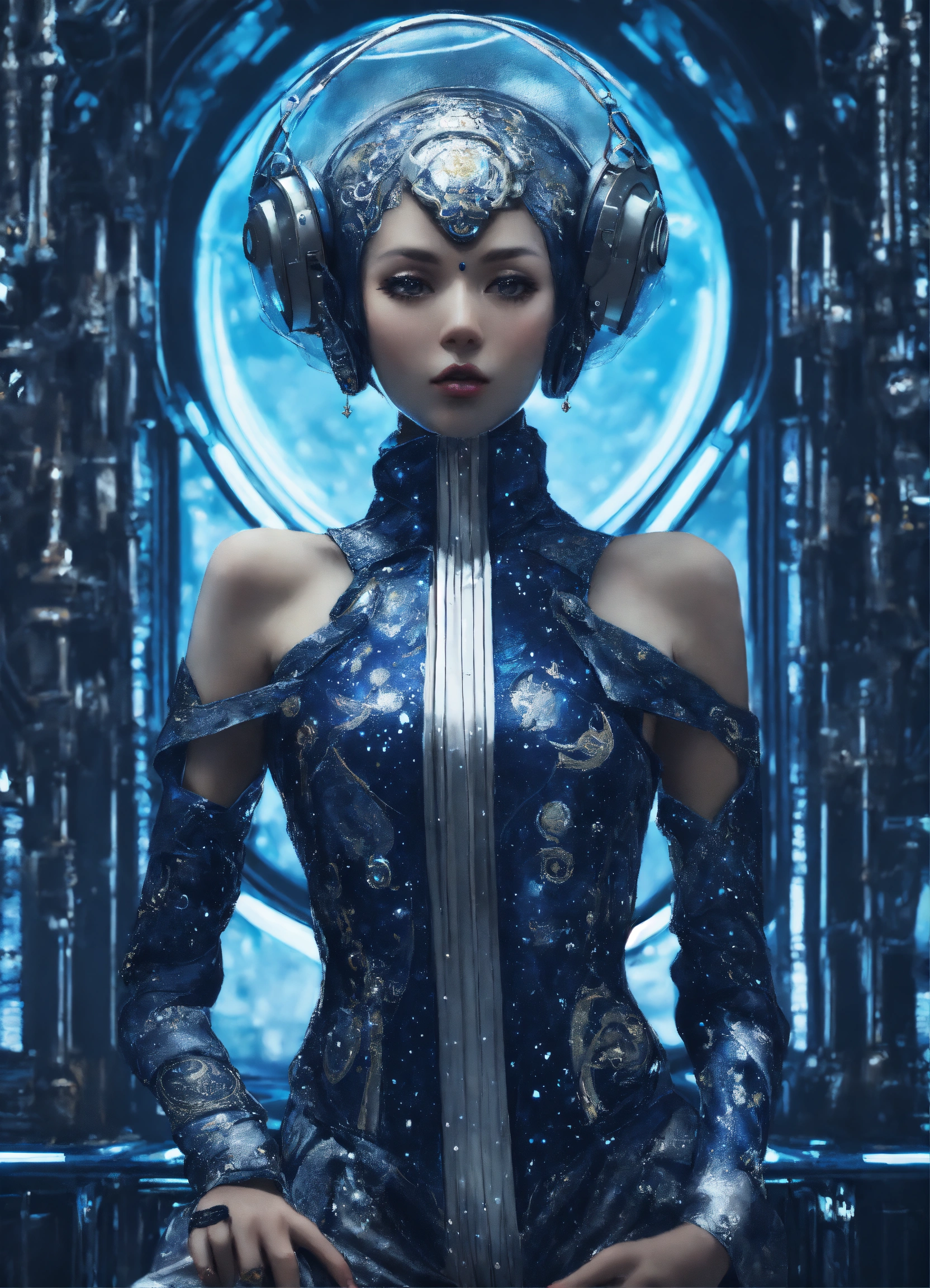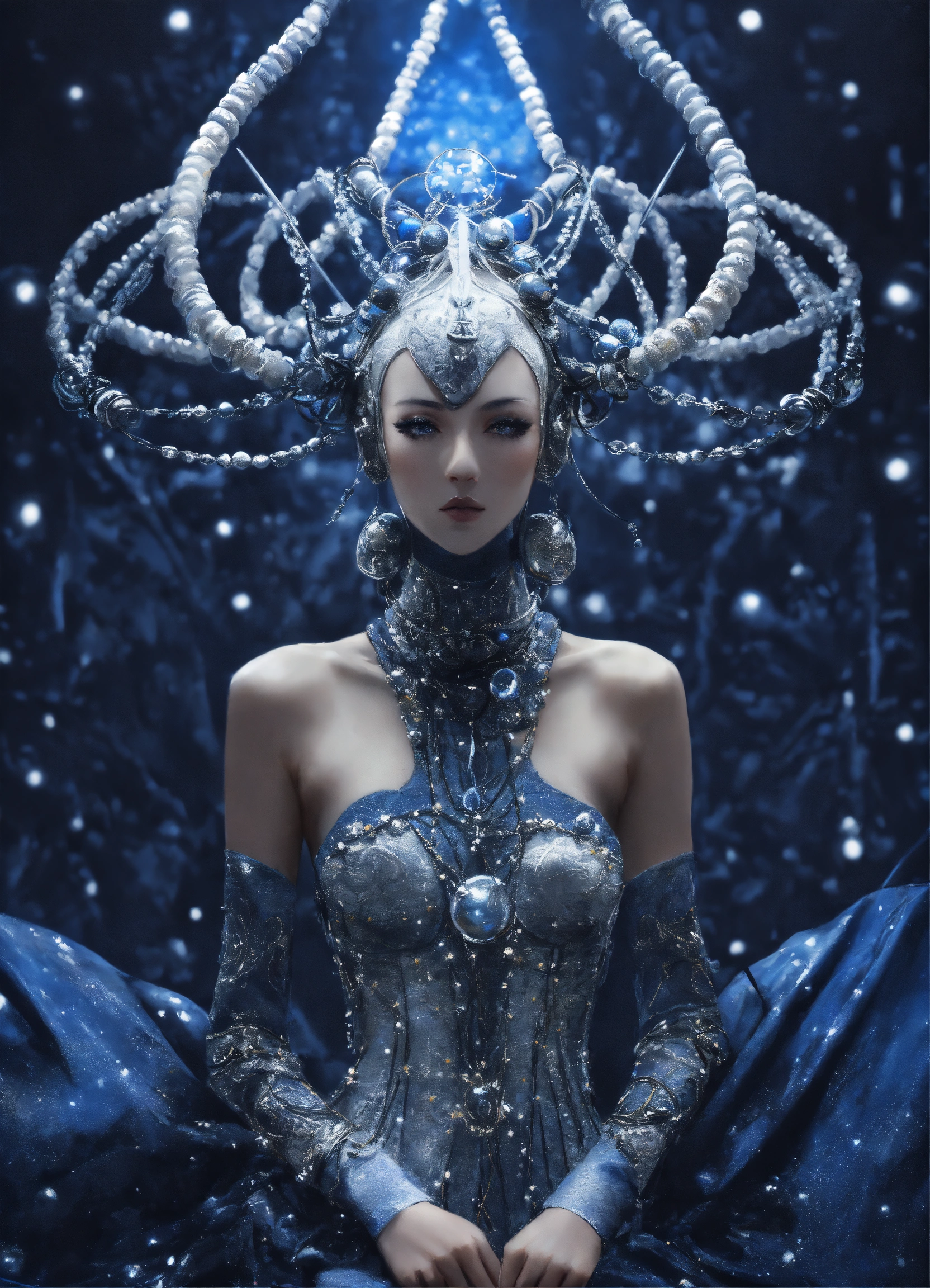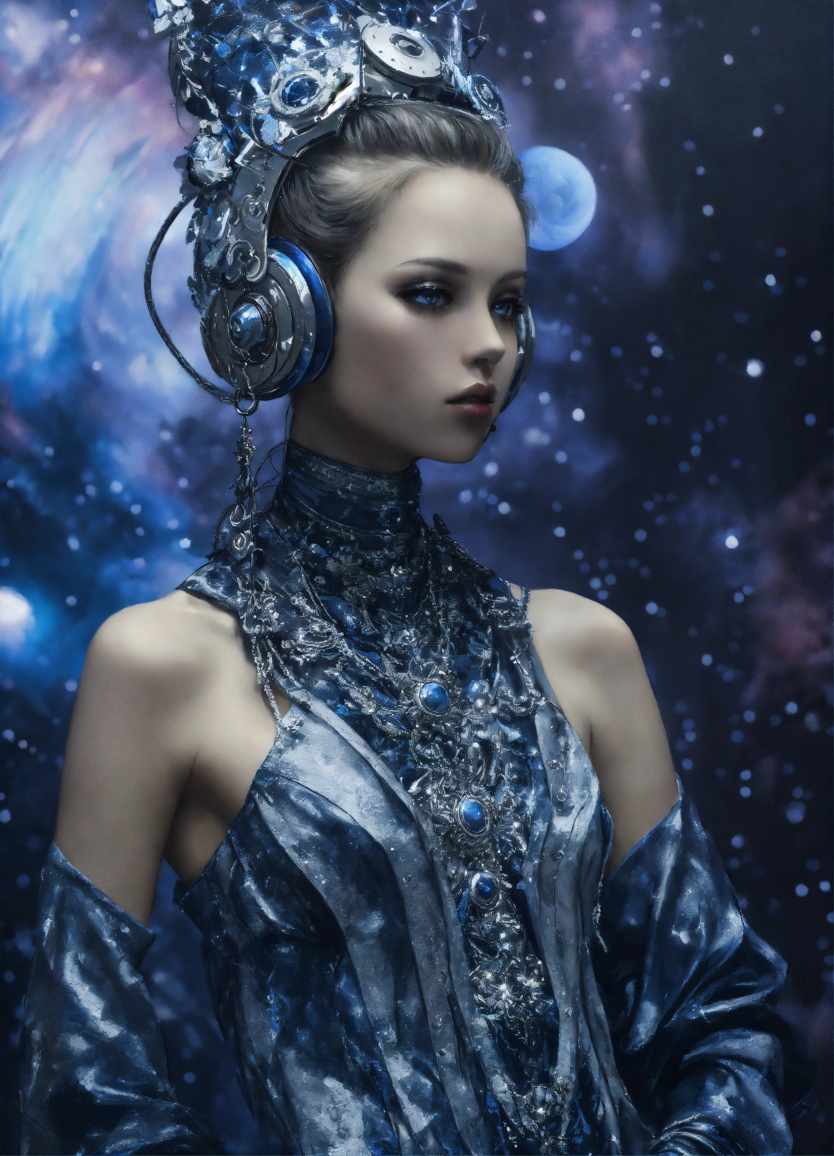 Ethereal minimalist alien race cybergoth fashion photography painting, in the style of dark navy blue pearl white and silver, highly detailed clothings, full body portrait, mouving pose, painting oel on canvas, intricate, sharp_focus, concept_art, backround cosmic sky