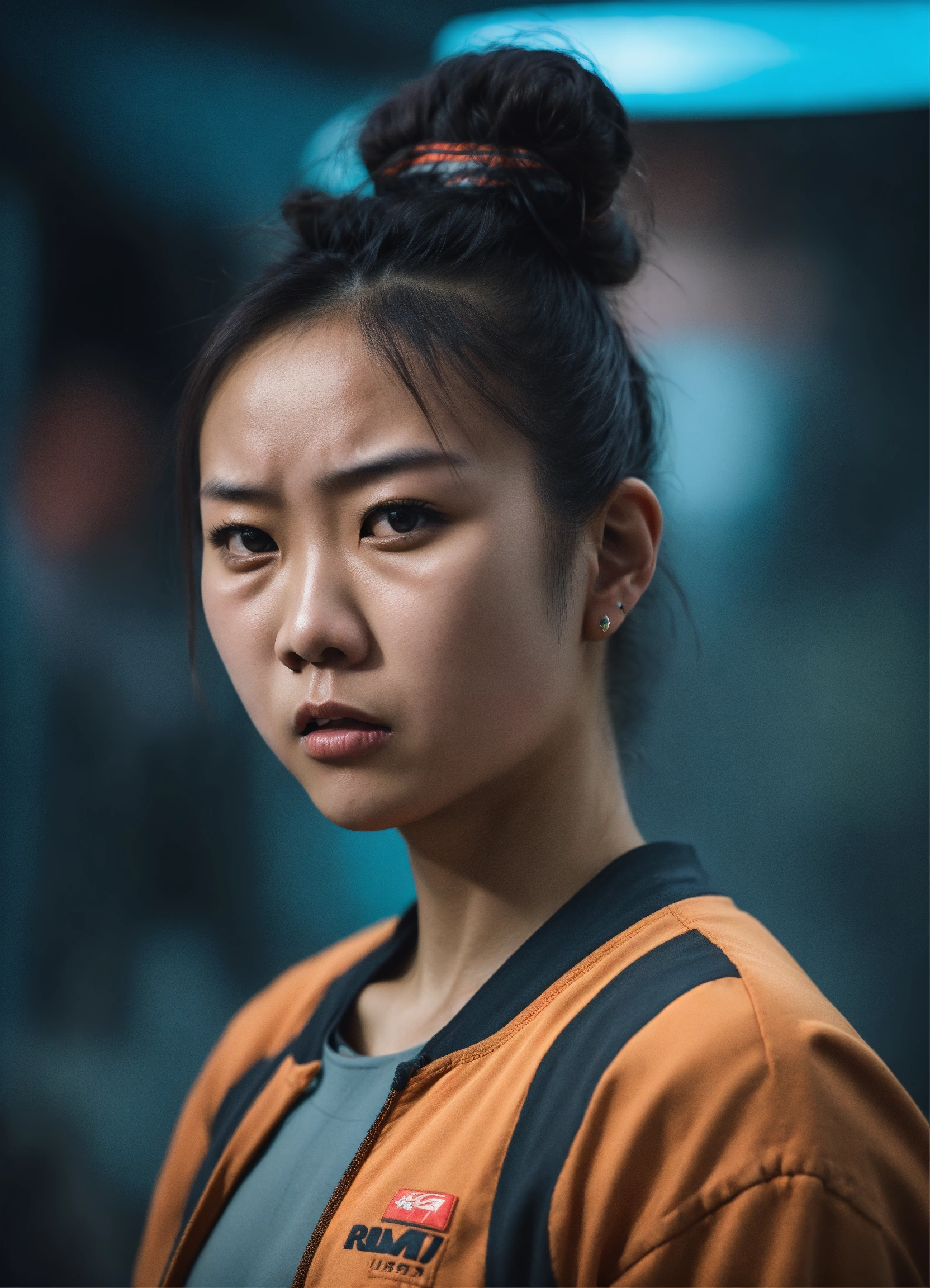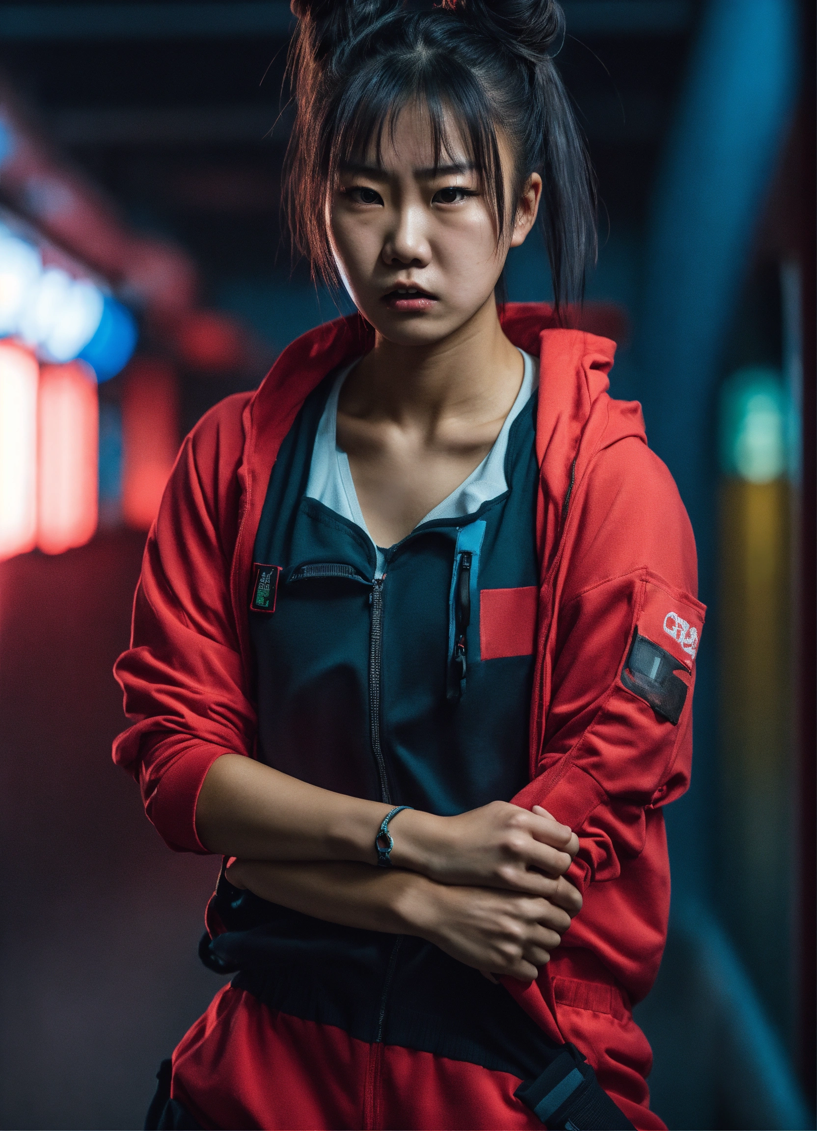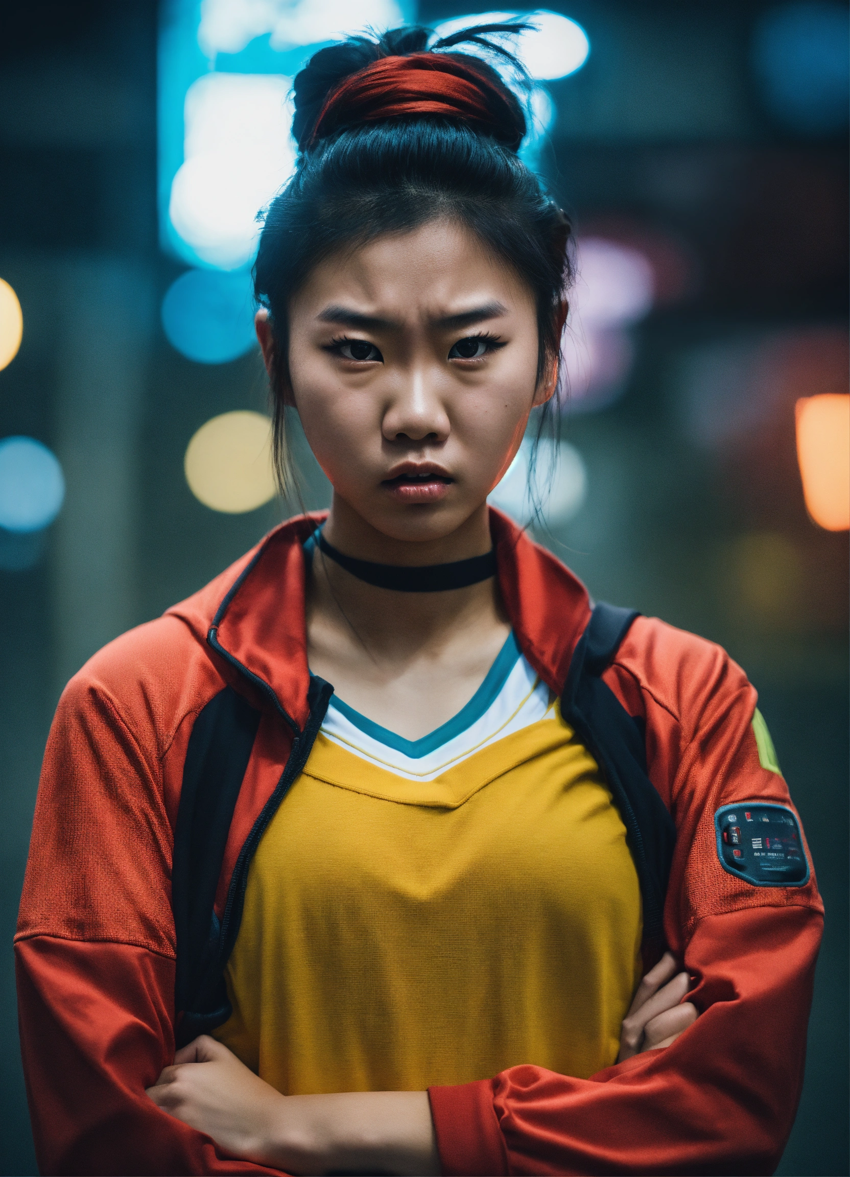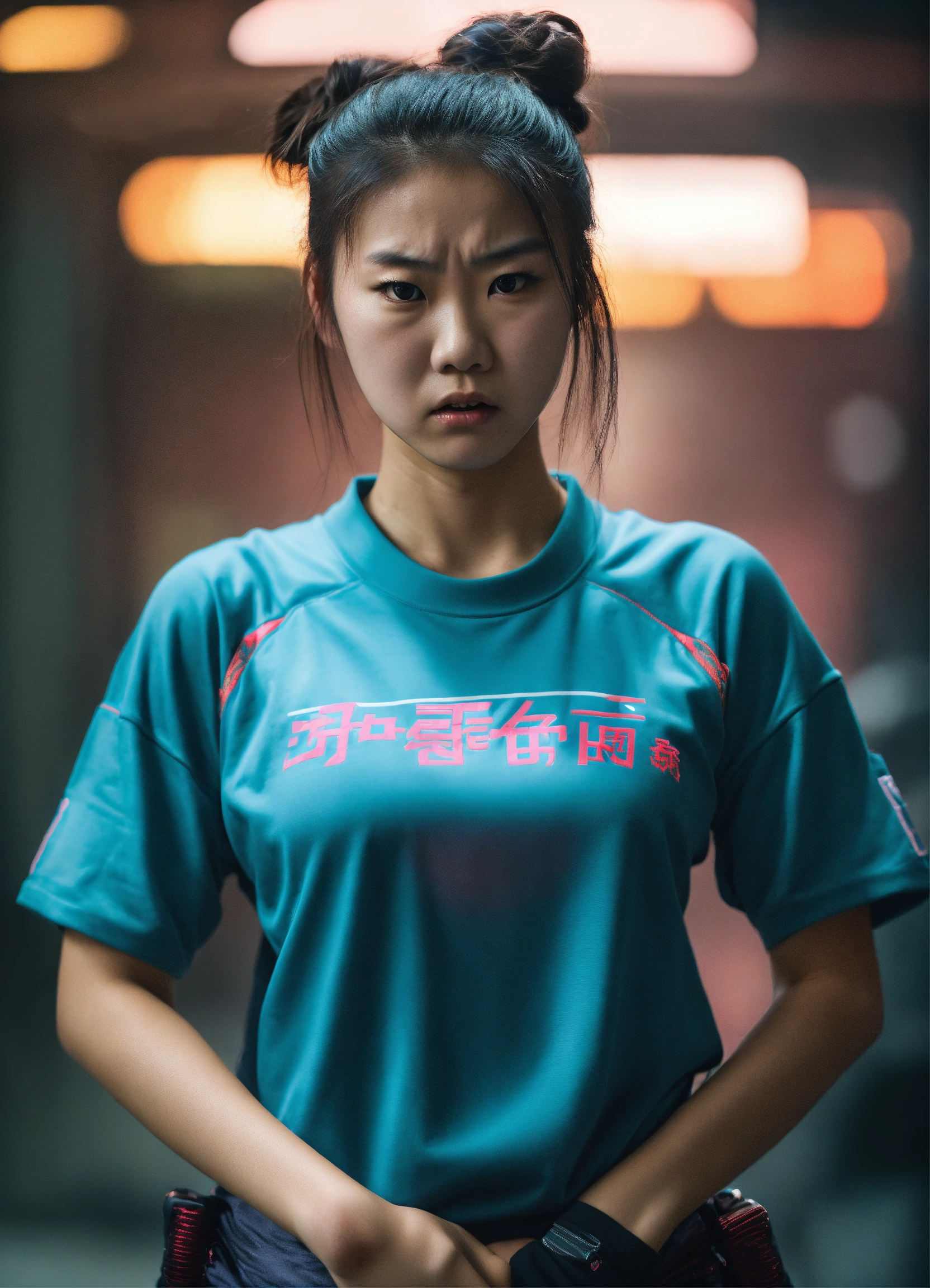 An ultra detailed photo of an ugly angry 20 years old asian girl, with menacing traits, with a little bun in the hair, with very angry expression, strong fit body, crossing arms, wearing a sports sci-fi thigh shirt, in a sci-fi clear background