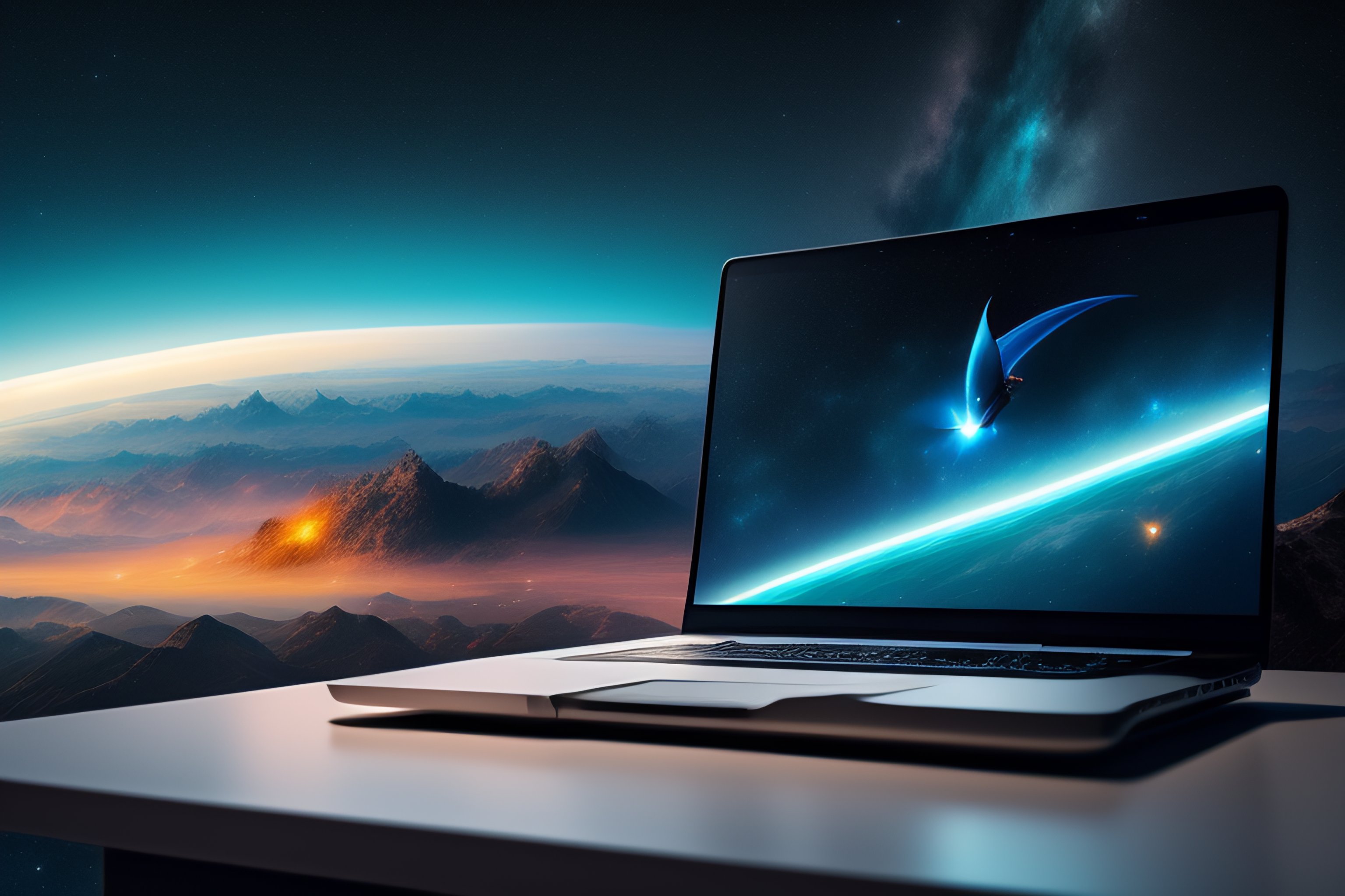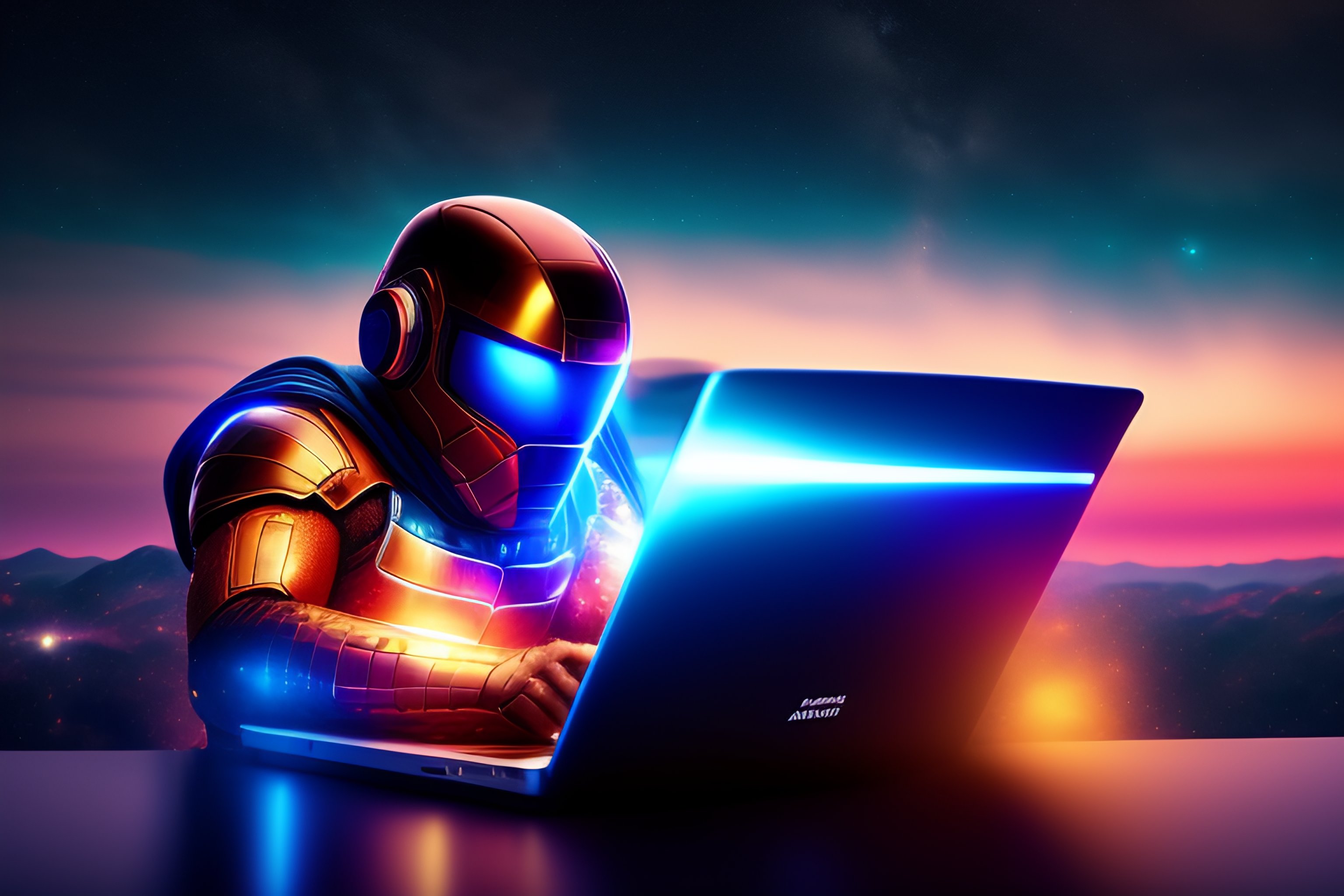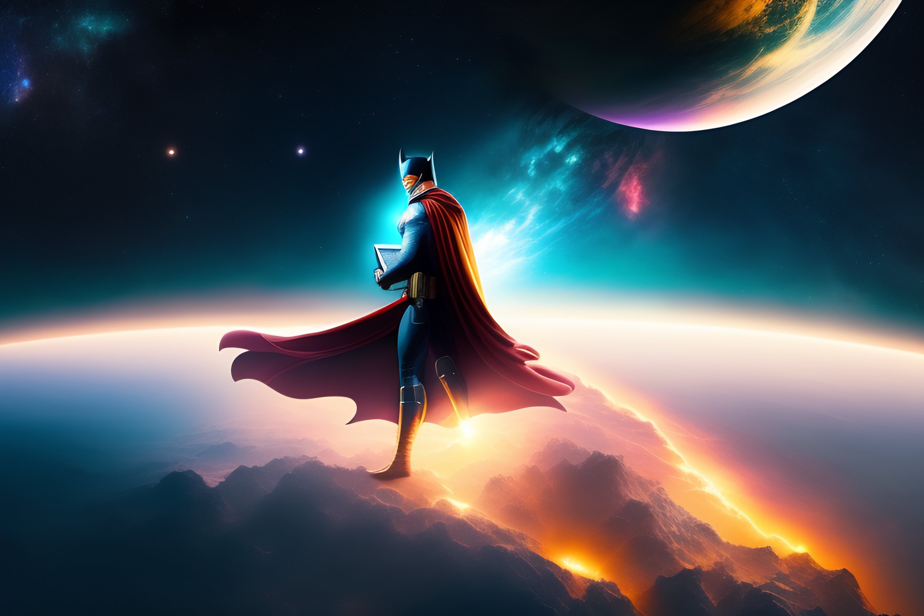 A superhero flying and coding a laptop in the galaxy around millions of stars