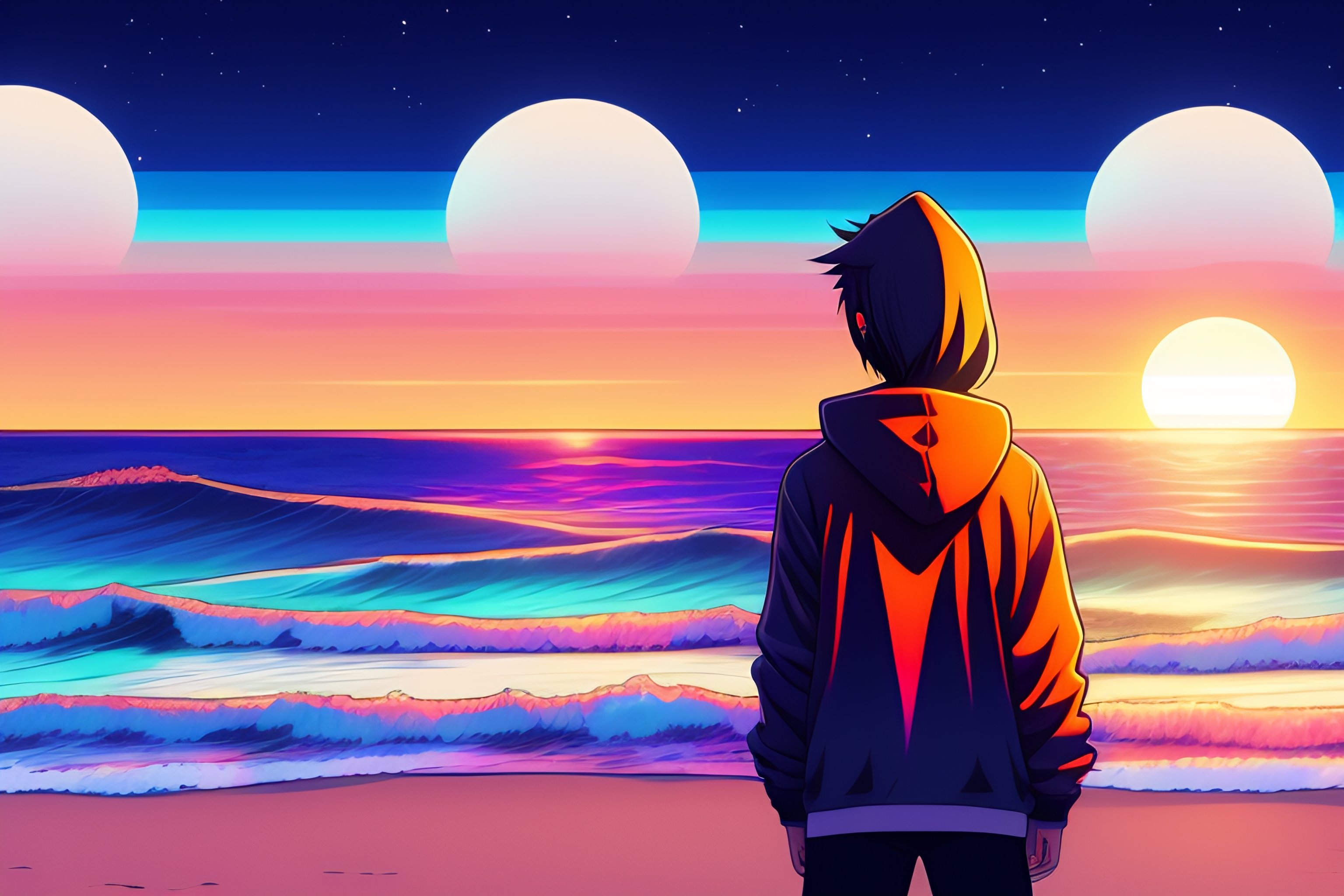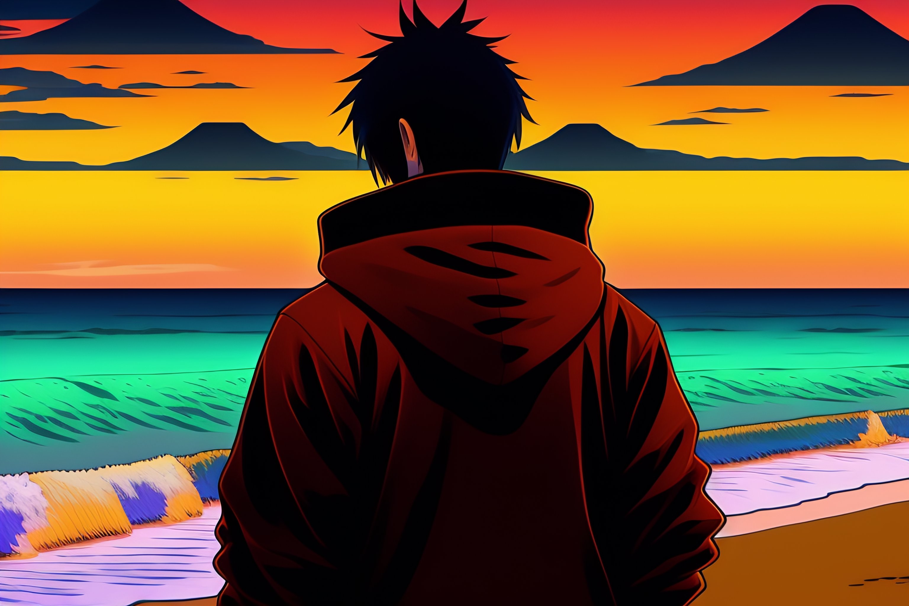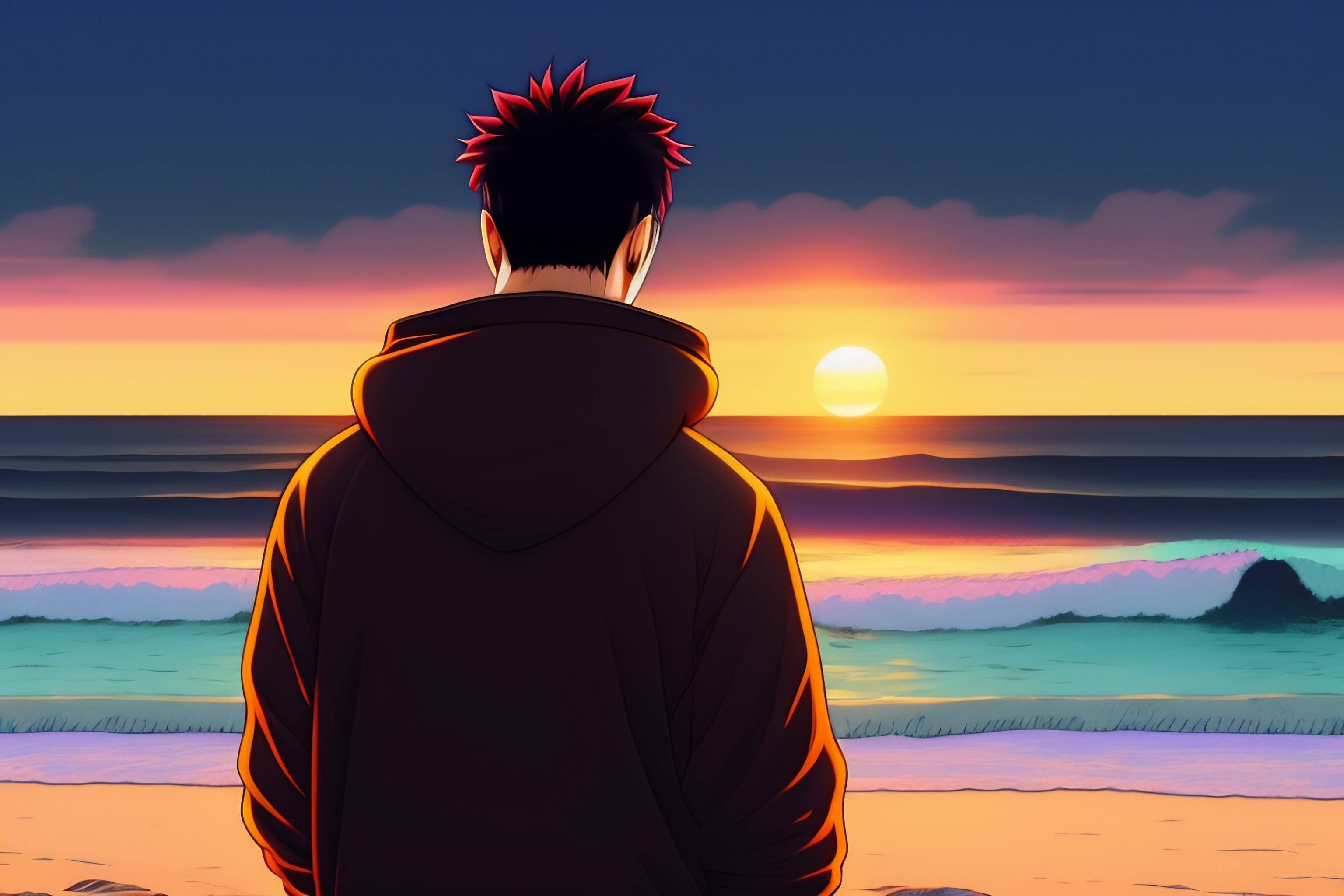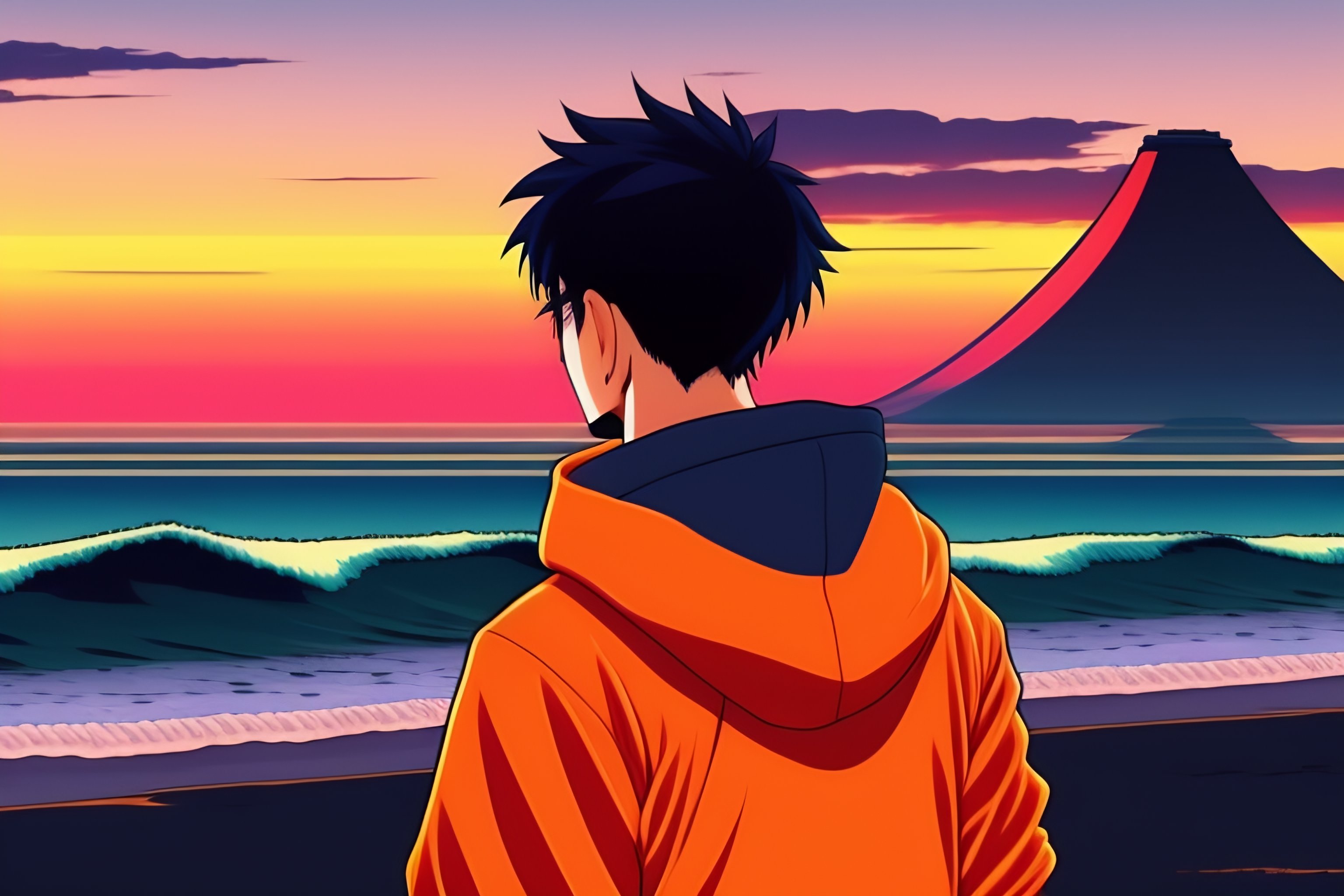 A japanese guy wearing a black hoodie, standing and showing us his back, looking at the sunset over the ocean at the beach, in the style of 90's vintage anime style. detailed line art.