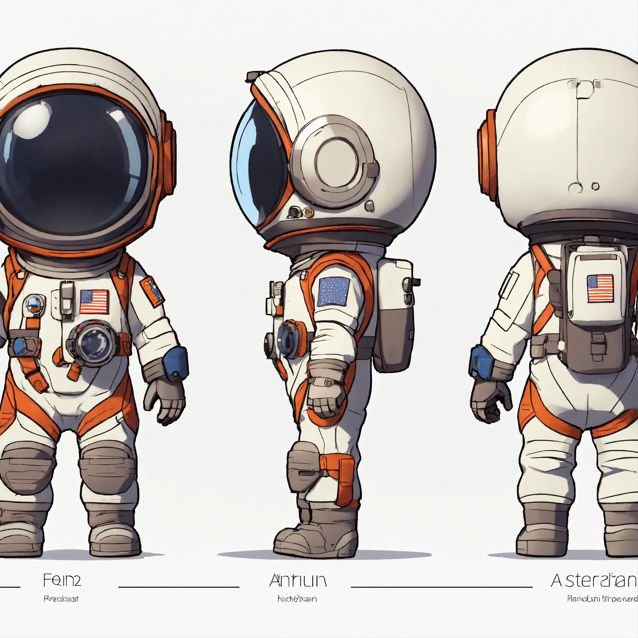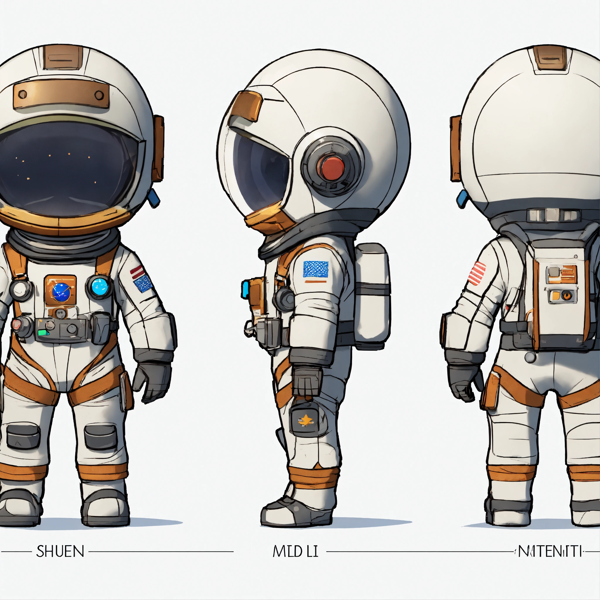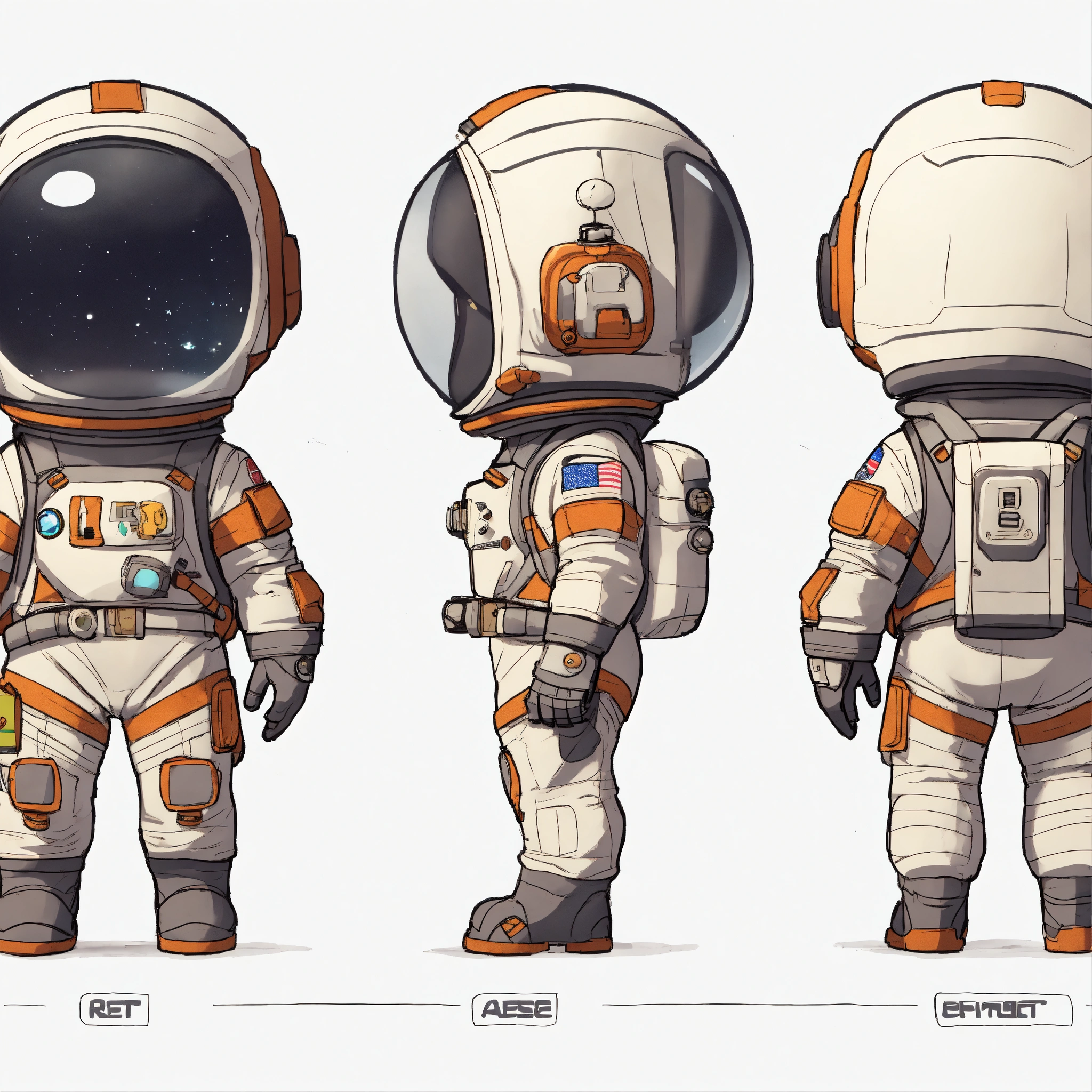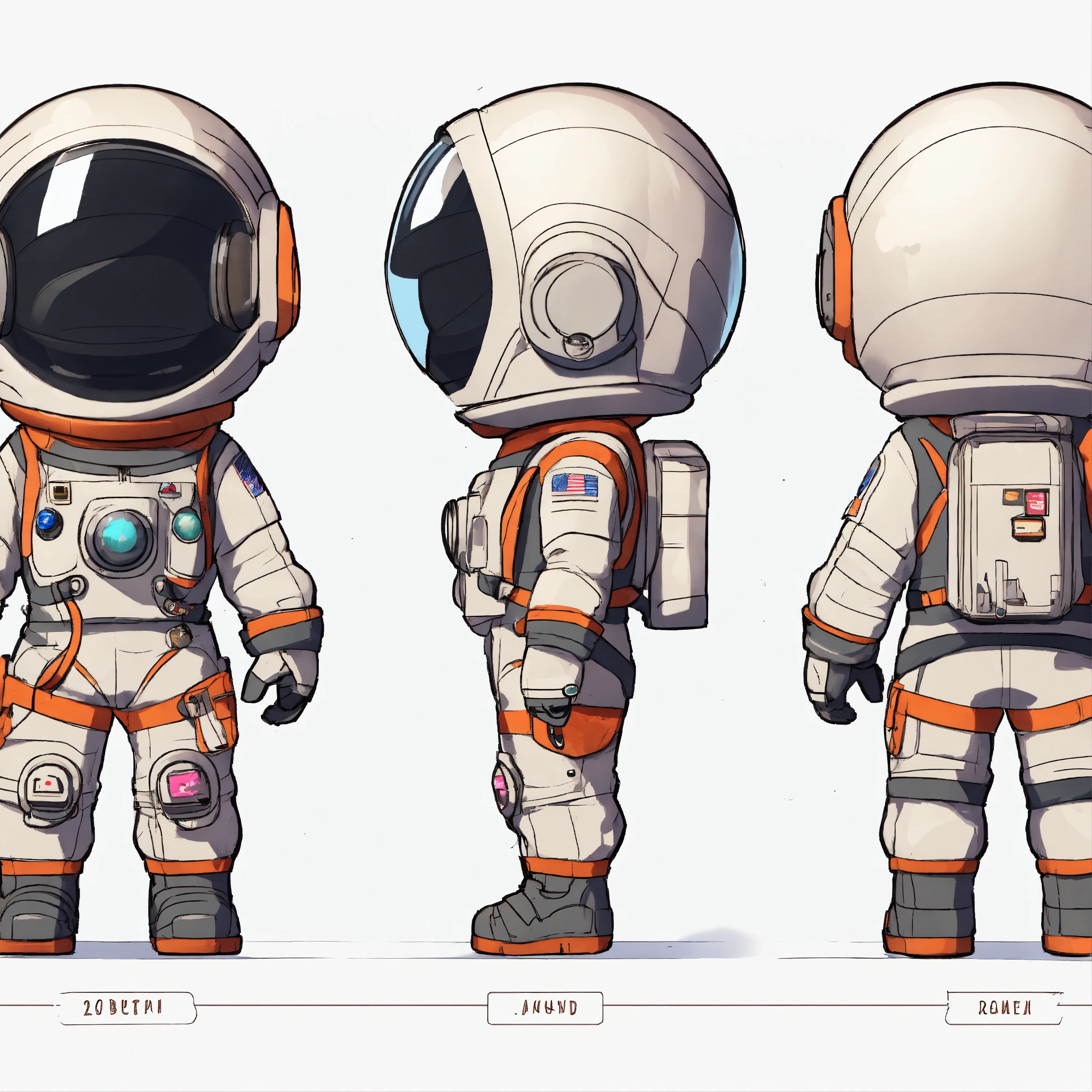 Mini astronaut, cute, 2d, character sheet, full body, reference sheet, character model, front view, side view, back view
