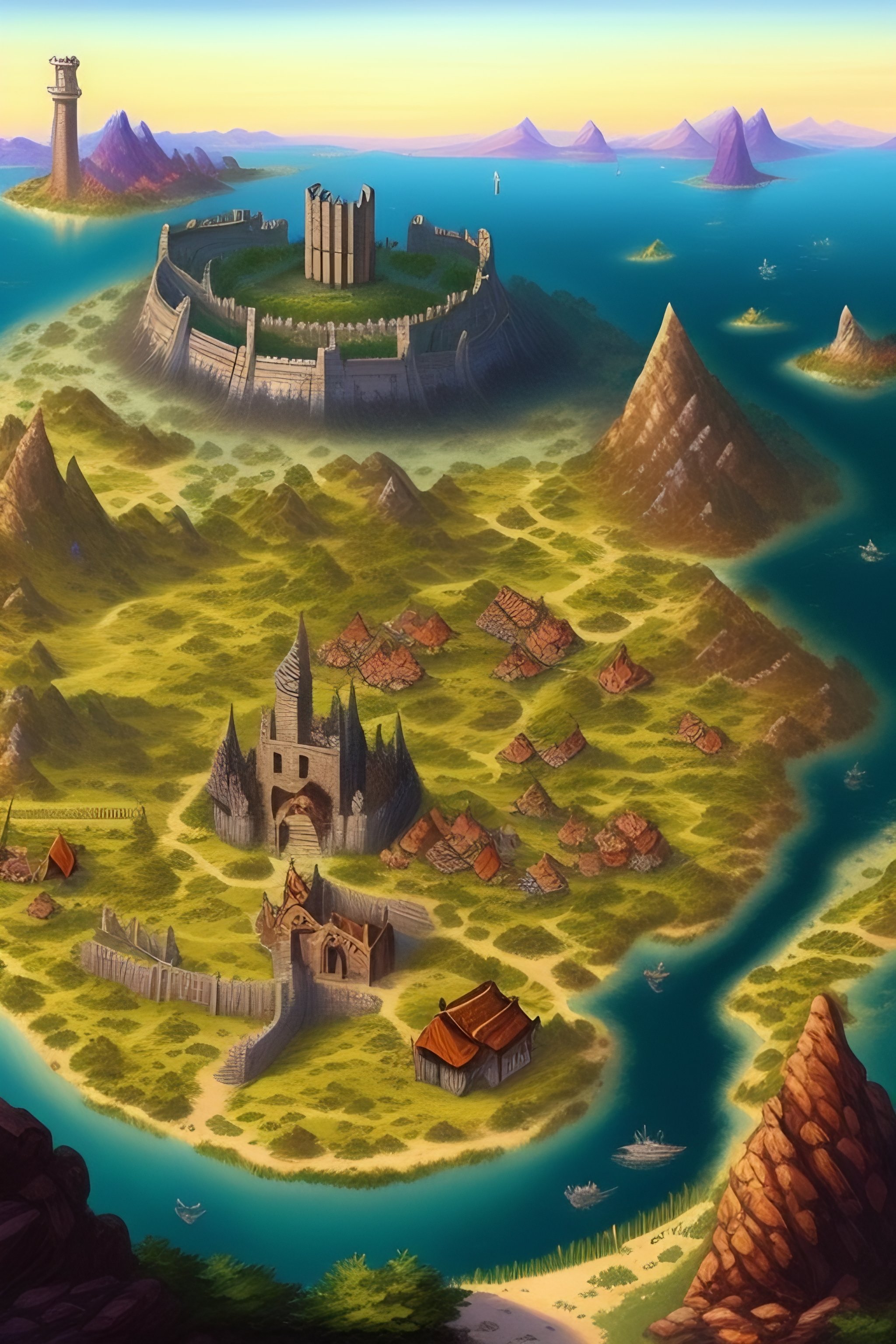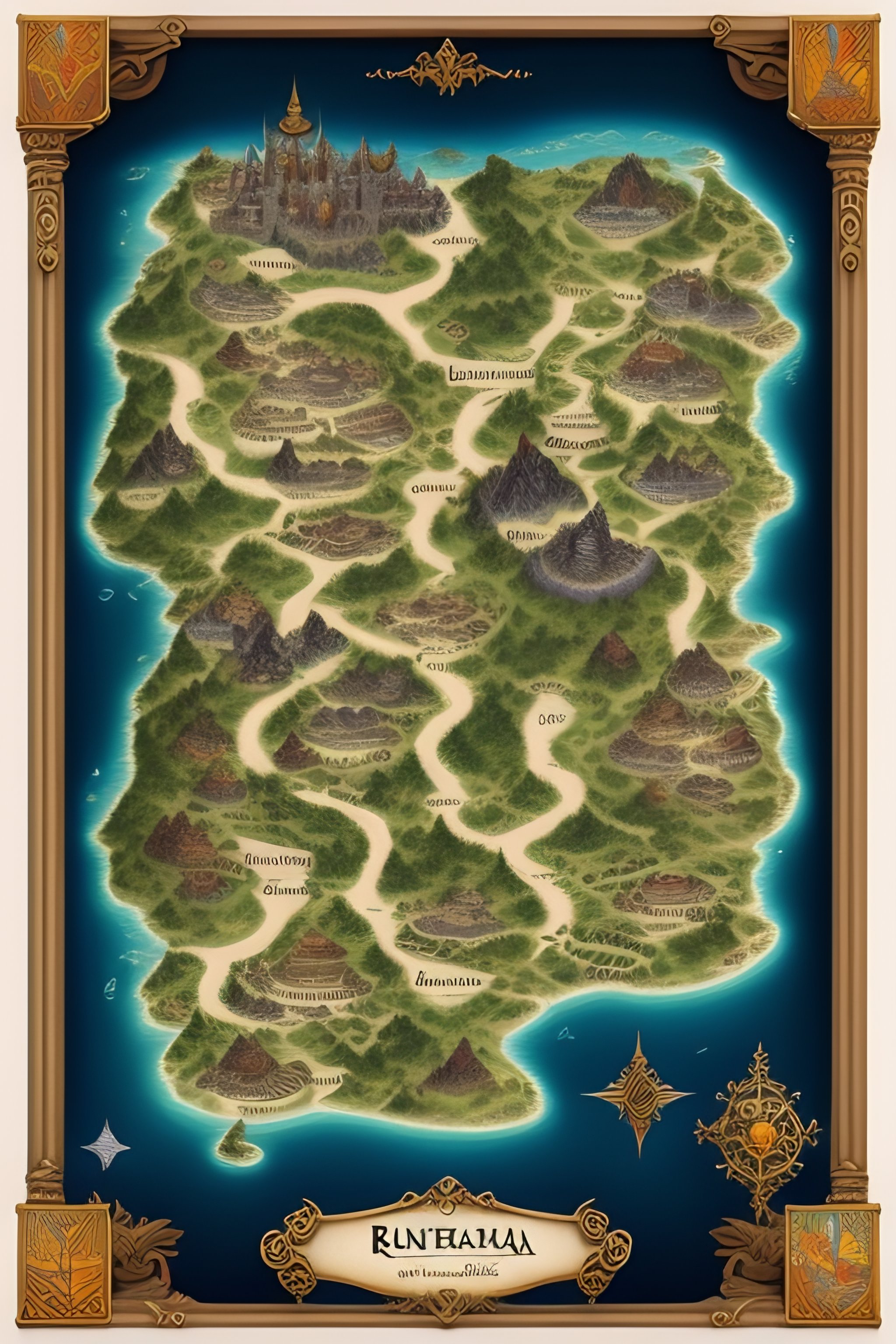 An illustrated fantasy country map for tabletop game, city, towns, temples, ruis, ancient, medieval, fortress, dungeons, old, fantasy, ancient.