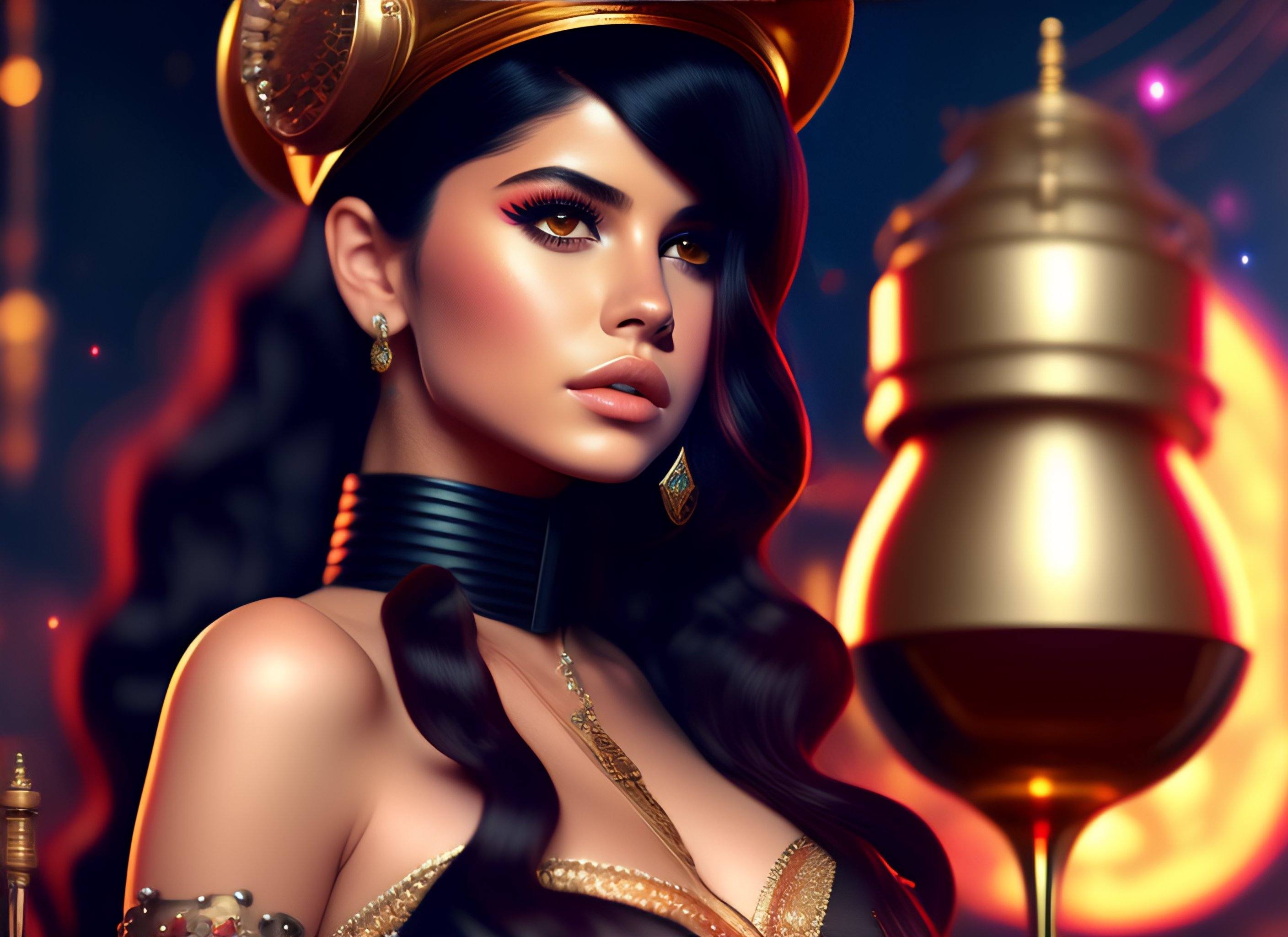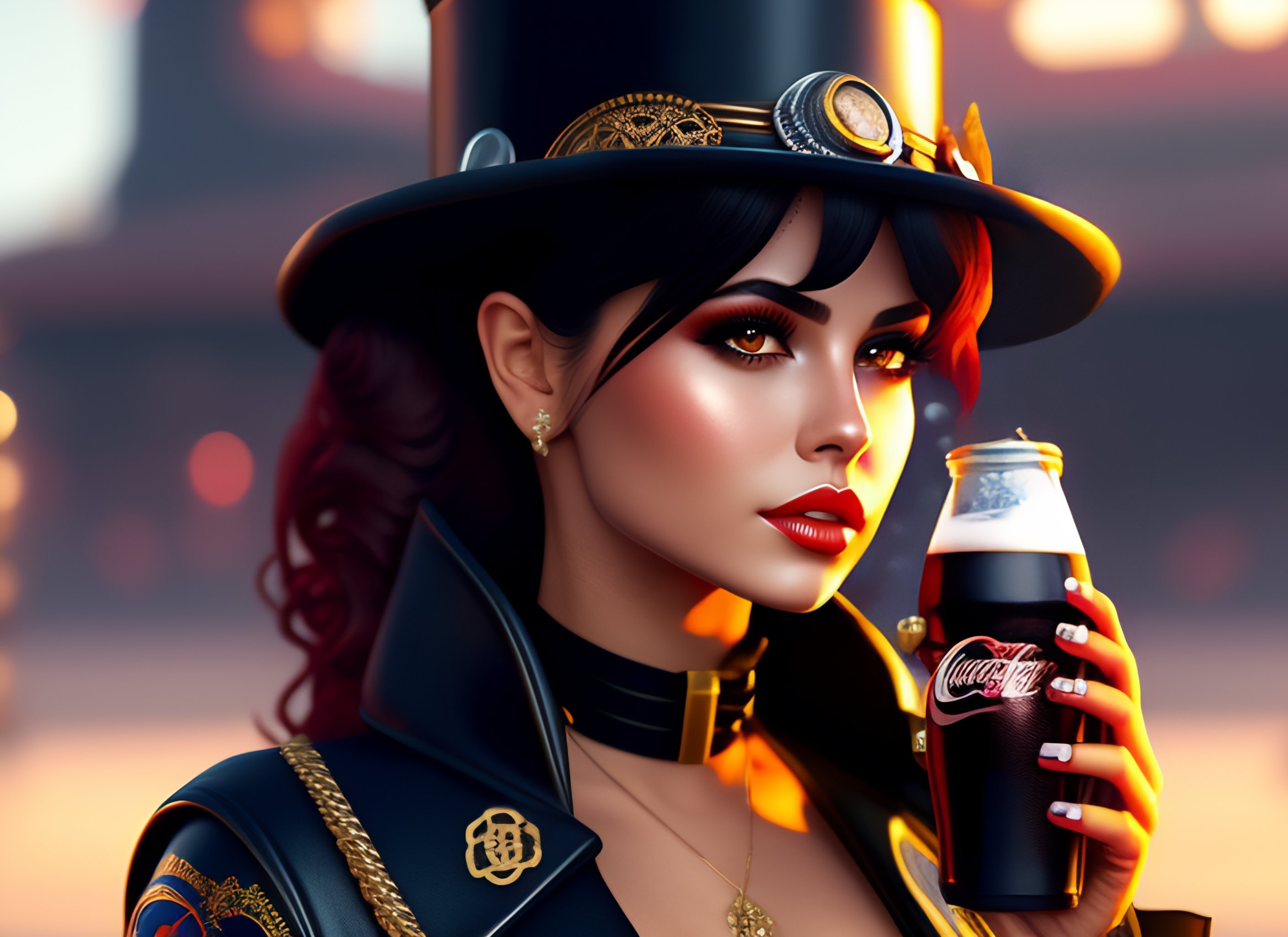 Steampunk full body kawai selena gomez emo girl drinking coke, on a deep space, 4k, 8k, trending in artstation, trending in deviantart, rendered, ultra realistic, high detailed, masterpiece, vibrant colors, hdr, octane render, unreal engine, ray tracing