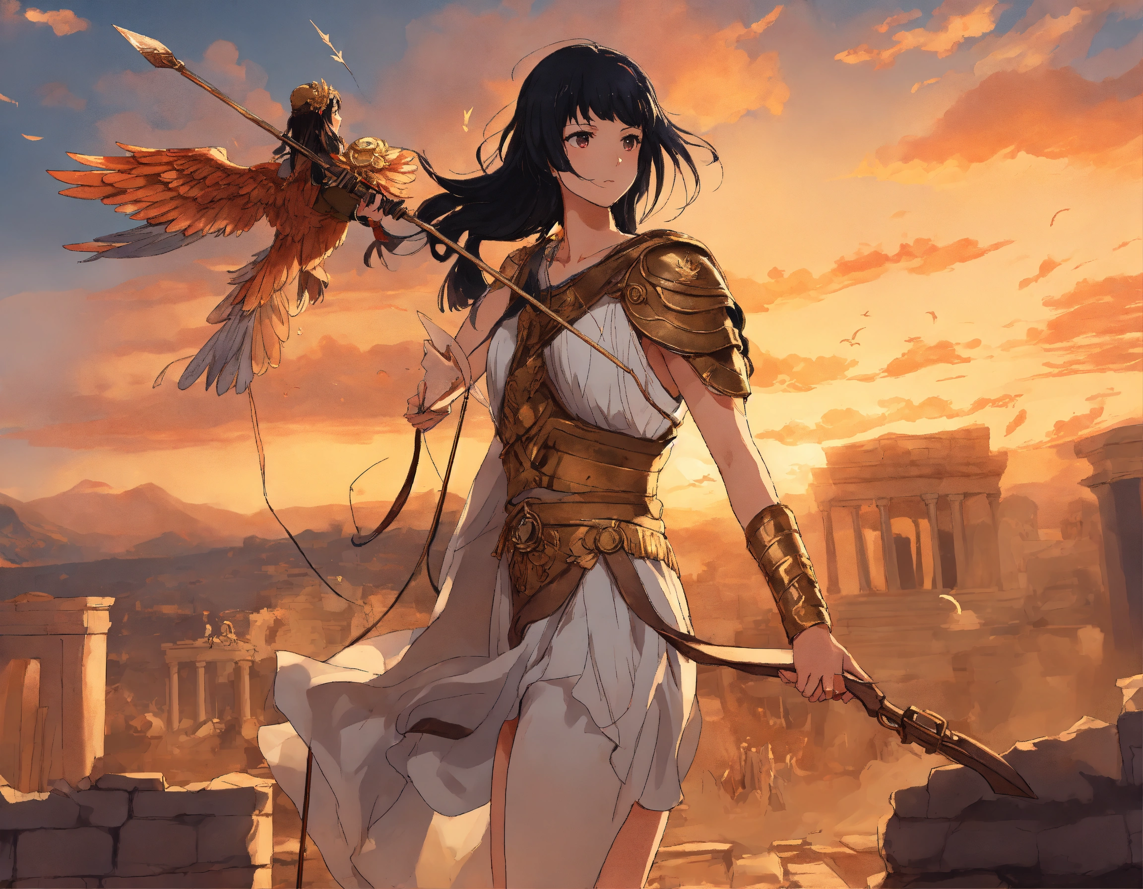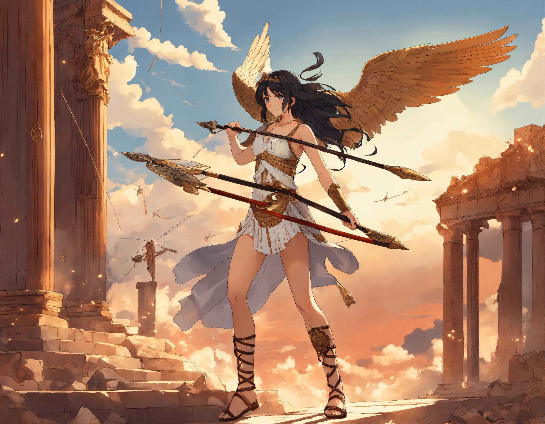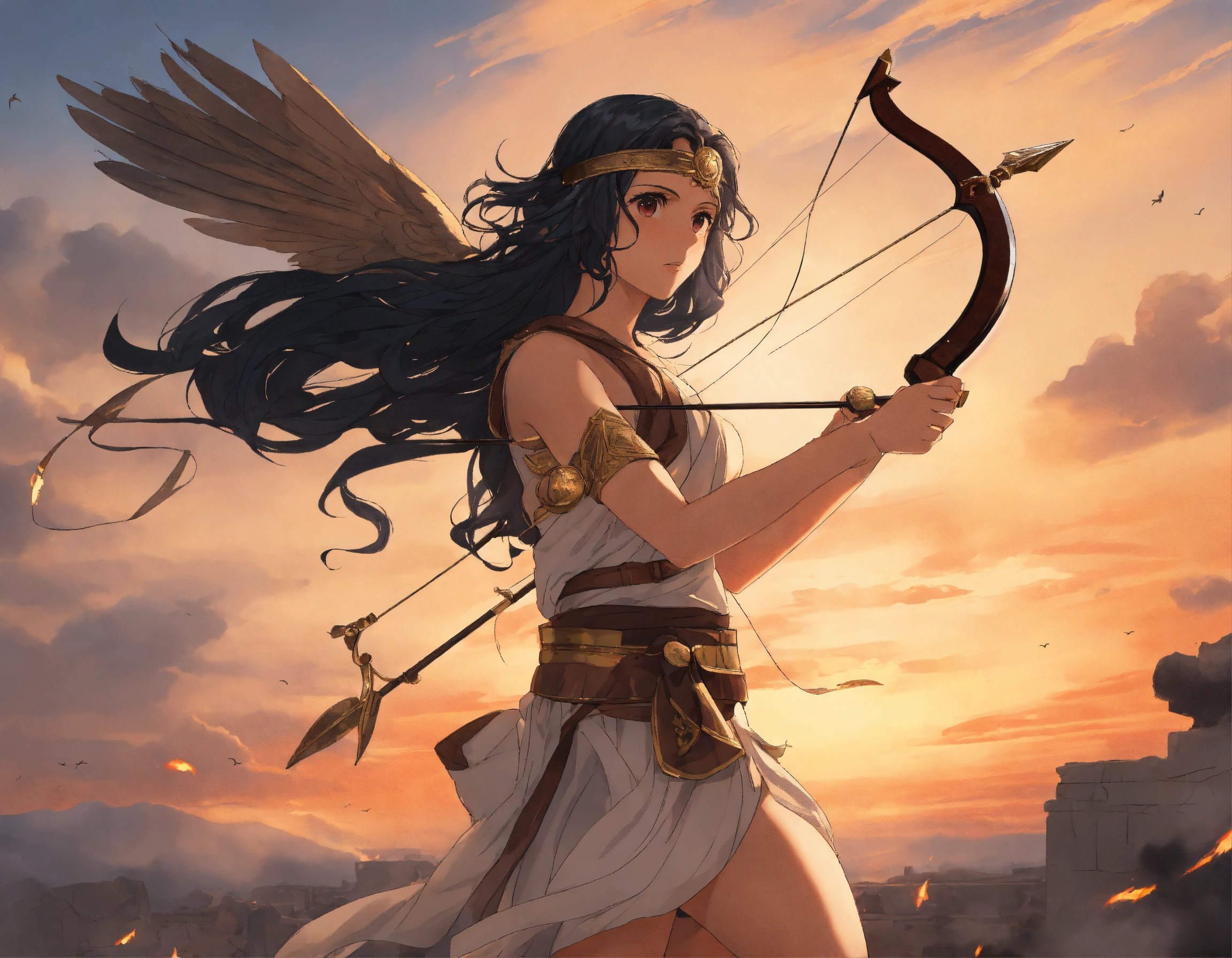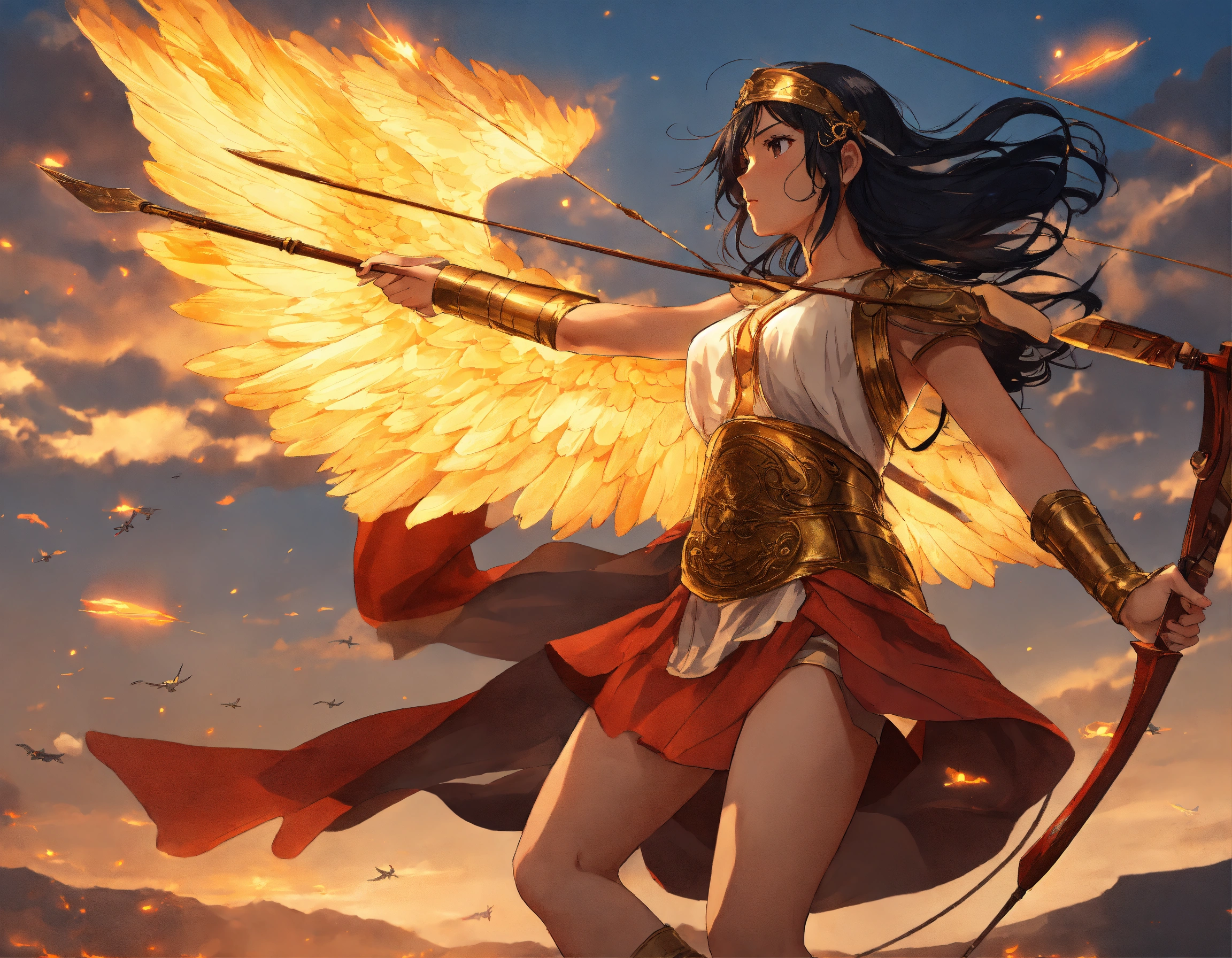 A young woman with loose black hair, with little withe angel wings, wearing a female ancient roman greek toga, wearing an ancient greek gladiator sandals made with leather, holding an ancient bow with arrows, anime style, anime big eye style, takahashi, miyazaki, tezuka, flying in the sky during a war battle with fire, full body, three quarter view, background of ancient greece in ruins during war.