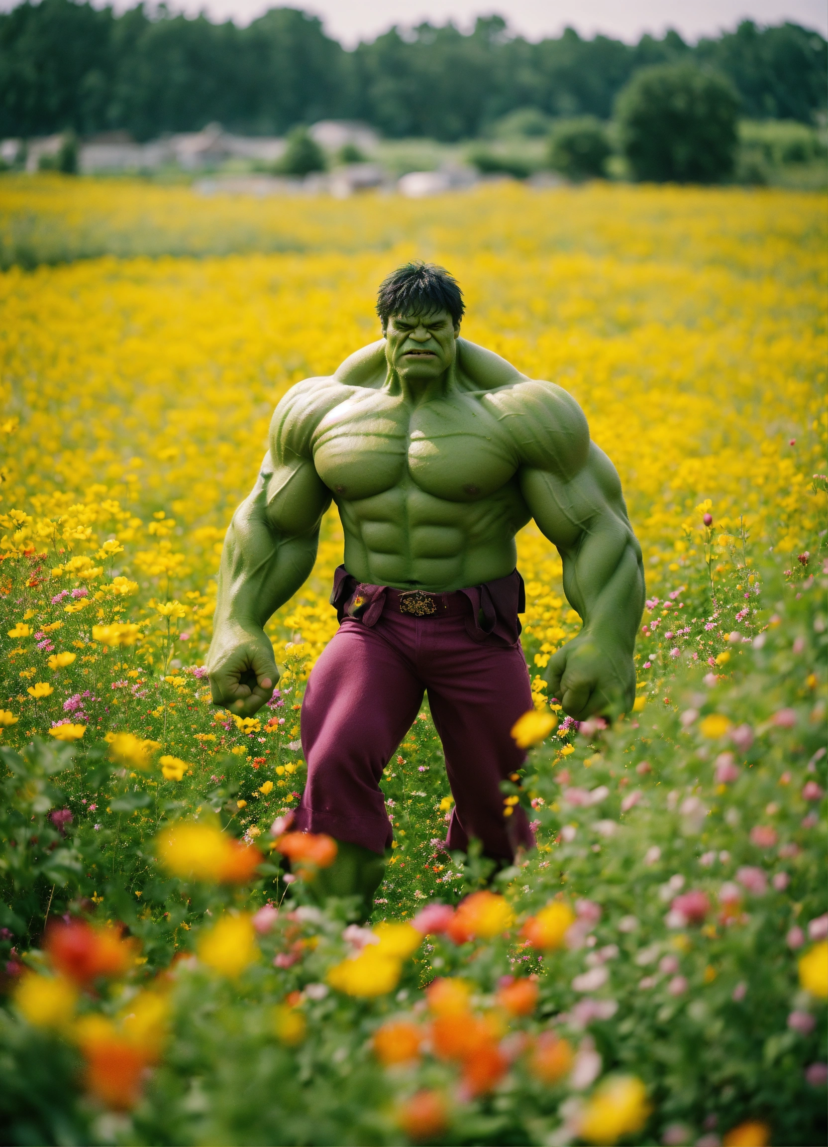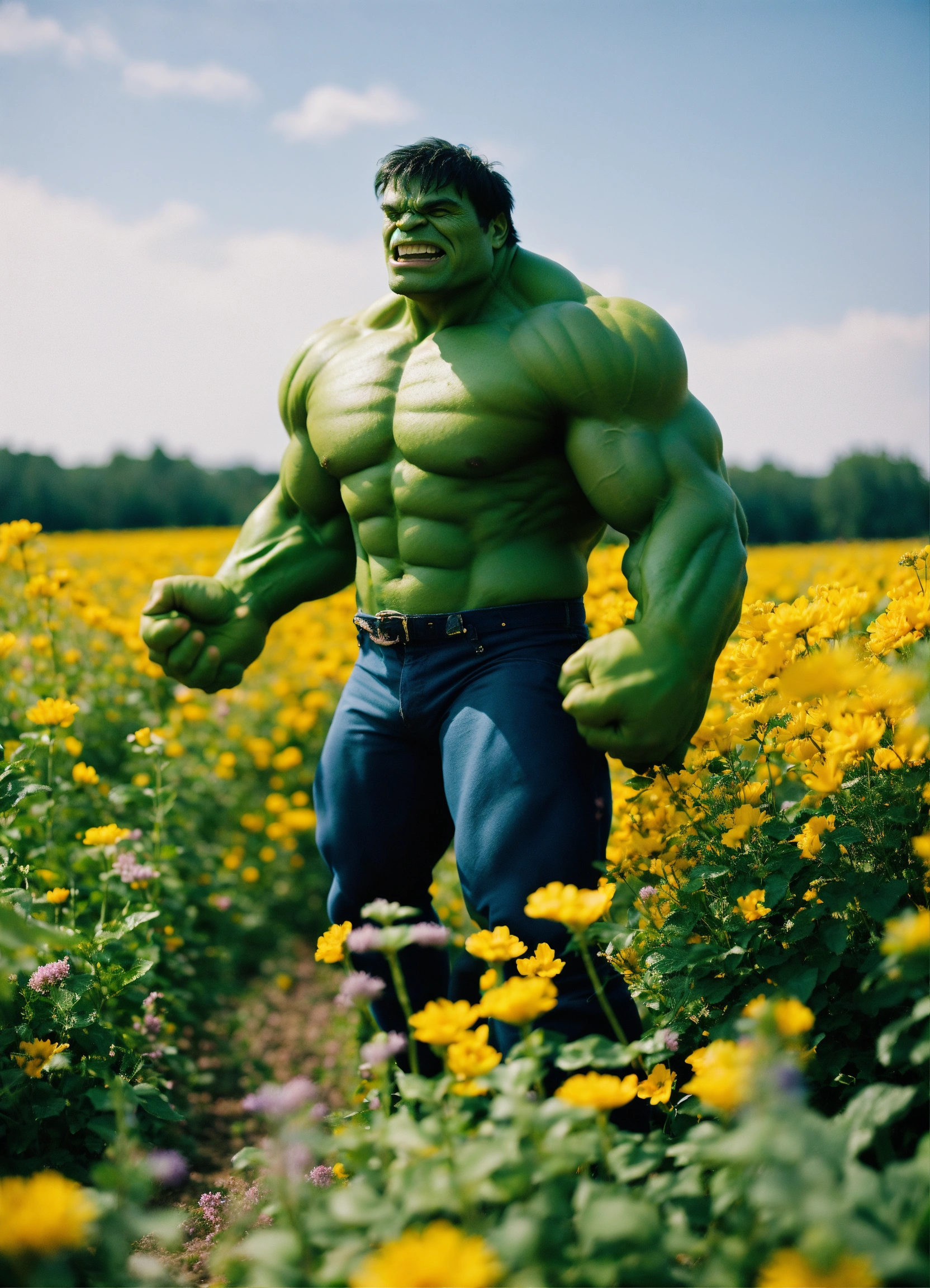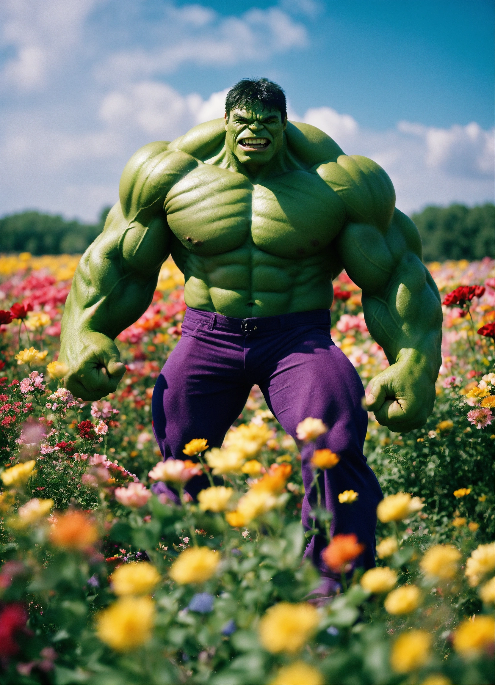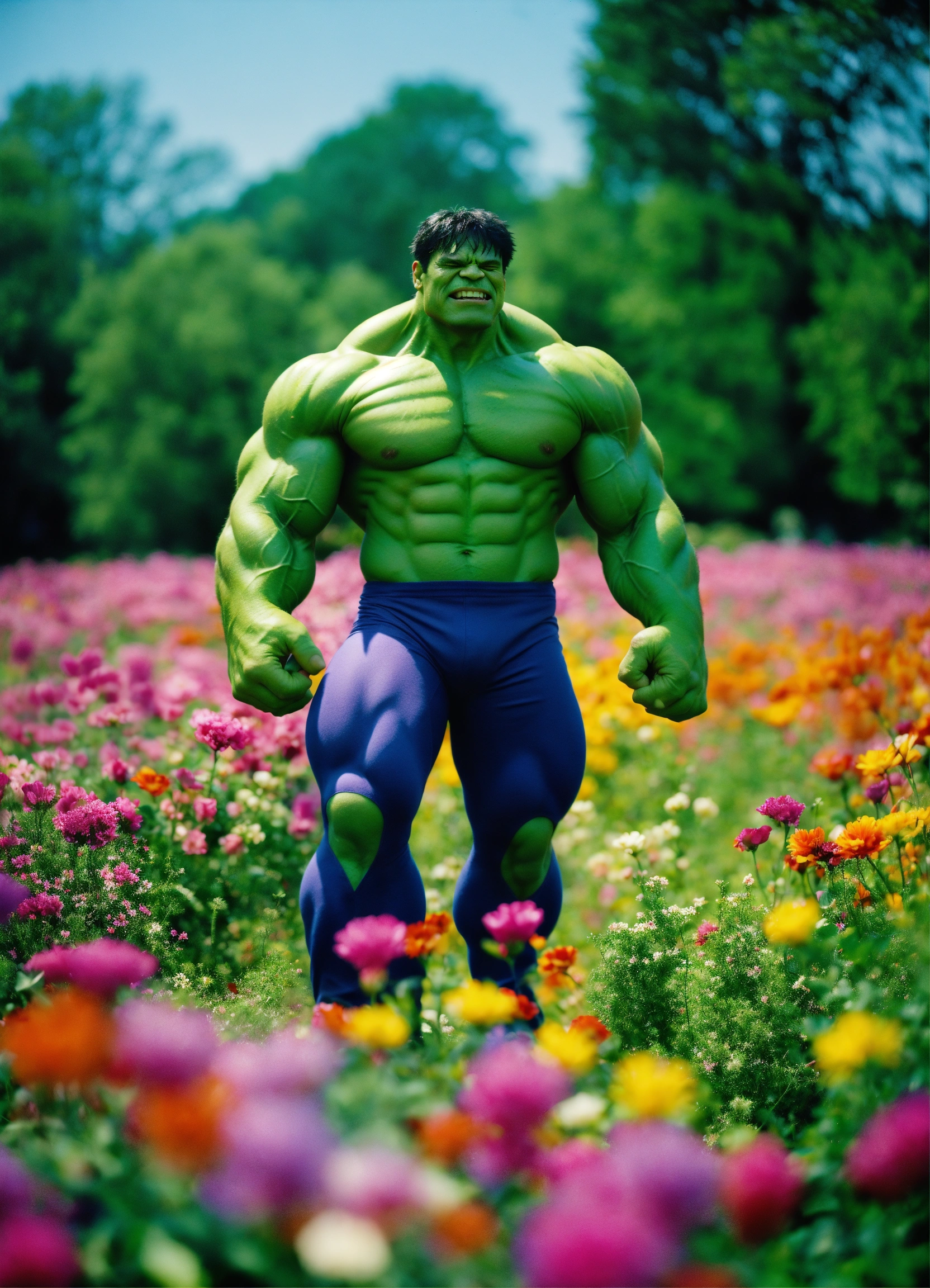 Happy hulk standing in a beautiful field of flowers, colorful flowers everywhere, perfect lighting, leica summicron 35mm f2.0, kodak portra 400, film grain