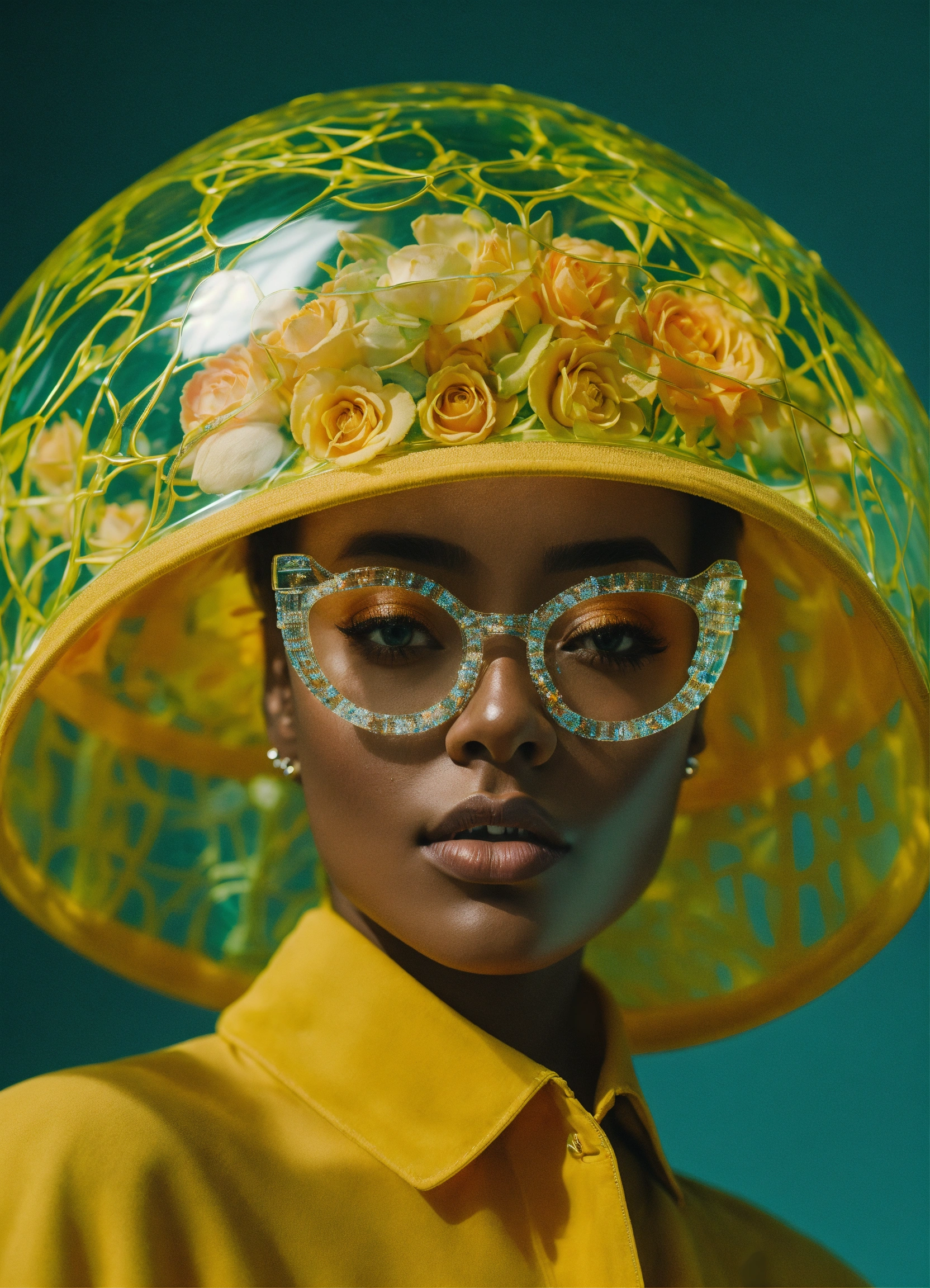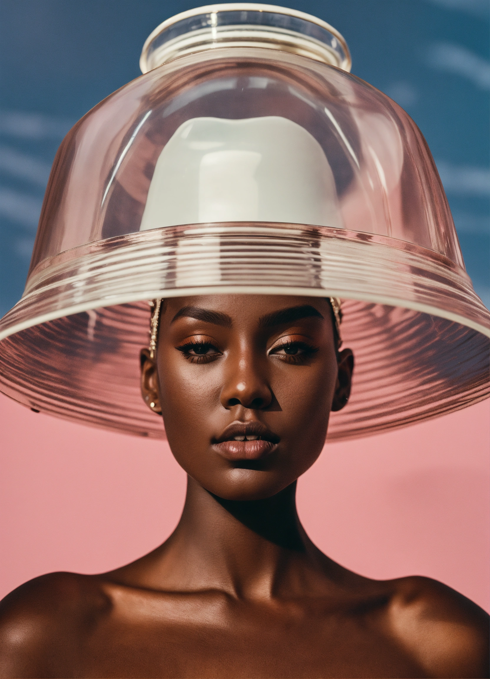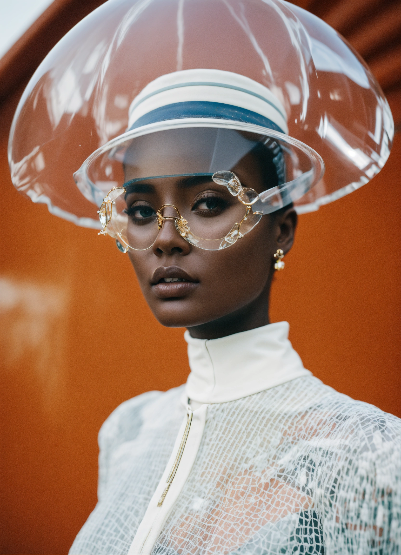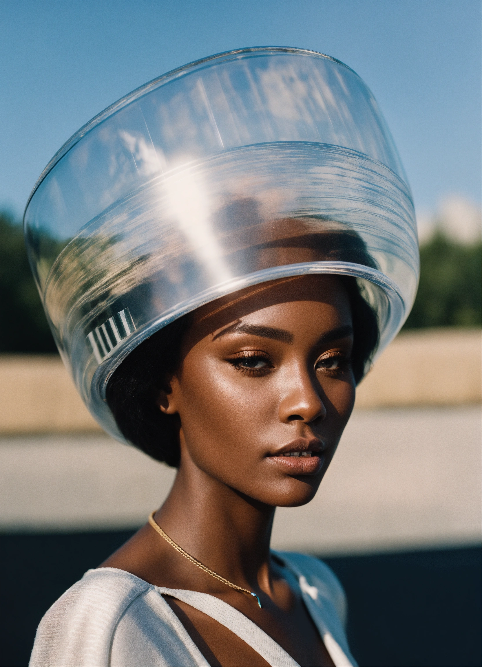 A woman wearing a glass hat poses for a picture, model, 8k resolution, hyper realistic, day, 35mm film, editorial, high fashion, 2023, off white by virgil abloh, hyper detailed