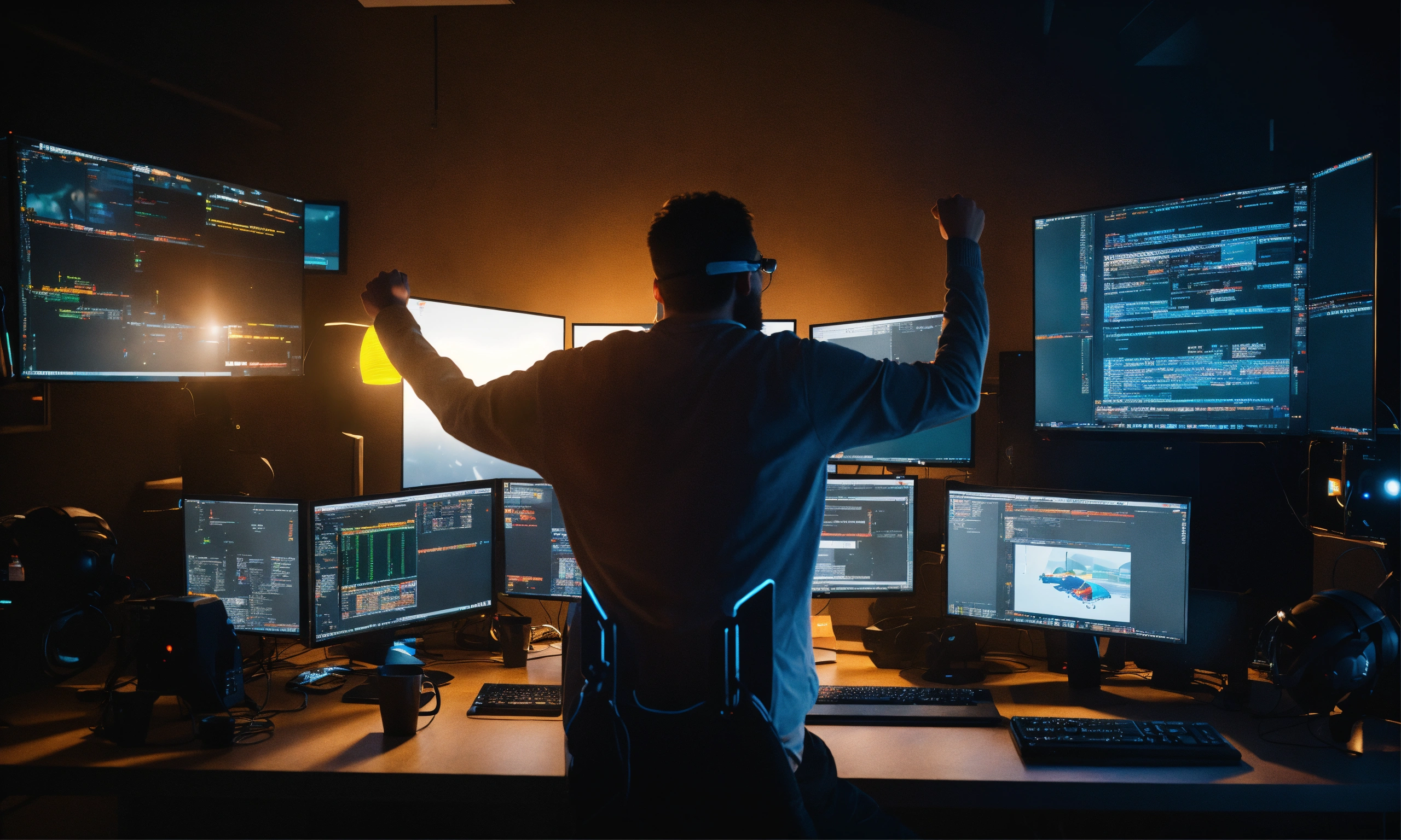 A programmer cheering at his desk, surrounded by pc monitors, in a dark room, illuminated by the glow of the screen, celebrating after he fixed a bug, 8k