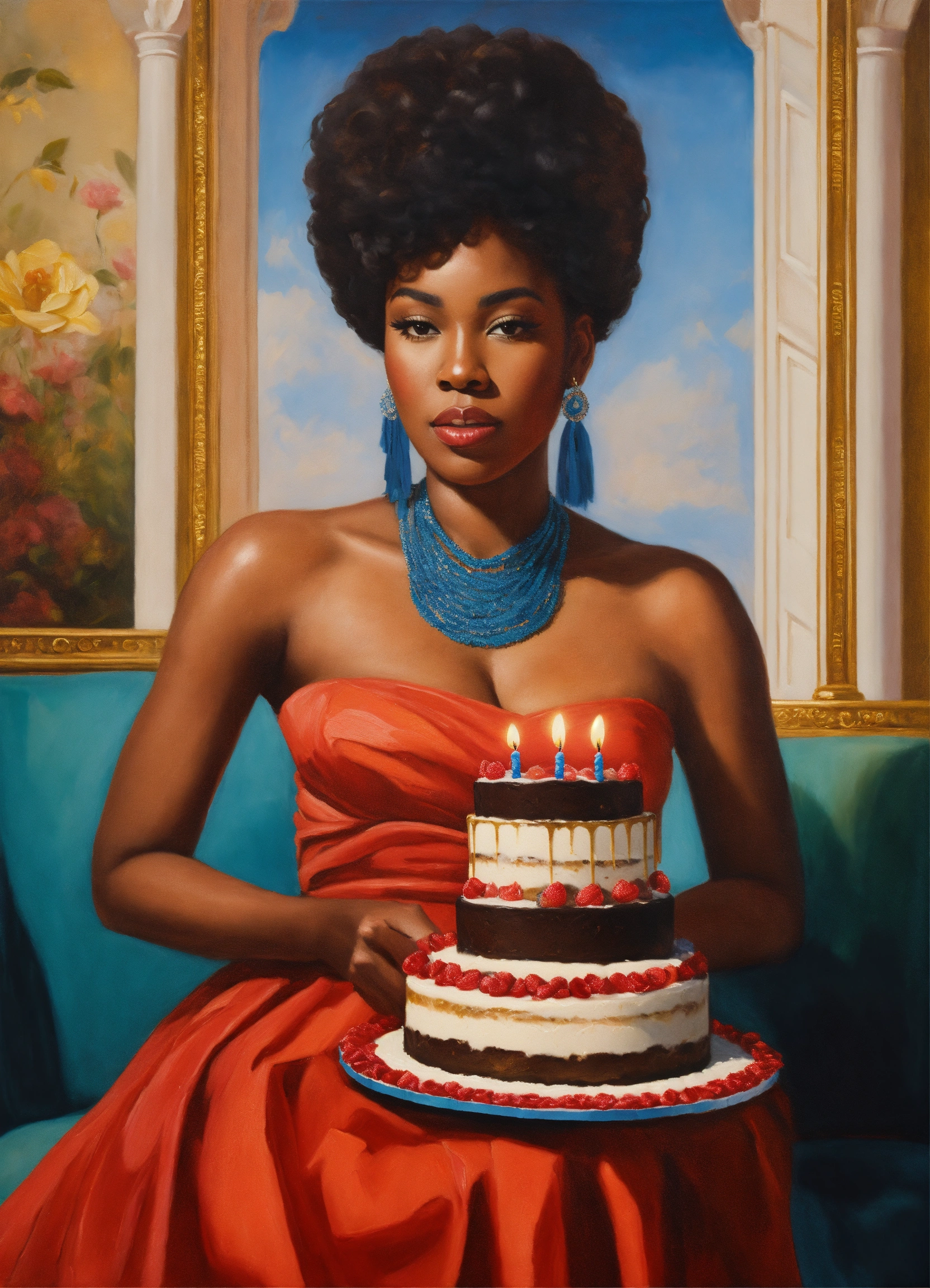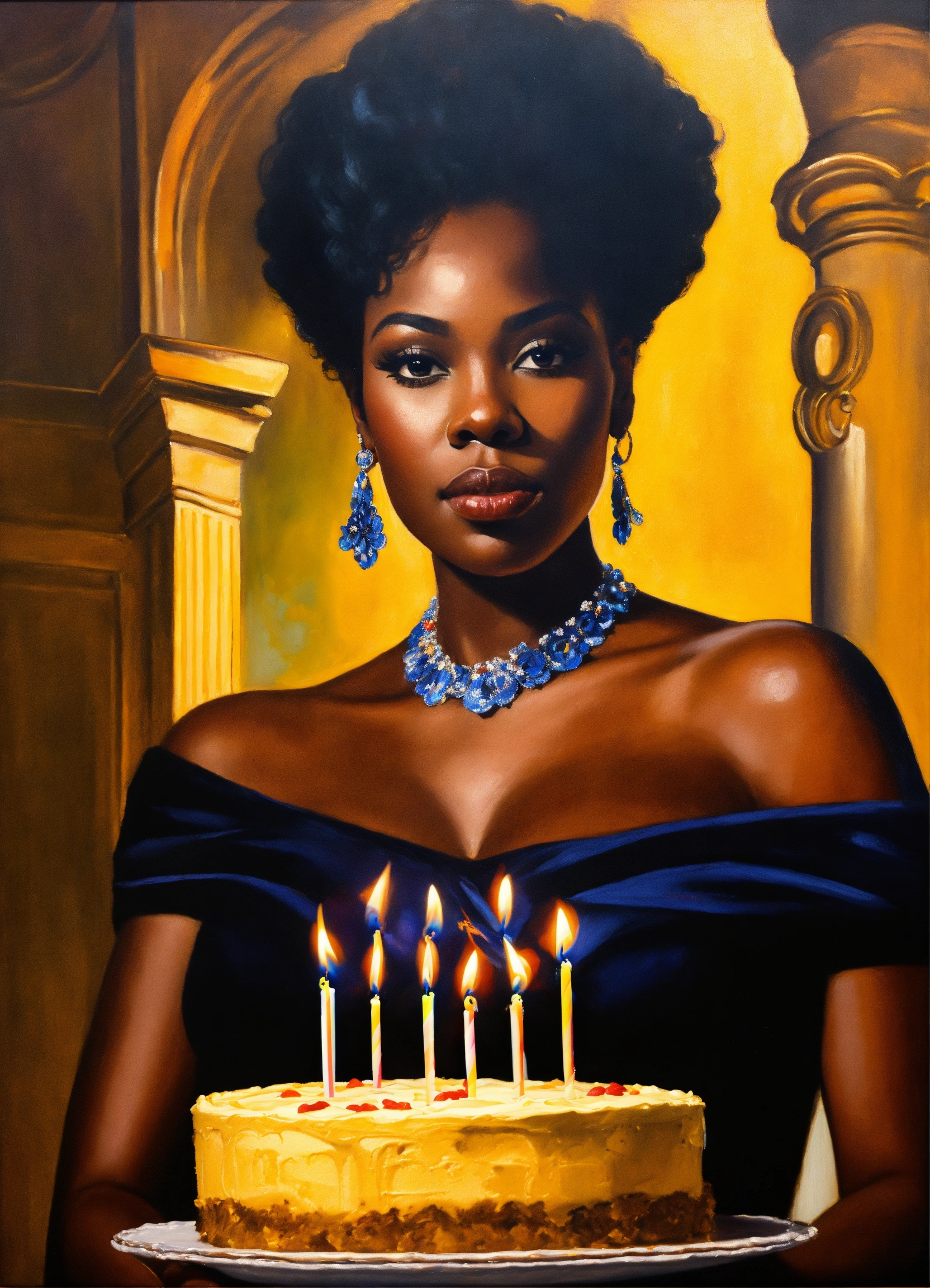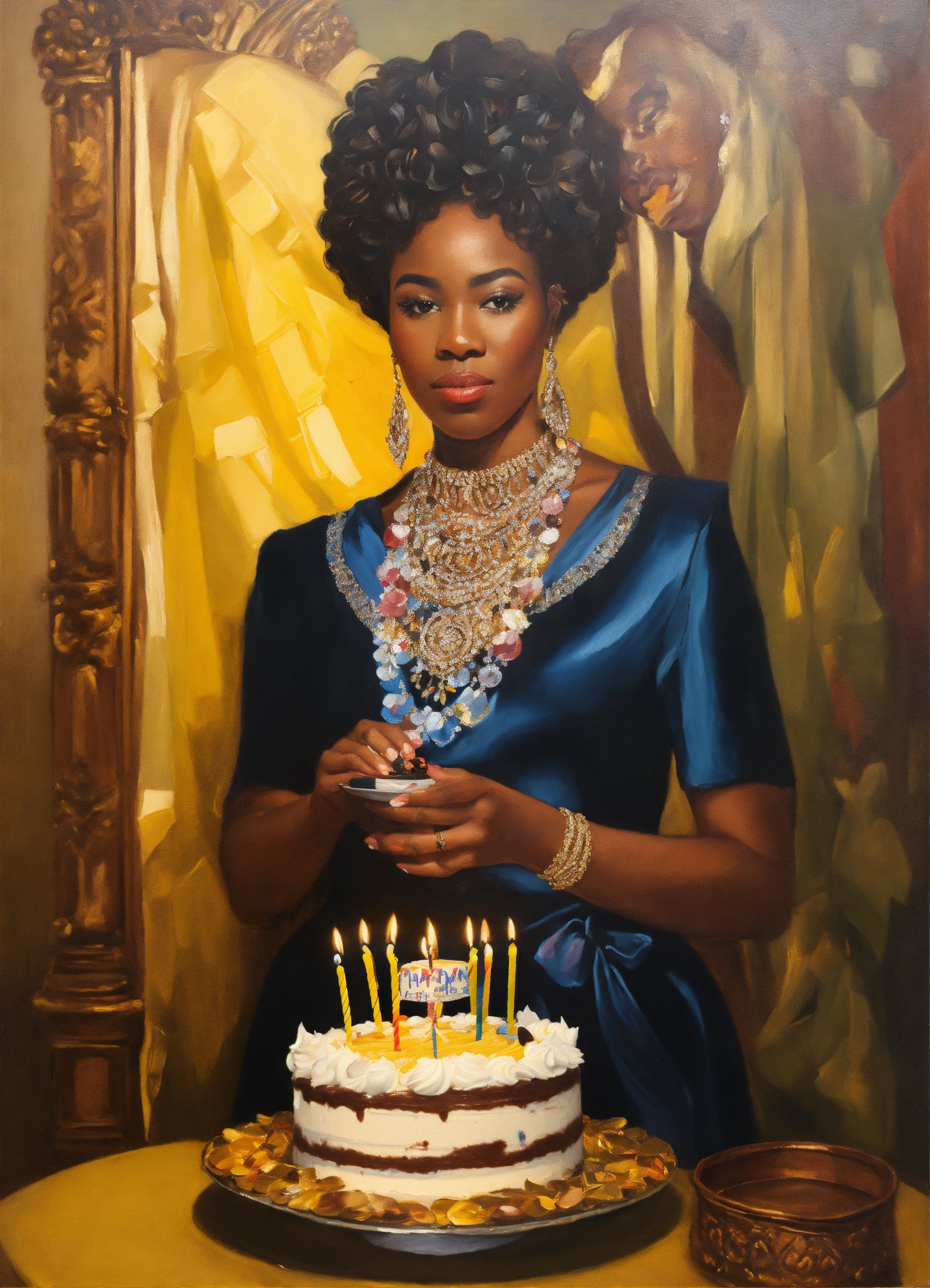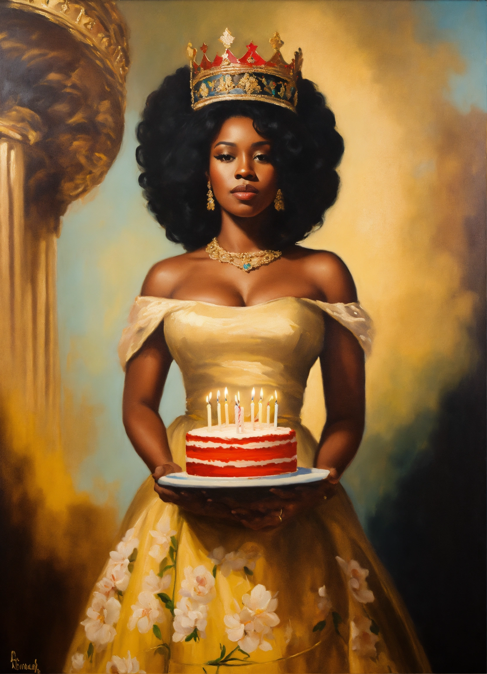 An oil painting of a beautiful black american queen holding a birthday cake for a king