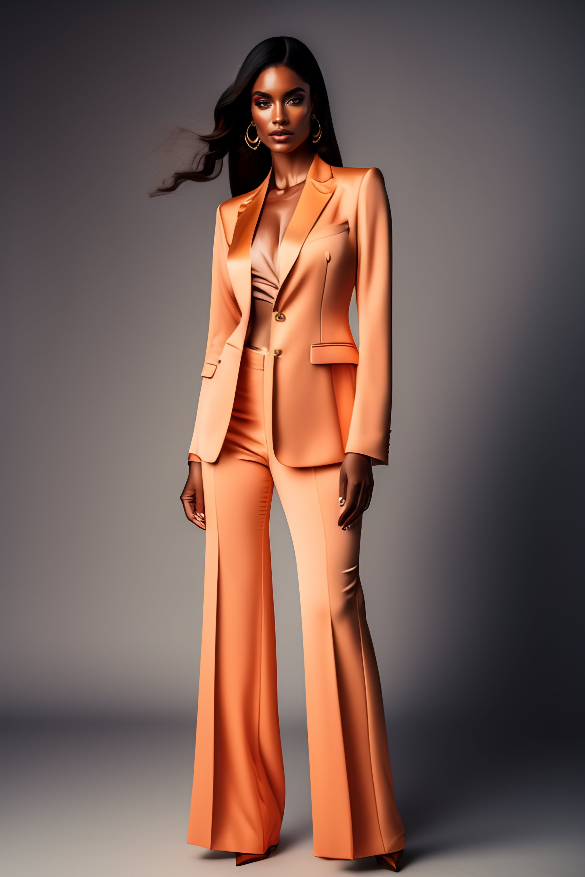 Studio portrait of spanish beautiful model wearing pants suits outfit, full body, 100% real, natural light, studio background, fashion magazine, hyper realistic, ultra-detailed, no filter, depth of field, fashion, iso 400, photorealistic, 8k