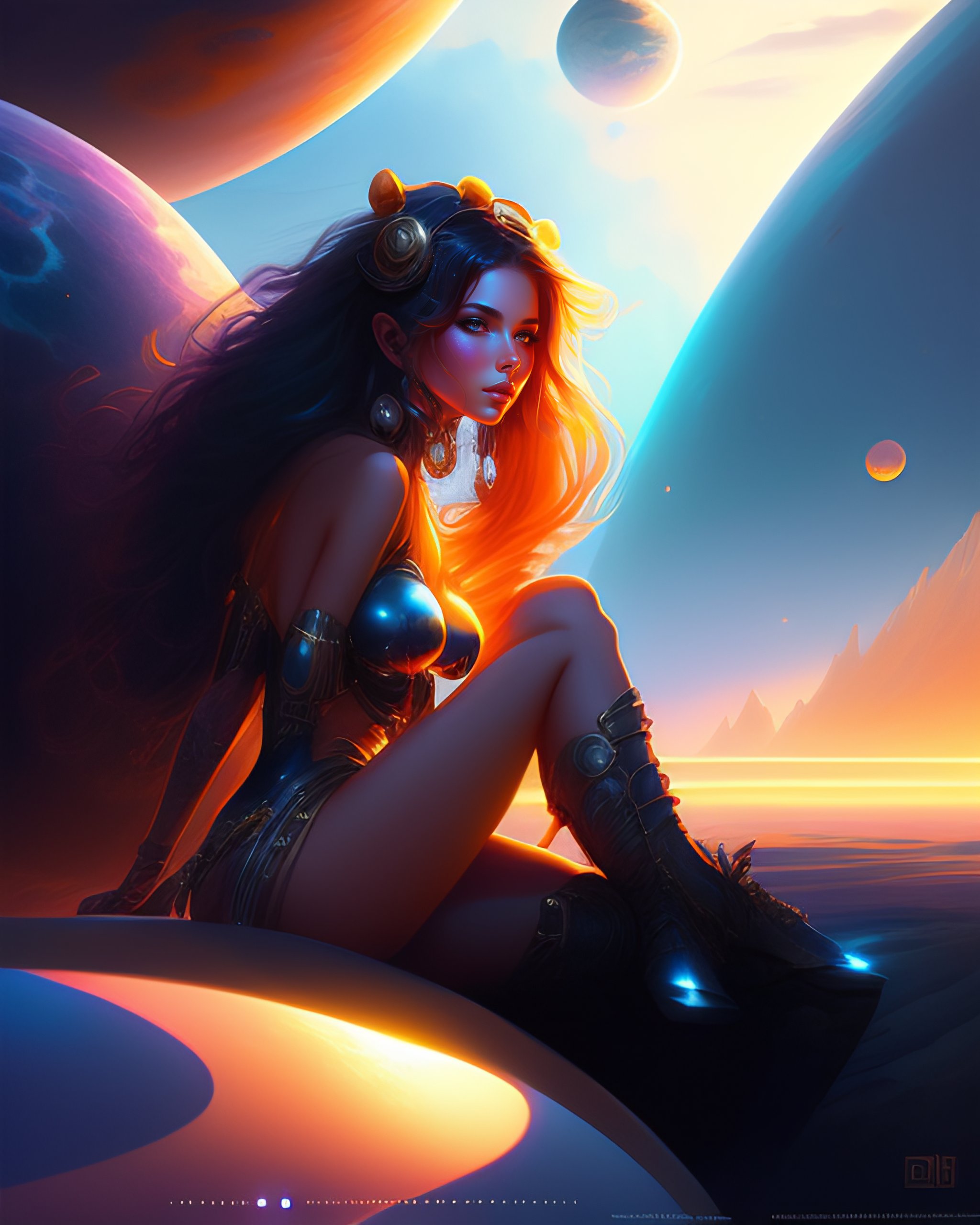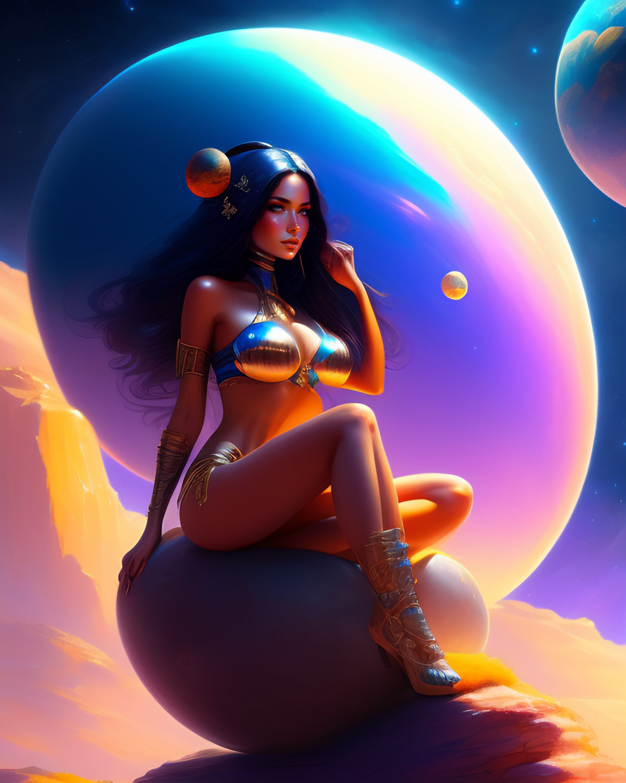 Beauty emo girl with bikini sitting on a little futuristic planet, deep space background, by justin gerard and greg rutkowski, digital art, realistic painting, trending on artstation, vibrant colors