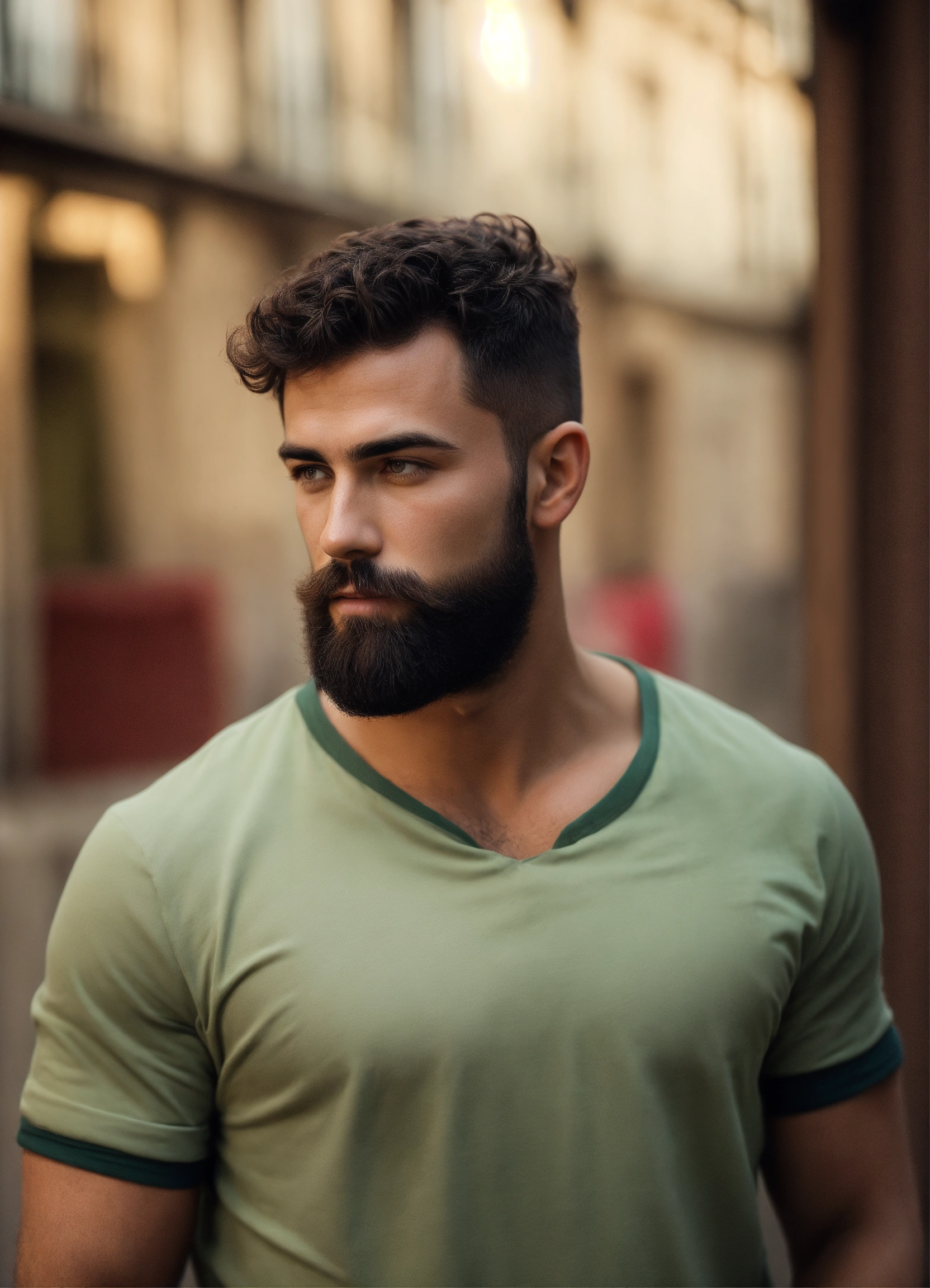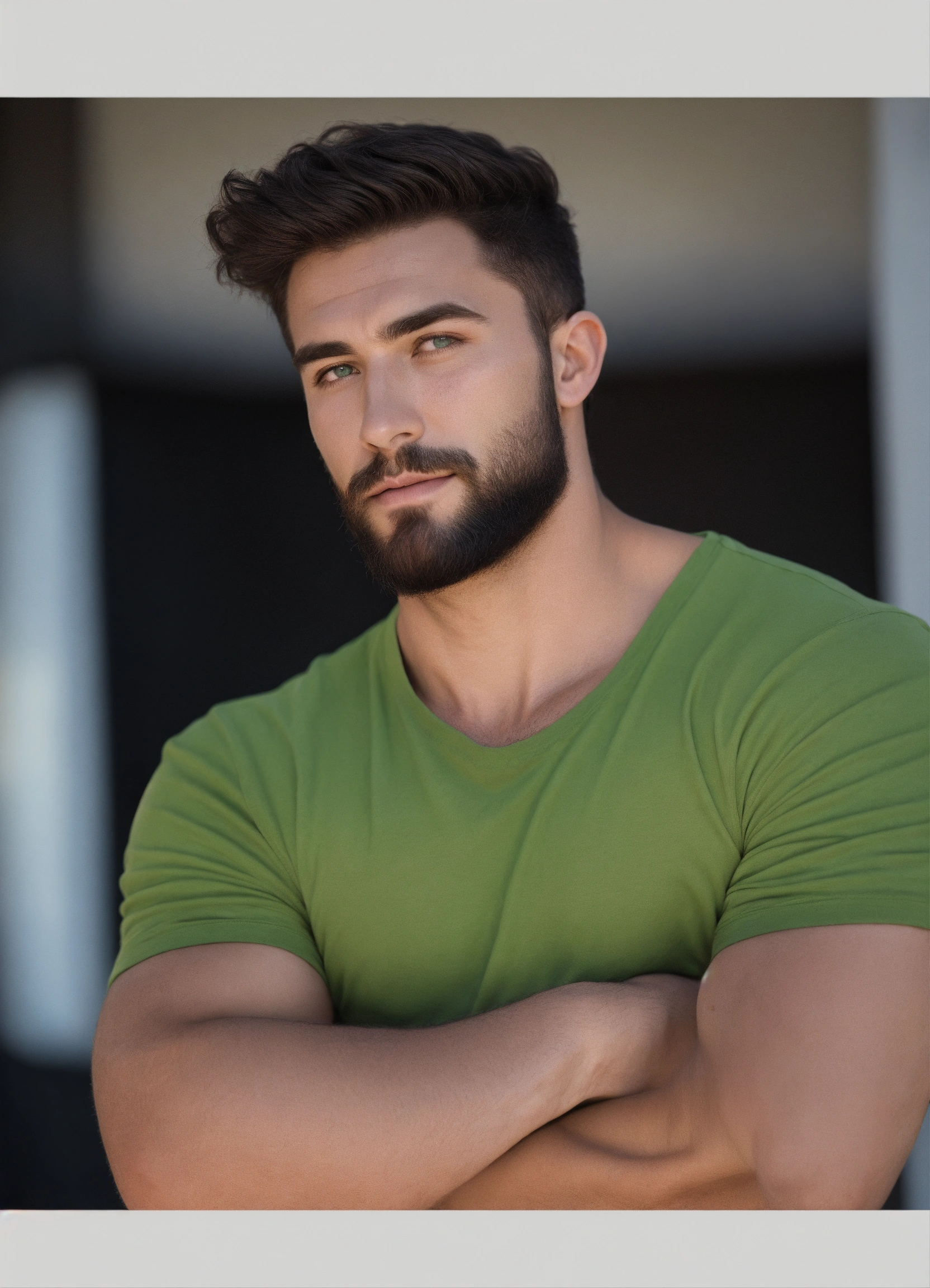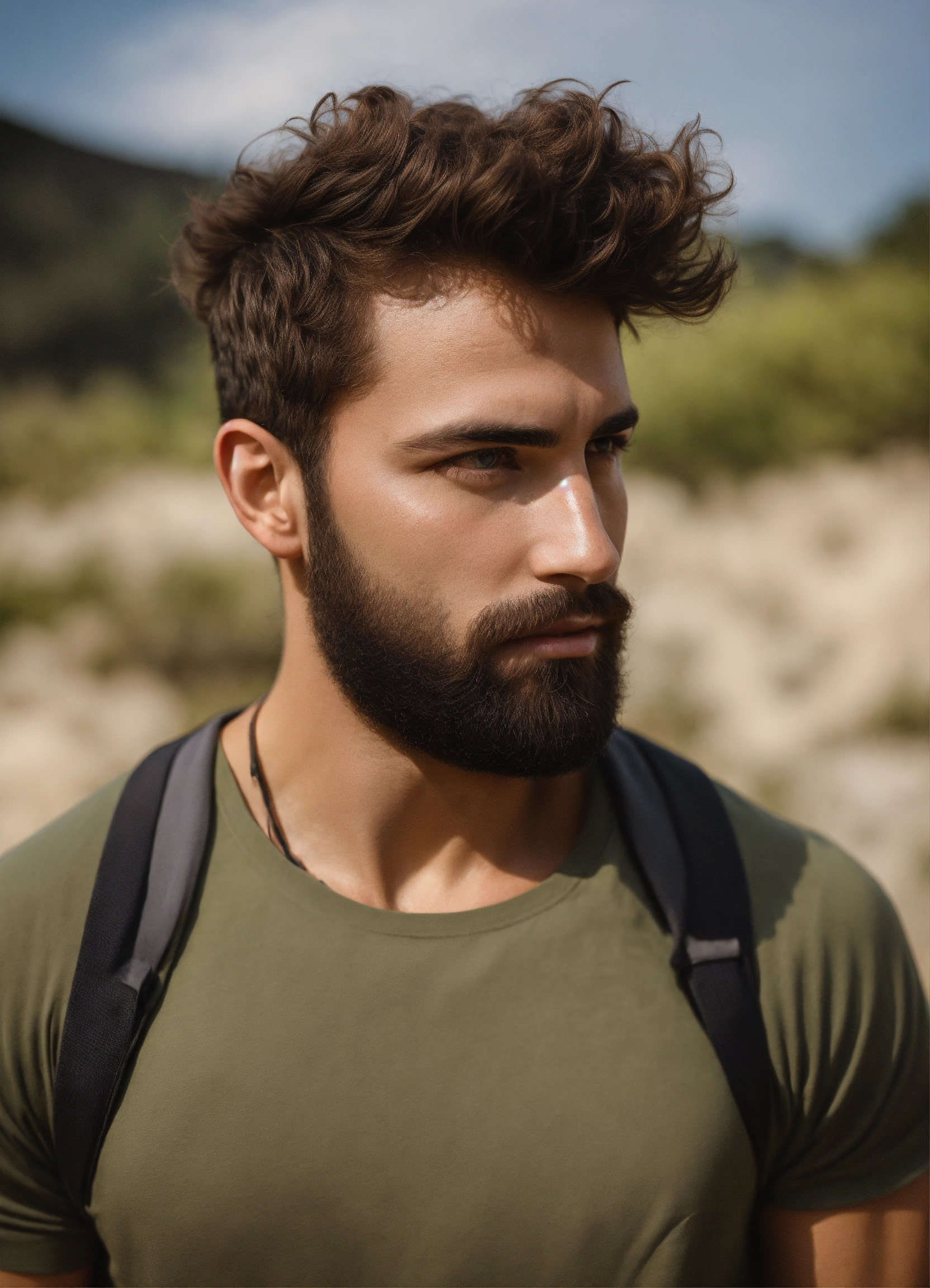 Homme humain très grand, air sauvage, blanc de peau, cheveux brun, yeux vert avec une barbe courte épaisse, sourcils épais. très carrée d'épaule et extrêmement musclé. habillé avec des vêtement tendu près à se déchirer. avec des dents et des ongles acérés. présence intimidante. posture prédatrice