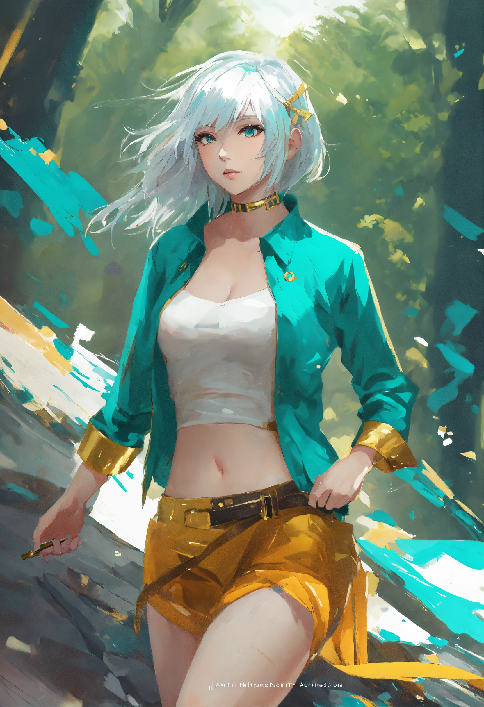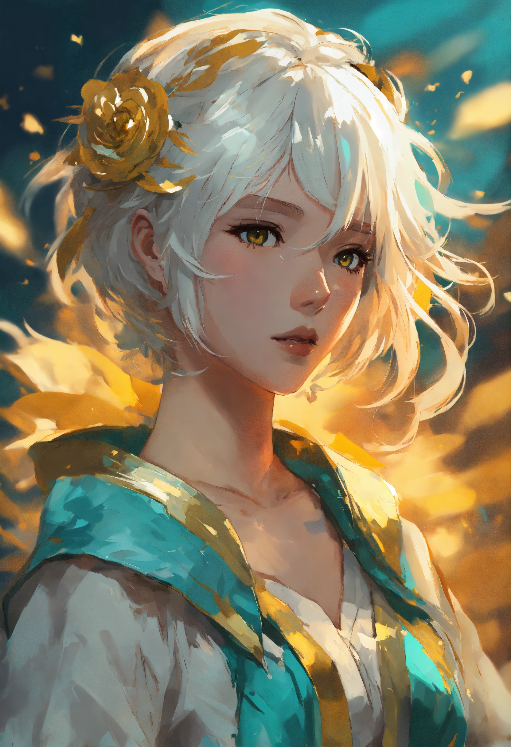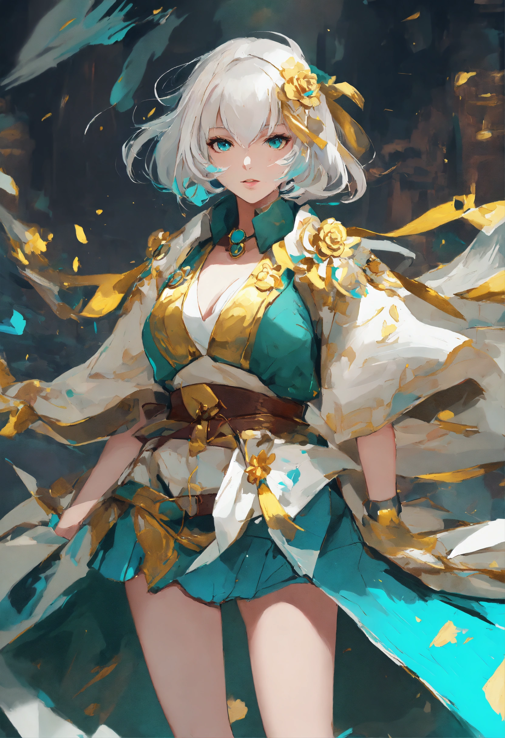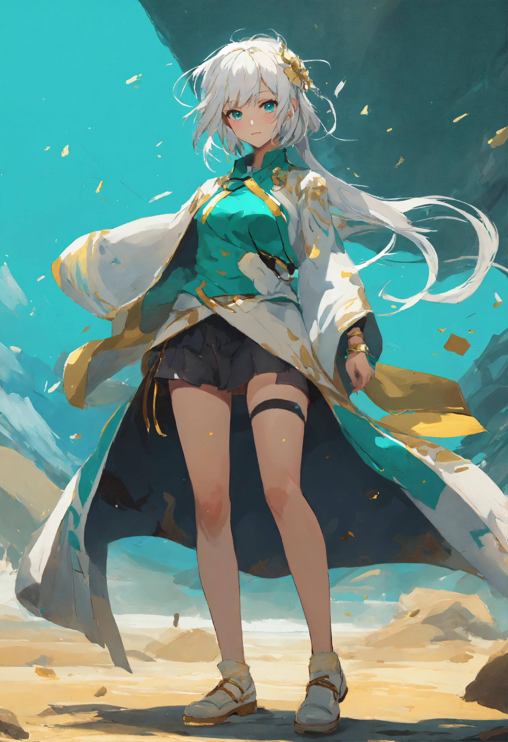 Anime girl painting, white hair clothings of turquoise and gold, heavy use palette knives, full body image, moving pose wide shot, art by ash hellbender, anime-spektrum 37 on artstation, simple backround