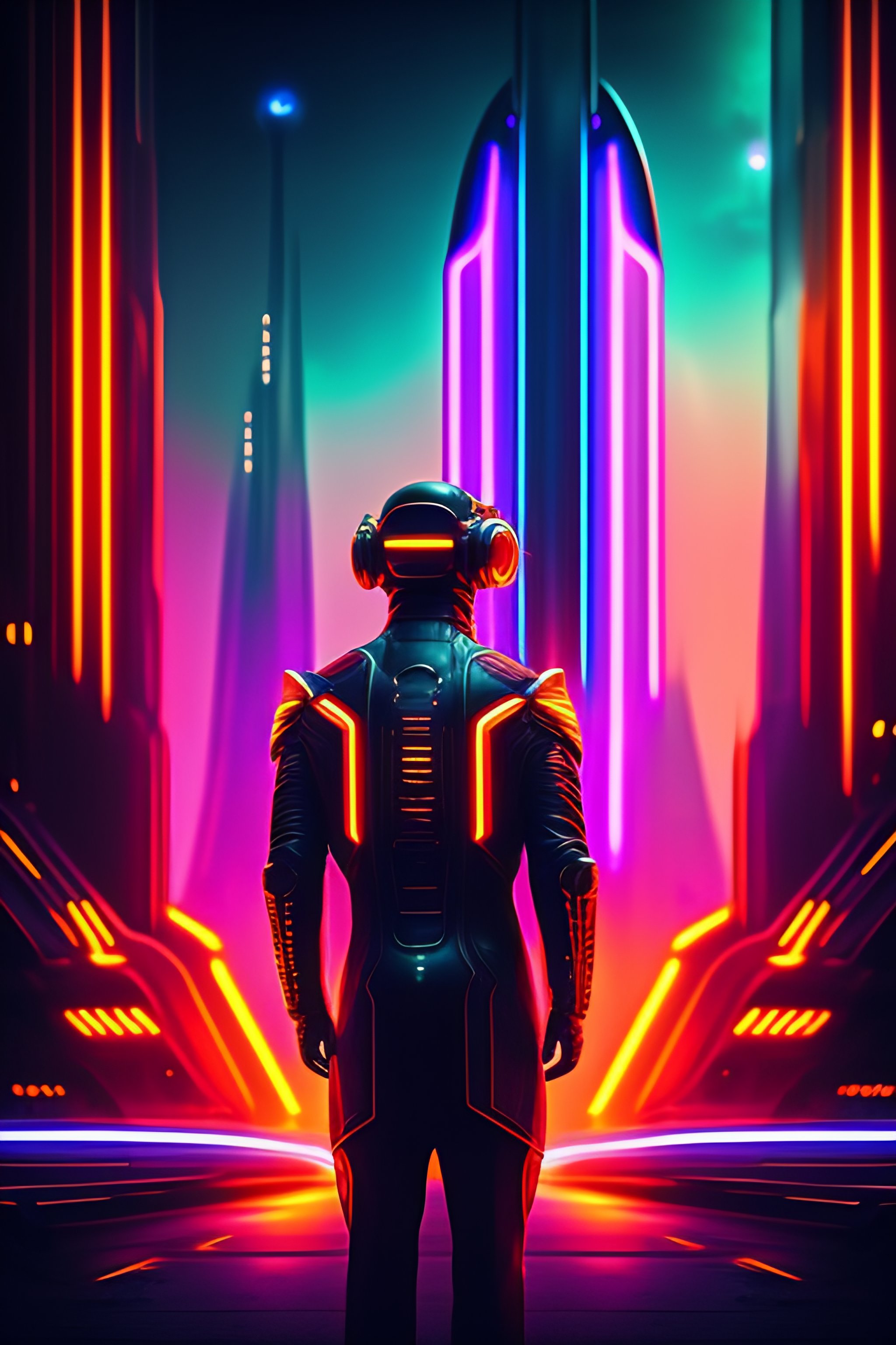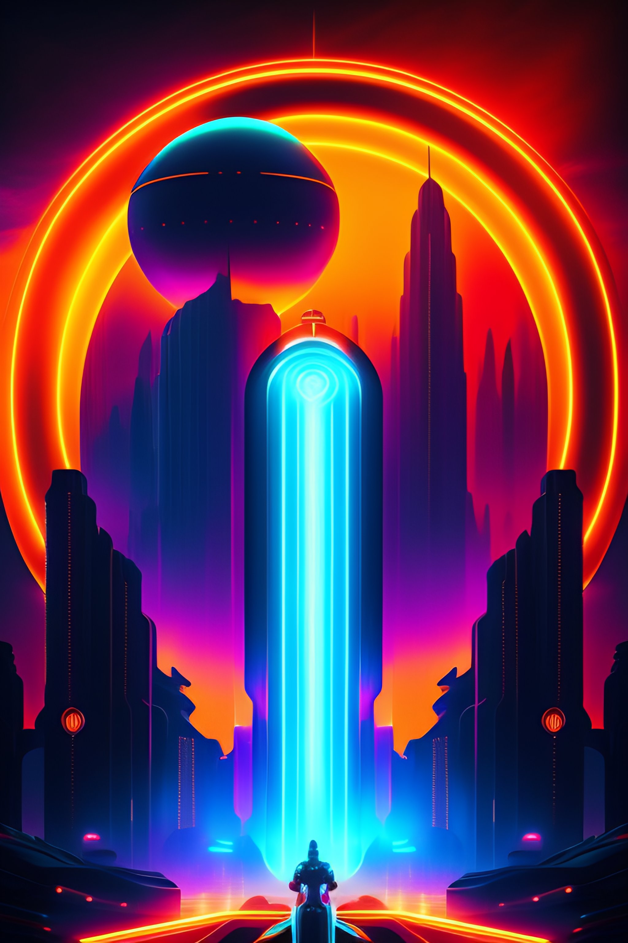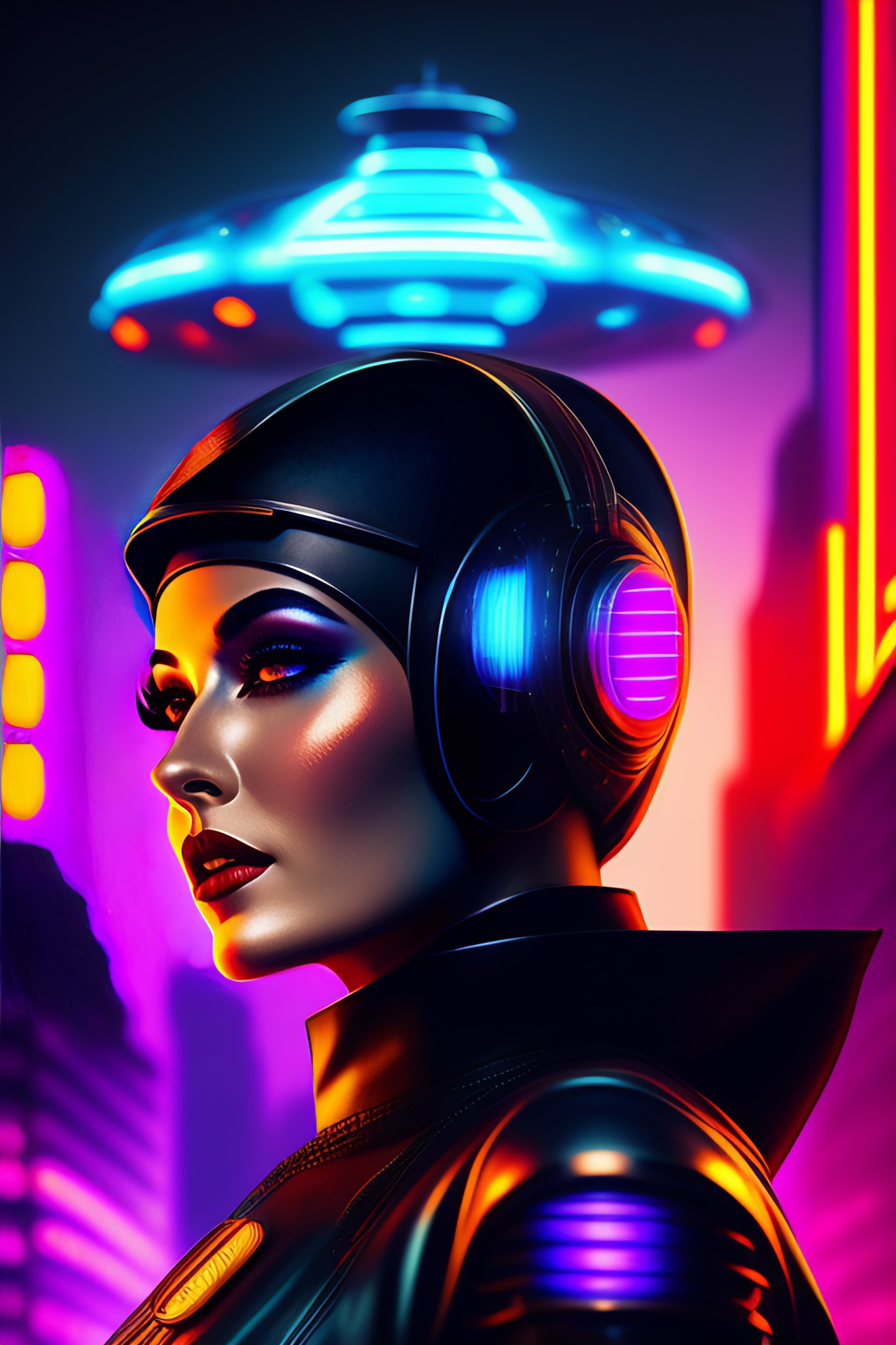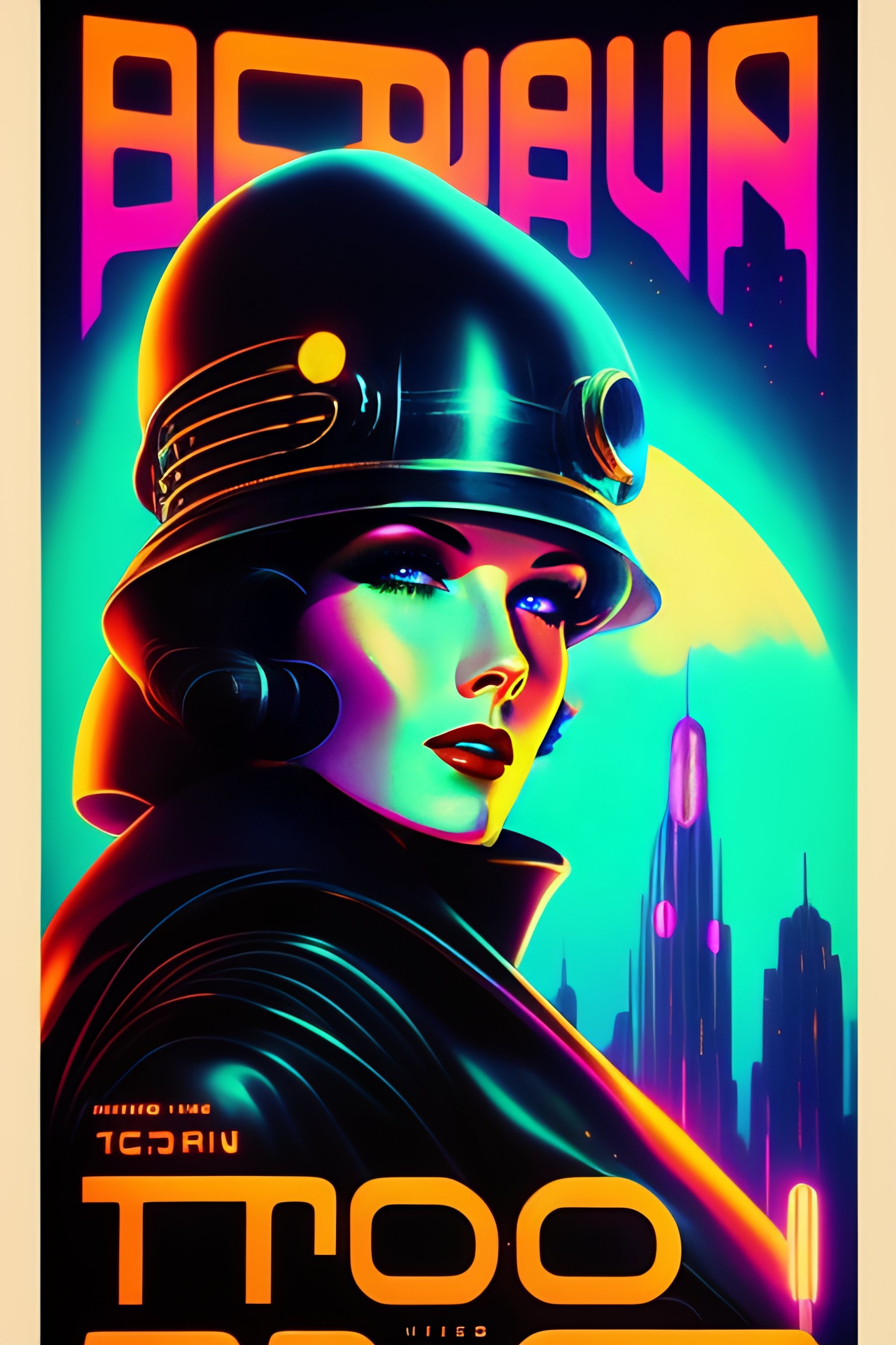 Medium shot 1920's vintage futuristic poster with cyberpunk, alien being, ufos in the background, "tron" movie aesthetic, with a cyberpunk city background, futuristic lighting, cinematic lighting, cozy lighting, 8k, 1800's vintage movie poster, its other planet